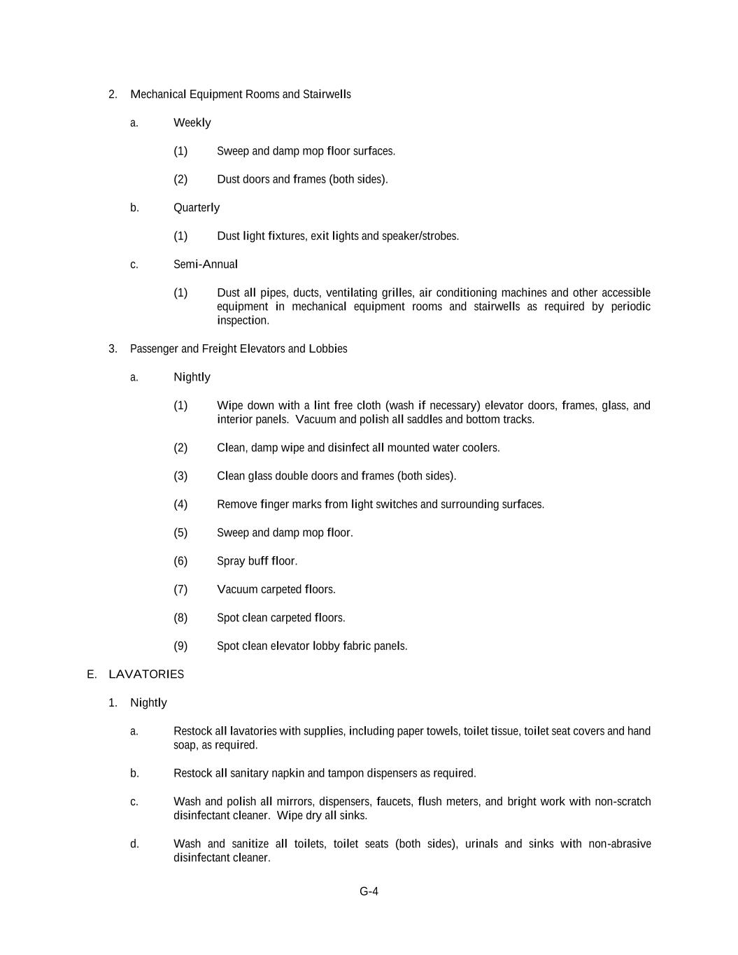 G-4 2. Mechanical Equipment Rooms and Stairwells a. Weekly (1) Sweep and damp mop floor surfaces. (2) Dust doors and frames (both sides). b. Quarterly (1) Dust light fixtures, exit lights and speaker/strobes. c. Semi-Annual (1) Dust all pipes, ducts, ventilating grilles, air conditioning machines and other accessible equipment in mechanical equipment rooms and stairwells as required by periodic inspection. 3. Passenger and Freight Elevators and Lobbies a. Nightly (1) Wipe down with a lint free cloth (wash if necessary) elevator doors, frames, glass, and interior panels. Vacuum and polish all saddles and bottom tracks. (2) Clean, damp wipe and disinfect all mounted water coolers. (3) Clean glass double doors and frames (both sides). (4) Remove finger marks from light switches and surrounding surfaces. (5) Sweep and damp mop floor. (6) Spray buff floor. (7) Vacuum carpeted floors. (8) Spot clean carpeted floors. (9) Spot clean elevator lobby fabric panels. E. LAVATORIES 1. Nightly a. Restock all lavatories with supplies, including paper towels, toilet tissue, toilet seat covers and hand soap, as required. b. Restock all sanitary napkin and tampon dispensers as required. c. Wash and polish all mirrors, dispensers, faucets, flush meters, and bright work with non-scratch disinfectant cleaner. Wipe dry all sinks. d. Wash and sanitize all toilets, toilet seats (both sides), urinals and sinks with non-abrasive disinfectant cleaner.
