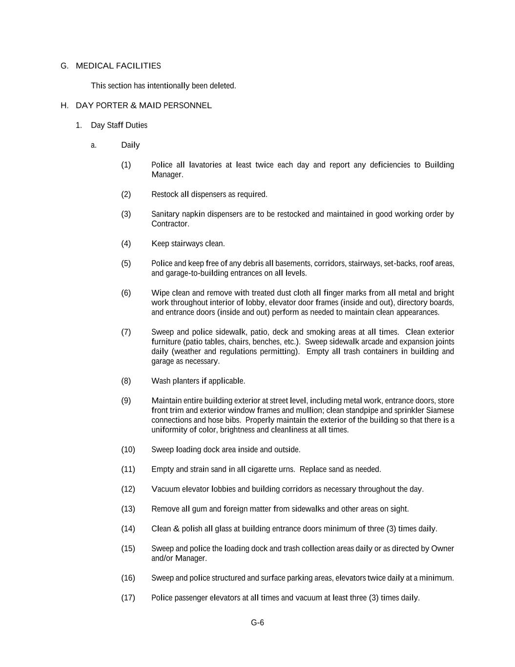 G-6 G. MEDICAL FACILITIES This section has intentionally been deleted. H. DAY PORTER & MAID PERSONNEL 1. Day Staff Duties a. Daily (1) Police all lavatories at least twice each day and report any deficiencies to Building Manager. (2) Restock all dispensers as required. (3) Sanitary napkin dispensers are to be restocked and maintained in good working order by Contractor. (4) Keep stairways clean. (5) Police and keep free of any debris all basements, corridors, stairways, set-backs, roof areas, and garage-to-building entrances on all levels. (6) Wipe clean and remove with treated dust cloth all finger marks from all metal and bright work throughout interior of lobby, elevator door frames (inside and out), directory boards, and entrance doors (inside and out) perform as needed to maintain clean appearances. (7) Sweep and police sidewalk, patio, deck and smoking areas at all times. Clean exterior furniture (patio tables, chairs, benches, etc.). Sweep sidewalk arcade and expansion joints daily (weather and regulations permitting). Empty all trash containers in building and garage as necessary. (8) Wash planters if applicable. (9) Maintain entire building exterior at street level, including metal work, entrance doors, store front trim and exterior window frames and mullion; clean standpipe and sprinkler Siamese connections and hose bibs. Properly maintain the exterior of the building so that there is a uniformity of color, brightness and cleanliness at all times. (10) Sweep loading dock area inside and outside. (11) Empty and strain sand in all cigarette urns. Replace sand as needed. (12) Vacuum elevator lobbies and building corridors as necessary throughout the day. (13) Remove all gum and foreign matter from sidewalks and other areas on sight. (14) Clean & polish all glass at building entrance doors minimum of three (3) times daily. (15) Sweep and police the loading dock and trash collection areas daily or as directed by Owner and/or Manager. (16) Sweep and police structured and surface parking areas, elevators twice daily at a minimum. (17) Police passenger elevators at all times and vacuum at least three (3) times daily.
