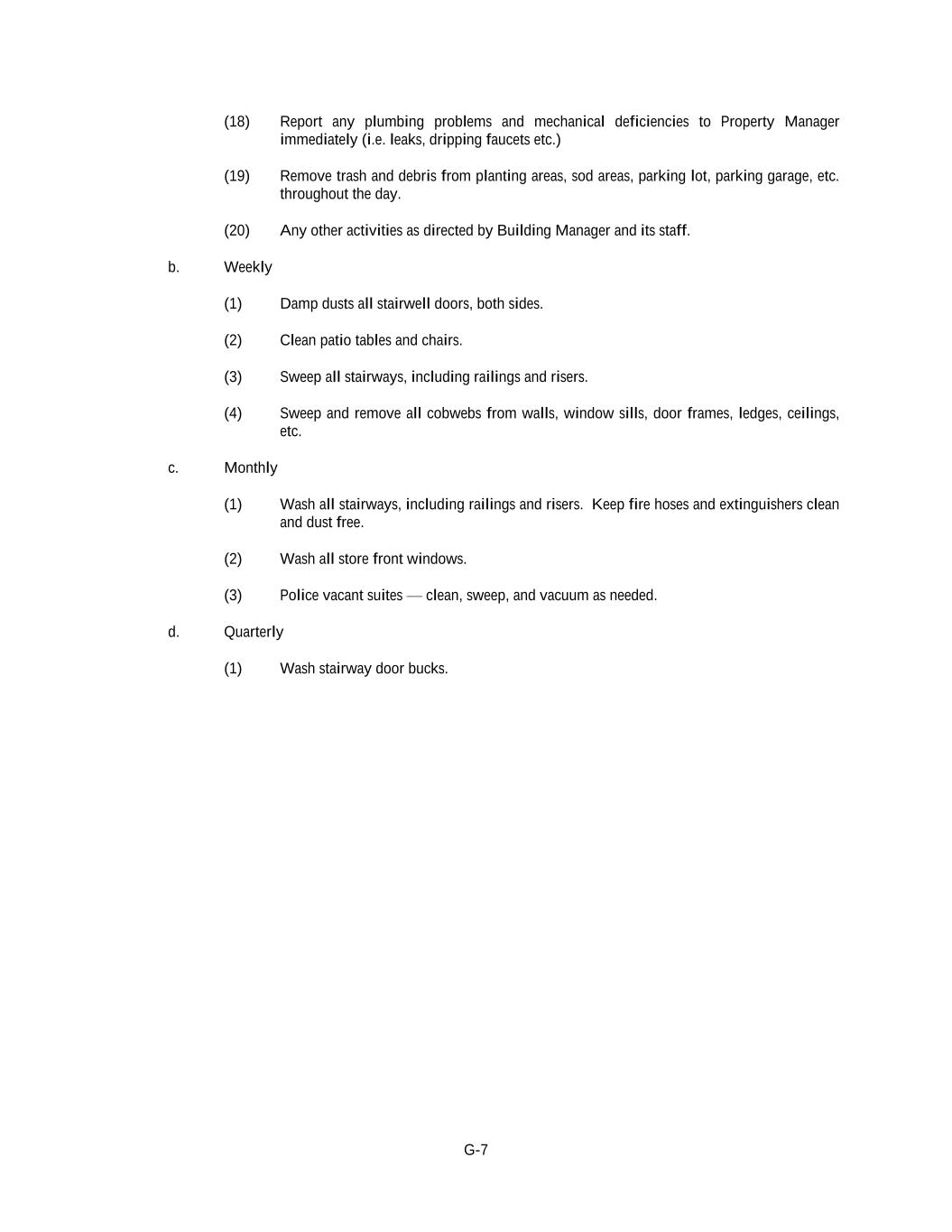 G-7 (18) Report any plumbing problems and mechanical deficiencies to Property Manager immediately (i.e. leaks, dripping faucets etc.) (19) Remove trash and debris from planting areas, sod areas, parking lot, parking garage, etc. throughout the day. (20) Any other activities as directed by Building Manager and its staff. b. Weekly (1) Damp dusts all stairwell doors, both sides. (2) Clean patio tables and chairs. (3) Sweep all stairways, including railings and risers. (4) Sweep and remove all cobwebs from walls, window sills, door frames, ledges, ceilings, etc. c. Monthly (1) Wash all stairways, including railings and risers. Keep fire hoses and extinguishers clean and dust free. (2) Wash all store front windows. (3) Police vacant suites — clean, sweep, and vacuum as needed. d. Quarterly (1) Wash stairway door bucks.