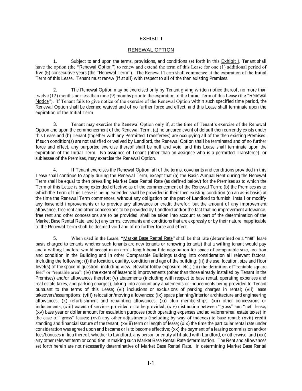 I-1 EXHIBIT I RENEWAL OPTION 1. Subject to and upon the terms, provisions, and conditions set forth in this Exhibit I, Tenant shall have the option (the “Renewal Option”) to renew and extend the term of this Lease for one (1) additional period of five (5) consecutive years (the “Renewal Term”). The Renewal Term shall commence at the expiration of the Initial Term of this Lease. Tenant must renew (if at all) with respect to all of the then existing Premises. 2. The Renewal Option may be exercised only by Tenant giving written notice thereof, no more than twelve (12) months nor less than nine (9) months prior to the expiration of the Initial Term of this Lease (the “Renewal Notice”). If Tenant fails to give notice of the exercise of the Renewal Option within such specified time period, the Renewal Option shall be deemed waived and of no further force and effect, and this Lease shall terminate upon the expiration of the Initial Term. 3. Tenant may exercise the Renewal Option only if, at the time of Tenant’s exercise of the Renewal Option and upon the commencement of the Renewal Term, (a) no uncured event of default then currently exists under this Lease and (b) Tenant (together with any Permitted Transferees) are occupying all of the then existing Premises. If such condition(s) are not satisfied or waived by Landlord, the Renewal Option shall be terminated and of no further force and effect, any purported exercise thereof shall be null and void, and this Lease shall terminate upon the expiration of the Initial Term. No assignee of Tenant (other than an assignee who is a permitted Transferee), or sublessee of the Premises, may exercise the Renewal Option. 4. If Tenant exercises the Renewal Option, all of the terms, covenants and conditions provided in this Lease shall continue to apply during the Renewal Term, except that (a) the Basic Annual Rent during the Renewal Term shall be equal to then prevailing Market Base Rental Rate (as defined below) for the Premises as to which the Term of this Lease is being extended effective as of the commencement of the Renewal Term; (b) the Premises as to which the Term of this Lease is being extended shall be provided in their then existing condition (on an as-is basis) at the time the Renewal Term commences, without any obligation on the part of Landlord to furnish, install or modify any leasehold improvements or to provide any allowance or credit therefor; but the amount of any improvement allowance, free rent and other concessions to be provided by Landlord and/or the fact that no improvement allowance, free rent and other concessions are to be provided, shall be taken into account as part of the determination of the Market Base Rental Rate, and (c) any terms, covenants and conditions that are expressly or by their nature inapplicable to the Renewal Term shall be deemed void and of no further force and effect. 5. When used in the Lease, “Market Base Rental Rate” shall be that rate (determined on a “net” lease basis charged to tenants whether such tenants are new tenants or renewing tenants) that a willing tenant would pay and a willing landlord would accept in an arm’s length bona fide negotiation for space of comparable size, location and condition in the Building and in other Comparable Buildings taking into consideration all relevant factors, including the following: (i) the location, quality, condition and age of the building; (ii) the use, location, size and floor level(s) of the space in question, including view, elevator lobby exposure, etc.; (iii) the definition of “rentable square feet” or “rentable area”; (iv) the extent of leasehold improvements (other than those already installed by Tenant in the Premises) and/or allowances therefor; (v) abatements (including with respect to base rental, operating expenses and real estate taxes, and parking charges), taking into account any abatements or inducements being provided to Tenant pursuant to the terms of this Lease; (vi) inclusions or exclusions of parking charges in rental; (vii) lease takeovers/assumptions; (viii) relocation/moving allowances; (ix) space planning/interior architecture and engineering allowances; (x) refurbishment and repainting allowances; (xi) club memberships; (xii) other concessions or inducements; (xiii) extent of services provided or to be provided; (xiv) distinction between “gross” and “net” lease; (xv) base year or dollar amount for escalation purposes (both operating expenses and ad valorem/real estate taxes) in the case of “gross” leases; (xvi) any other adjustments (including by way of indexes) to base rental; (xvii) credit standing and financial stature of the tenant; (xviii) term or length of lease; (xix) the time the particular rental rate under consideration was agreed upon and became or is to become effective; (xx) the payment of a leasing commission and/or fees/bonuses in lieu thereof, whether to Landlord, any person or entity affiliated with Landlord, or otherwise; and (xxi) any other relevant term or condition in making such Market Base Rental Rate determination. The Rent and allowances set forth herein are not necessarily determinative of Market Base Rental Rate. In determining Market Base Rental