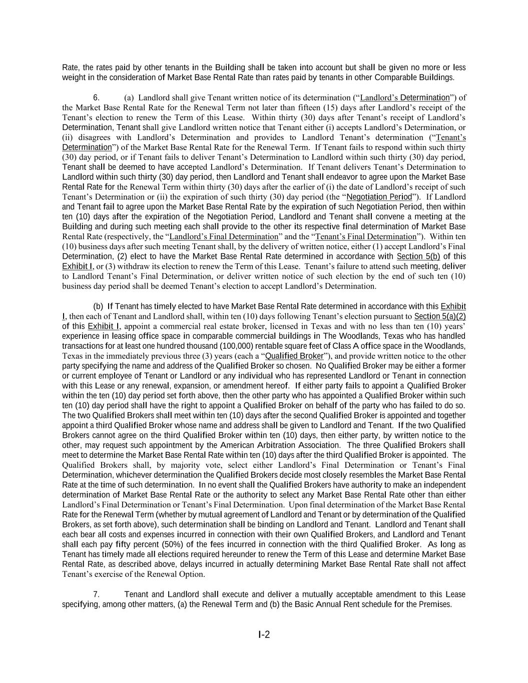 I-2 Rate, the rates paid by other tenants in the Building shall be taken into account but shall be given no more or less weight in the consideration of Market Base Rental Rate than rates paid by tenants in other Comparable Buildings. 6. (a) Landlord shall give Tenant written notice of its determination (“Landlord’s Determination”) of the Market Base Rental Rate for the Renewal Term not later than fifteen (15) days after Landlord’s receipt of the Tenant’s election to renew the Term of this Lease. Within thirty (30) days after Tenant’s receipt of Landlord’s Determination, Tenant shall give Landlord written notice that Tenant either (i) accepts Landlord’s Determination, or (ii) disagrees with Landlord’s Determination and provides to Landlord Tenant’s determination (“Tenant’s Determination”) of the Market Base Rental Rate for the Renewal Term. If Tenant fails to respond within such thirty (30) day period, or if Tenant fails to deliver Tenant’s Determination to Landlord within such thirty (30) day period, Tenant shall be deemed to have accepted Landlord’s Determination. If Tenant delivers Tenant’s Determination to Landlord within such thirty (30) day period, then Landlord and Tenant shall endeavor to agree upon the Market Base Rental Rate for the Renewal Term within thirty (30) days after the earlier of (i) the date of Landlord’s receipt of such Tenant’s Determination or (ii) the expiration of such thirty (30) day period (the “Negotiation Period”). If Landlord and Tenant fail to agree upon the Market Base Rental Rate by the expiration of such Negotiation Period, then within ten (10) days after the expiration of the Negotiation Period, Landlord and Tenant shall convene a meeting at the Building and during such meeting each shall provide to the other its respective final determination of Market Base Rental Rate (respectively, the “Landlord’s Final Determination” and the “Tenant’s Final Determination”). Within ten (10) business days after such meeting Tenant shall, by the delivery of written notice, either (1) accept Landlord’s Final Determination, (2) elect to have the Market Base Rental Rate determined in accordance with Section 5(b) of this Exhibit I, or (3) withdraw its election to renew the Term of this Lease. Tenant’s failure to attend such meeting, deliver to Landlord Tenant’s Final Determination, or deliver written notice of such election by the end of such ten (10) business day period shall be deemed Tenant’s election to accept Landlord’s Determination. (b) If Tenant has timely elected to have Market Base Rental Rate determined in accordance with this Exhibit I, then each of Tenant and Landlord shall, within ten (10) days following Tenant’s election pursuant to Section 5(a)(2) of this Exhibit I, appoint a commercial real estate broker, licensed in Texas and with no less than ten (10) years’ experience in leasing office space in comparable commercial buildings in The Woodlands, Texas who has handled transactions for at least one hundred thousand (100,000) rentable square feet of Class A office space in the Woodlands, Texas in the immediately previous three (3) years (each a “Qualified Broker”), and provide written notice to the other party specifying the name and address of the Qualified Broker so chosen. No Qualified Broker may be either a former or current employee of Tenant or Landlord or any individual who has represented Landlord or Tenant in connection with this Lease or any renewal, expansion, or amendment hereof. If either party fails to appoint a Qualified Broker within the ten (10) day period set forth above, then the other party who has appointed a Qualified Broker within such ten (10) day period shall have the right to appoint a Qualified Broker on behalf of the party who has failed to do so. The two Qualified Brokers shall meet within ten (10) days after the second Qualified Broker is appointed and together appoint a third Qualified Broker whose name and address shall be given to Landlord and Tenant. If the two Qualified Brokers cannot agree on the third Qualified Broker within ten (10) days, then either party, by written notice to the other, may request such appointment by the American Arbitration Association. The three Qualified Brokers shall meet to determine the Market Base Rental Rate within ten (10) days after the third Qualified Broker is appointed. The Qualified Brokers shall, by majority vote, select either Landlord’s Final Determination or Tenant’s Final Determination, whichever determination the Qualified Brokers decide most closely resembles the Market Base Rental Rate at the time of such determination. In no event shall the Qualified Brokers have authority to make an independent determination of Market Base Rental Rate or the authority to select any Market Base Rental Rate other than either Landlord’s Final Determination or Tenant’s Final Determination. Upon final determination of the Market Base Rental Rate for the Renewal Term (whether by mutual agreement of Landlord and Tenant or by determination of the Qualified Brokers, as set forth above), such determination shall be binding on Landlord and Tenant. Landlord and Tenant shall each bear all costs and expenses incurred in connection with their own Qualified Brokers, and Landlord and Tenant shall each pay fifty percent (50%) of the fees incurred in connection with the third Qualified Broker. As long as Tenant has timely made all elections required hereunder to renew the Term of this Lease and determine Market Base Rental Rate, as described above, delays incurred in actually determining Market Base Rental Rate shall not affect Tenant’s exercise of the Renewal Option. 7. Tenant and Landlord shall execute and deliver a mutually acceptable amendment to this Lease specifying, among other matters, (a) the Renewal Term and (b) the Basic Annual Rent schedule for the Premises.