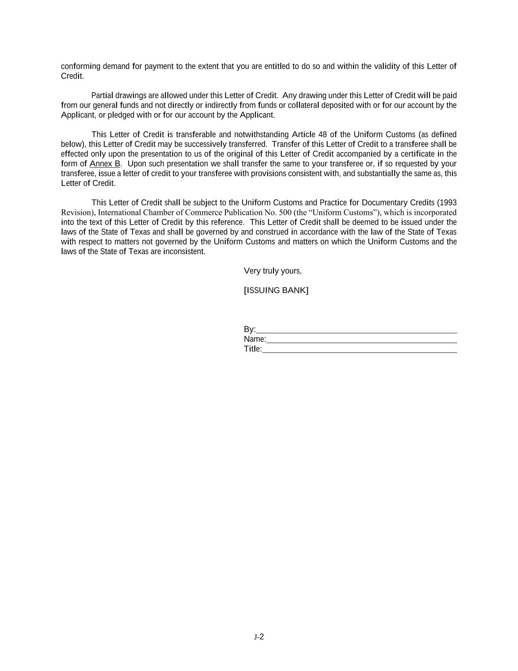 J-2 conforming demand for payment to the extent that you are entitled to do so and within the validity of this Letter of Credit. Partial drawings are allowed under this Letter of Credit. Any drawing under this Letter of Credit will be paid from our general funds and not directly or indirectly from funds or collateral deposited with or for our account by the Applicant, or pledged with or for our account by the Applicant. This Letter of Credit is transferable and notwithstanding Article 48 of the Uniform Customs (as defined below), this Letter of Credit may be successively transferred. Transfer of this Letter of Credit to a transferee shall be effected only upon the presentation to us of the original of this Letter of Credit accompanied by a certificate in the form of Annex B. Upon such presentation we shall transfer the same to your transferee or, if so requested by your transferee, issue a letter of credit to your transferee with provisions consistent with, and substantially the same as, this Letter of Credit. This Letter of Credit shall be subject to the Uniform Customs and Practice for Documentary Credits (1993 Revision), International Chamber of Commerce Publication No. 500 (the “Uniform Customs”), which is incorporated into the text of this Letter of Credit by this reference. This Letter of Credit shall be deemed to be issued under the laws of the State of Texas and shall be governed by and construed in accordance with the law of the State of Texas with respect to matters not governed by the Uniform Customs and matters on which the Uniform Customs and the laws of the State of Texas are inconsistent. Very truly yours, [ISSUING BANK] By: Name: Title:
