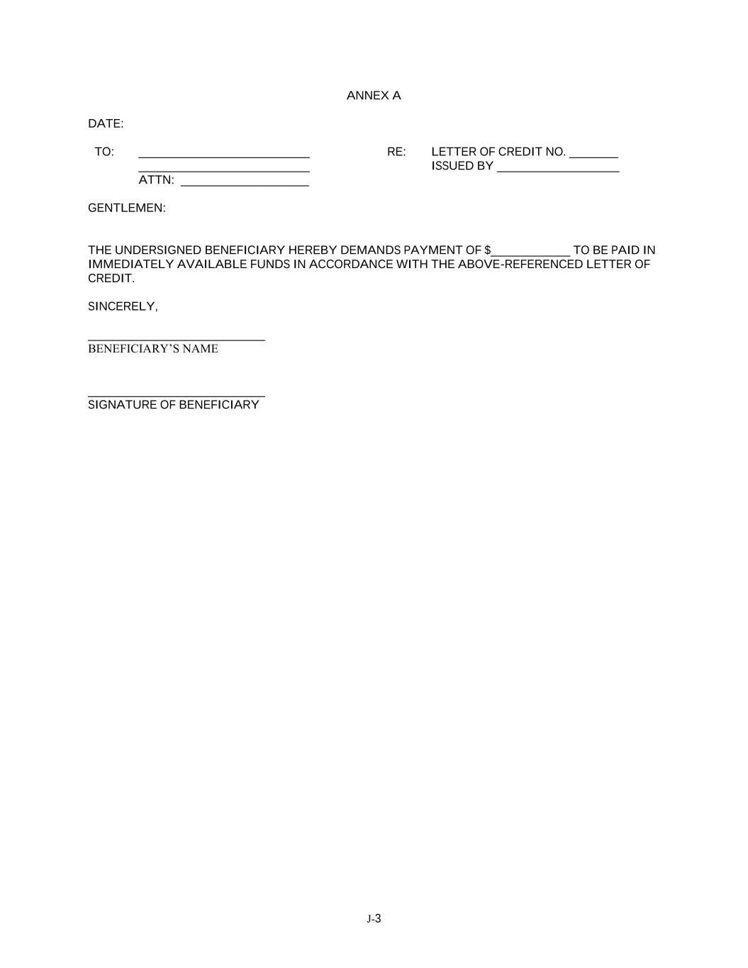 J-3 ANNEX A DATE: TO: ____________________________ ____________________________ ATTN: _____________________ RE: LETTER OF CREDIT NO. ________ ISSUED BY ____________________ GENTLEMEN: THE UNDERSIGNED BENEFICIARY HEREBY DEMANDS PAYMENT OF $_____________ TO BE PAID IN IMMEDIATELY AVAILABLE FUNDS IN ACCORDANCE WITH THE ABOVE-REFERENCED LETTER OF CREDIT. SINCERELY, _____________________________ BENEFICIARY’S NAME _____________________________ SIGNATURE OF BENEFICIARY