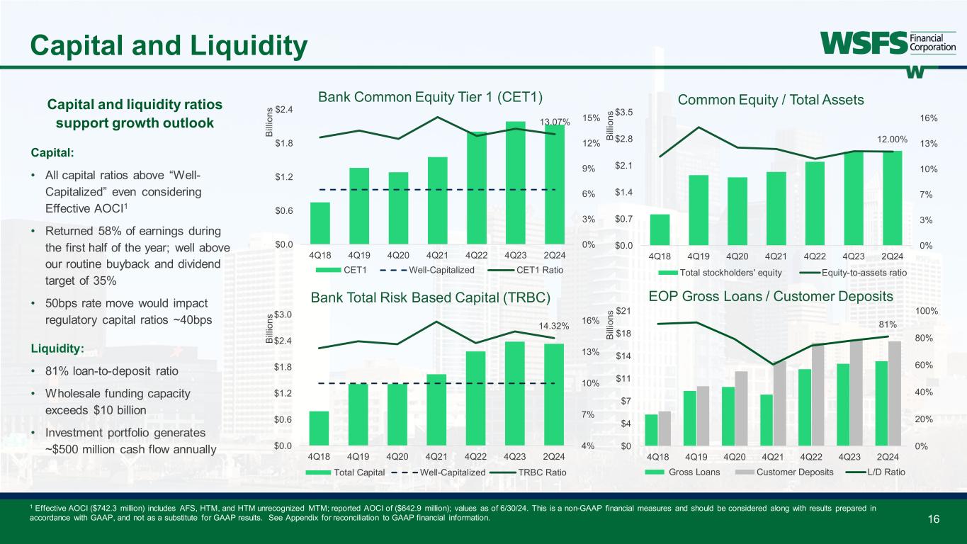 Significant franchise investments: • Technology – Salesforce© CRM, enterprise-wide data strategy, Trust Accounting System, updating payment platforms, and retail office bank account servicing • Talent – Ongoing investment with multiple key hires announced in the past 12 months Diverse customer base: • C&I loans compose 35% of gross loans • 49% of deposits from Consumer, 24% from Commercial, 13% from Small Business, and 13% from Wealth and Trust Strong balance sheet: • Capital ratios significantly above “well-capitalized” including the impact of effective AOCI2 • 1.67% ACL coverage ratio2,6 and all 22 loan concentration limits within approved levels Commitment to long-term sustainable high performance: • Core ROA ranked 78th percentile in 2022, 80th percentile in 2023, and 82nd percentile in 1H24 vs. KRX Peers1,2 • Returned 63% of earnings over the past five calendar years and 58% in 1H24 through buybacks and dividends Differentiated fee revenue3: • 32% of total revenue in 1H24; Wealth, Trust, and Cash Connect® fees generated 25% of total revenue • Mortgage and Capital Markets capabilities Highly attractive market position4,5: • Uniquely positioned between larger out-of-market banks and smaller community banks/credit unions • Ranked 6th in deposits for the 5th largest MSA depository in the country Delivering top-quintile financial performance 3 Why Invest in WSFS? 1 2 3 4 5 1 S&P Global; KBW Nasdaq Regional Banking Index (KRX) peer group pulled as of Aug 1, 2024 2 This is a non-GAAP financial measure and should be considered along with results prepared in accordance with GAAP, and not as a substitute for GAAP results. See Appendix for reconciliation to GAAP financial information. 3 All references to fee revenue in this presentation exclude intercompany allocations 4 U.S. Census Bureau (2022), American Community Survey 1-Year Estimates 5 FDIC and S&P Global. Data excludes brokered deposits, credit unions, and non-traditional banks; as of June 30, 2023. Also excludes TD Bank’s 2035 Limestone Rd Wilmington, DE location 6 1.67% includes estimated remaining credit marks. 6