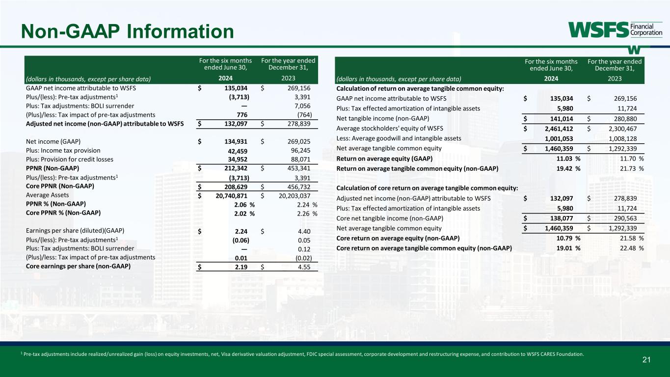 20 Non-GAAP Information For the six months ended June 30, For the year ended December 31, (dollars in thousands) 2024 2023 2023 Net interest income (GAAP) $ 349,727 $ 364,374 $ 725,103 Core net interest income (non-GAAP) $ 349,727 $ 364,374 $ 725,103 Noninterest income (GAAP) $ 167,455 $ 129,998 $ 289,871 (Plus)/less: Unrealized (loss) gain on equity investments, net — (4) 329 Less: Realized gain on sale of equity investment, net 2,130 — 9,493 Less/(plus): Visa derivative valuation adjustment 2,829 (1,105) (2,460) Core fee revenue (non-GAAP) $ 162,496 $ 131,107 $ 282,509 Core net revenue (non-GAAP) $ 512,223 $ 495,481 $ 1,007,612 Core net revenue (non-GAAP) (tax-equivalent) $ 512,984 $ 496,492 $ 1,009,427 Noninterest expense (GAAP) $ 304,840 $ 274,298 $ 561,633 Less: FDIC special assessment 880 — 5,052 Less: Corporate development expense 366 3,536 3,931 Plus: Restructuring expense — (787) (230) Less: Contribution to WSFS CARES Foundation — — 2,000 Core noninterest expense (non-GAAP) $ 303,594 $ 271,549 $ 550,880 Core efficiency ratio (non-GAAP) 59.2 % 54.7 % 54.6 % Core fee revenue ratio (non-GAAP)(tax-equivalent) 31.7 % 26.4 % 28.0 % As of (dollars in thousands) June 30, 2024 Calculation of effective AOCI: Unrealized losses on AFS securities $ 549,039 Unrealized losses on securities transferred from AFS to HTM 84,046 Unrecognized fair value on HTM securities 109,186 Effective AOCI (non-GAAP) $ 742,271 As of (dollars in thousands, except per share data) June 30, 2024 Total assets (GAAP) $ 20,744,530 Less: Goodwill and other intangible assets 996,181 Total tangible assets (non-GAAP) $ 19,748,349 Total stockholders’ equity of WSFS (GAAP) $ 2,489,580 Less: Goodwill and other intangible assets 996,181 Total tangible common equity (non-GAAP) $ 1,493,399 Number of shares of common stock outstanding (000s) 59,261 Equity to asset ratio (GAAP) 12.00 % Tangible common equity to tangible assets ratio (non-GAAP) 7.56 % Calculation of tangible common book value (TBV) per share excluding AOCI: Total stockholders’ equity of WSFS (GAAP) $ 2,489,580 Total tangible common equity (non-GAAP) $ 1,493,399 Less: AOCI (642,878) Tangible common equity ex-AOCI (non-GAAP) $ 2,136,277 Number of shares of common stock outstanding (000s) 59,261 Book value per share (GAAP) $ 42.01 Tangible common book value per share (non-GAAP) $ 25.20 Tangible common book value per share excluding AOCI (non-GAAP) $ 36.05