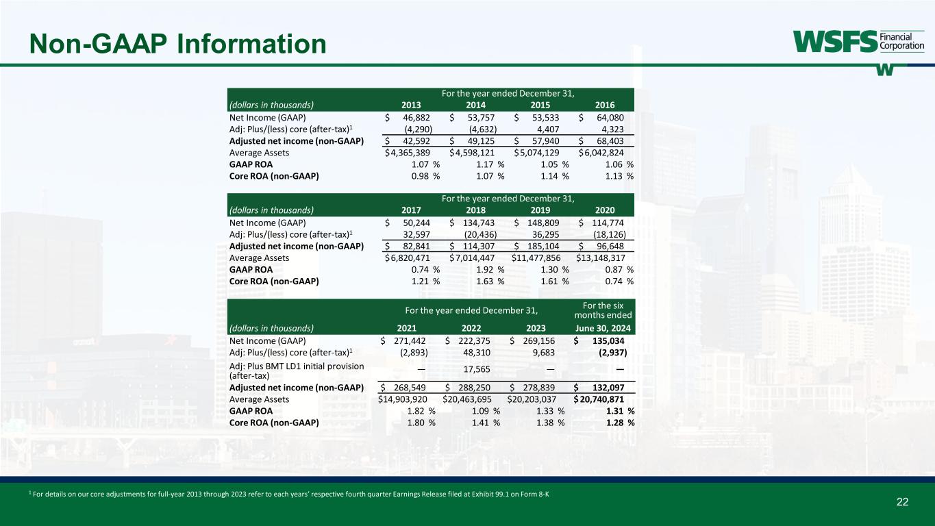 21 Non-GAAP Information 1 Pre-tax adjustments include realized/unrealized gain (loss) on equity investments, net, Visa derivative valuation adjustment, FDIC special assessment, corporate development and restructuring expense, and contribution to WSFS CARES Foundation. For the six months ended June 30, For the year ended December 31, (dollars in thousands, except per share data) 2024 2023 GAAP net income attributable to WSFS $ 135,034 $ 269,156 Plus/(less): Pre-tax adjustments1 (3,713) 3,391 Plus: Tax adjustments: BOLI surrender — 7,056 (Plus)/less: Tax impact of pre-tax adjustments 776 (764) Adjusted net income (non-GAAP) attributable to WSFS $ 132,097 $ 278,839 Net income (GAAP) $ 134,931 $ 269,025 Plus: Income tax provision 42,459 96,245 Plus: Provision for credit losses 34,952 88,071 PPNR (Non-GAAP) $ 212,342 $ 453,341 Plus/(less): Pre-tax adjustments1 (3,713) 3,391 Core PPNR (Non-GAAP) $ 208,629 $ 456,732 Average Assets $ 20,740,871 $ 20,203,037 PPNR % (Non-GAAP) 2.06 % 2.24 % Core PPNR % (Non-GAAP) 2.02 % 2.26 % Earnings per share (diluted)(GAAP) $ 2.24 $ 4.40 Plus/(less): Pre-tax adjustments1 (0.06) 0.05 Plus: Tax adjustments: BOLI surrender — 0.12 (Plus)/less: Tax impact of pre-tax adjustments 0.01 (0.02) Core earnings per share (non-GAAP) $ 2.19 $ 4.55 For the six months ended June 30, For the year ended December 31, (dollars in thousands, except per share data) 2024 2023 Calculation of return on average tangible common equity: GAAP net income attributable to WSFS $ 135,034 $ 269,156 Plus: Tax effected amortization of intangible assets 5,980 11,724 Net tangible income (non-GAAP) $ 141,014 $ 280,880 Average stockholders' equity of WSFS $ 2,461,412 $ 2,300,467 Less: Average goodwill and intangible assets 1,001,053 1,008,128 Net average tangible common equity $ 1,460,359 $ 1,292,339 Return on average equity (GAAP) 11.03 % 11.70 % Return on average tangible common equity (non-GAAP) 19.42 % 21.73 % Calculation of core return on average tangible common equity: Adjusted net income (non-GAAP) attributable to WSFS $ 132,097 $ 278,839 Plus: Tax effected amortization of intangible assets 5,980 11,724 Core net tangible income (non-GAAP) $ 138,077 $ 290,563 Net average tangible common equity $ 1,460,359 $ 1,292,339 Core return on average equity (non-GAAP) 10.79 % 21.58 % Core return on average tangible common equity (non-GAAP) 19.01 % 22.48 %