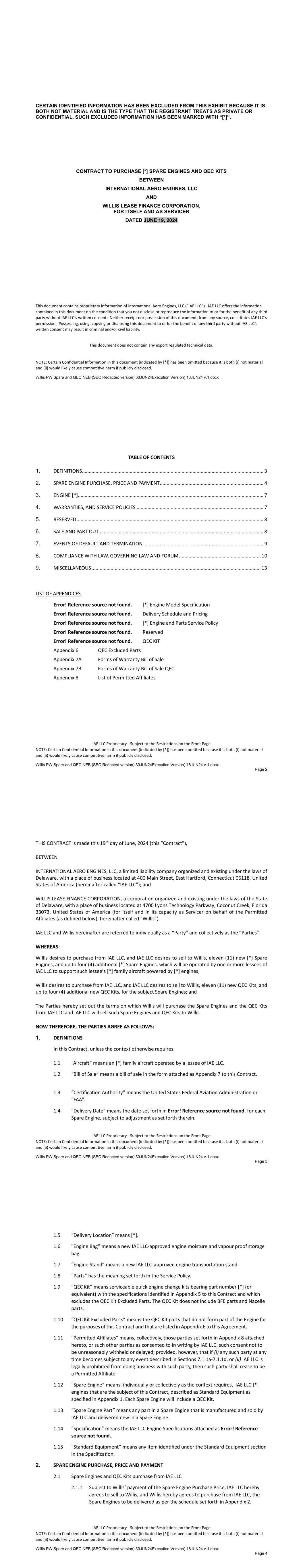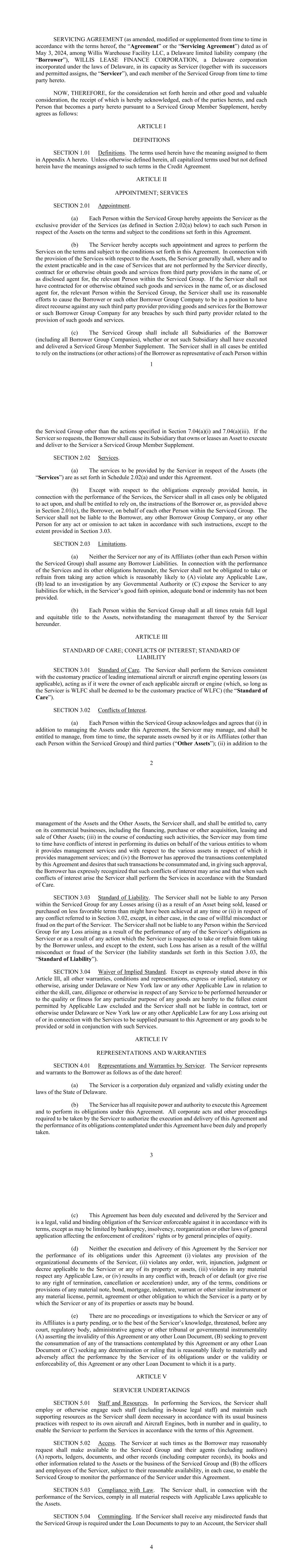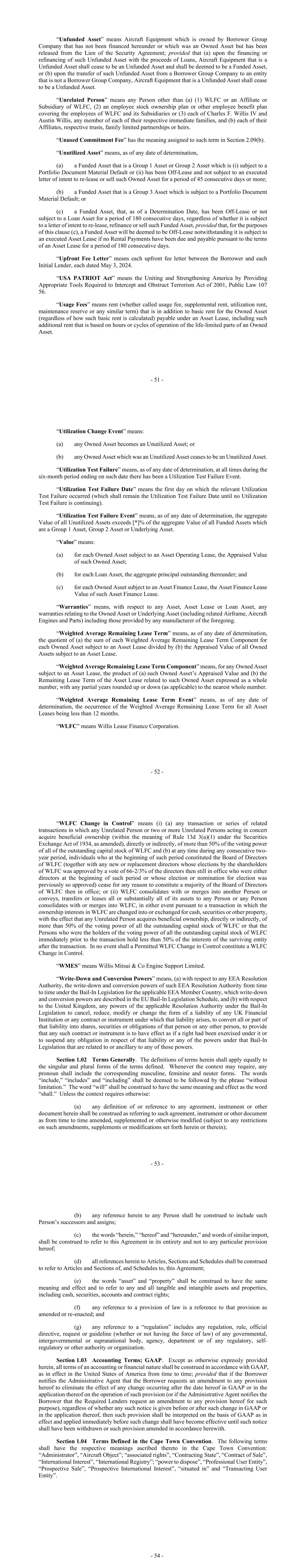 - 51 - “Unfunded Asset” means Aircraft Equipment which is owned by Borrower Group Company that has not been financed hereunder or which was an Owned Asset but has been released from the Lien of the Security Agreement; provided that (a) upon the financing or refinancing of such Unfunded Asset with the proceeds of Loans, Aircraft Equipment that is a Unfunded Asset shall cease to be an Unfunded Asset and shall be deemed to be a Funded Asset, or (b) upon the transfer of such Unfunded Asset from a Borrower Group Company to an entity that is not a Borrower Group Company, Aircraft Equipment that is a Unfunded Asset shall cease to be a Unfunded Asset. “Unrelated Person” means any Person other than (a) (1) WLFC or an Affiliate or Subsidiary of WLFC, (2) an employee stock ownership plan or other employee benefit plan covering the employees of WLFC and its Subsidiaries or (3) each of Charles F. Willis IV and Austin Willis, any member of each of their respective immediate families, and (b) each of their Affiliates, respective trusts, family limited partnerships or heirs. “Unused Commitment Fee” has the meaning assigned to such term in Section 2.09(b). “Unutilized Asset” means, as of any date of determination, (a) a Funded Asset that is a Group 1 Asset or Group 2 Asset which is (i) subject to a Portfolio Document Material Default or (ii) has been Off-Lease and not subject to an executed letter of intent to re-lease or sell such Owned Asset for a period of 45 consecutive days or more; (b) a Funded Asset that is a Group 3 Asset which is subject to a Portfolio Document Material Default; or (c) a Funded Asset, that, as of a Determination Date, has been Off-Lease or not subject to a Loan Asset for a period of 180 consecutive days, regardless of whether it is subject to a letter of intent to re-lease, refinance or sell such Funded Asset, provided that, for the purposes of this clause (c), a Funded Asset will be deemed to be Off-Lease notwithstanding it is subject to an executed Asset Lease if no Rental Payments have been due and payable pursuant to the terms of an Asset Lease for a period of 180 consecutive days. “Upfront Fee Letter” means each upfront fee letter between the Borrower and each Initial Lender, each dated May 3, 2024. “USA PATRIOT Act” means the Uniting and Strengthening America by Providing Appropriate Tools Required to Intercept and Obstruct Terrorism Act of 2001, Public Law 107 56. “Usage Fees” means rent (whether called usage fee, supplemental rent, utilization rent, maintenance reserve or any similar term) that is in addition to basic rent for the Owned Asset (regardless of how such basic rent is calculated) payable under an Asset Lease, including such additional rent that is based on hours or cycles of operation of the life-limited parts of an Owned Asset. - 52 - “Utilization Change Event” means: (a) any Owned Asset becomes an Unutilized Asset; or (b) any Owned Asset which was an Unutilized Asset ceases to be an Unutilized Asset. “Utilization Test Failure” means, as of any date of determination, at all times during the six-month period ending on such date there has been a Utilization Test Failure Event. “Utilization Test Failure Date” means the first day on which the relevant Utilization Test Failure occurred (which shall remain the Utilization Test Failure Date until no Utilization Test Failure is continuing). “Utilization Test Failure Event” means, as of any date of determination, the aggregate Value of all Unutilized Assets exceeds [*]% of the aggregate Value of all Funded Assets which are a Group 1 Asset, Group 2 Asset or Underlying Asset. “Value” means: (a) for each Owned Asset subject to an Asset Operating Lease, the Appraised Value of such Owned Asset; (b) for each Loan Asset, the aggregate principal outstanding thereunder; and (c) for each Owned Asset subject to an Asset Finance Lease, the Asset Finance Lease Value of such Asset Finance Lease. “Warranties” means, with respect to any Asset, Asset Lease or Loan Asset, any warranties relating to the Owned Asset or Underlying Asset (including related Airframe, Aircraft Engines and Parts) including those provided by any manufacturer of the foregoing. “Weighted Average Remaining Lease Term” means, as of any date of determination, the quotient of (a) the sum of each Weighted Average Remaining Lease Term Component for each Owned Asset subject to an Asset Lease divided by (b) the Appraised Value of all Owned Assets subject to an Asset Lease. “Weighted Average Remaining Lease Term Component” means, for any Owned Asset subject to an Asset Lease, the product of (a) such Owned Asset’s Appraised Value and (b) the Remaining Lease Term of the Asset Lease related to such Owned Asset expressed as a whole number, with any partial years rounded up or down (as applicable) to the nearest whole number. “Weighted Average Remaining Lease Term Event” means, as of any date of determination, the occurrence of the Weighted Average Remaining Lease Term for all Asset Leases being less than 12 months. “WLFC” means Willis Lease Finance Corporation. - 53 - “WLFC Change in Control” means (i) (a) any transaction or series of related transactions in which any Unrelated Person or two or more Unrelated Persons acting in concert acquire beneficial ownership (within the meaning of Rule 13d 3(a)(1) under the Securities Exchange Act of 1934, as amended), directly or indirectly, of more than 50% of the voting power of all of the outstanding capital stock of WLFC and (b) at any time during any consecutive two- year period, individuals who at the beginning of such period constituted the Board of Directors of WLFC (together with any new or replacement directors whose elections by the shareholders of WLFC was approved by a vote of 66-2/3% of the directors then still in office who were either directors at the beginning of such period or whose election or nomination for election was previously so approved