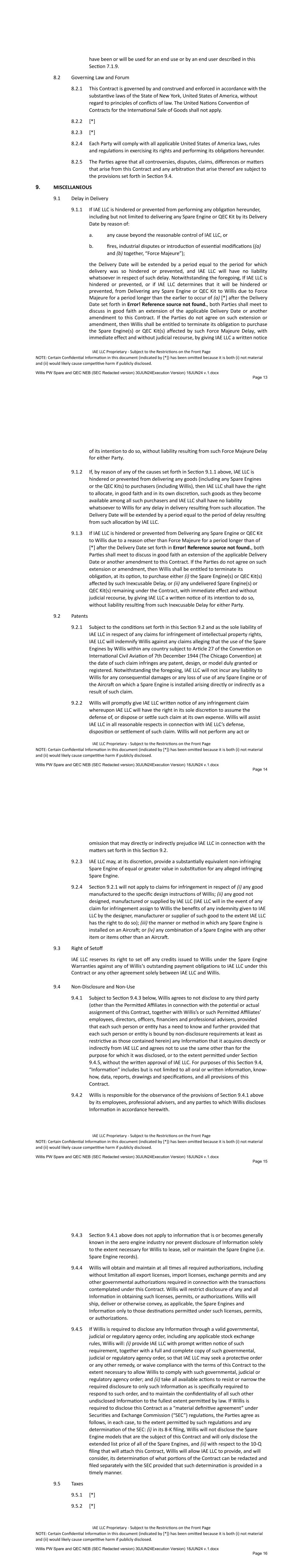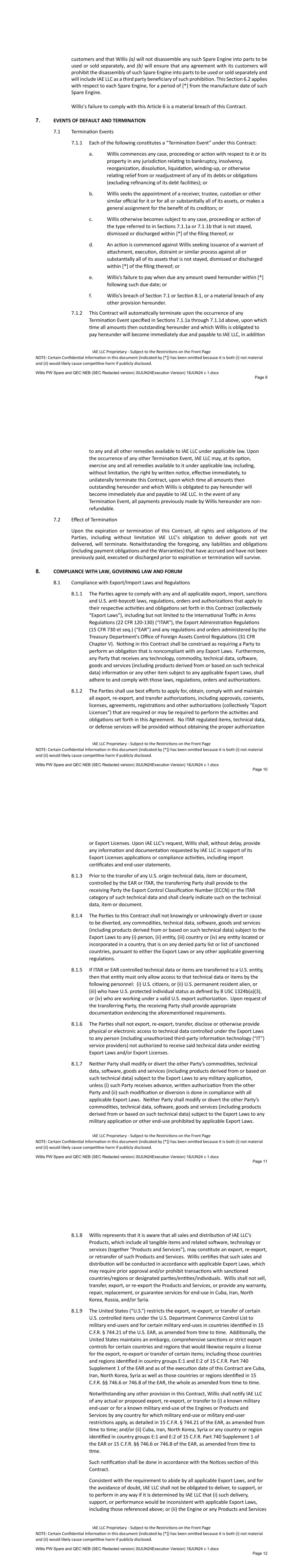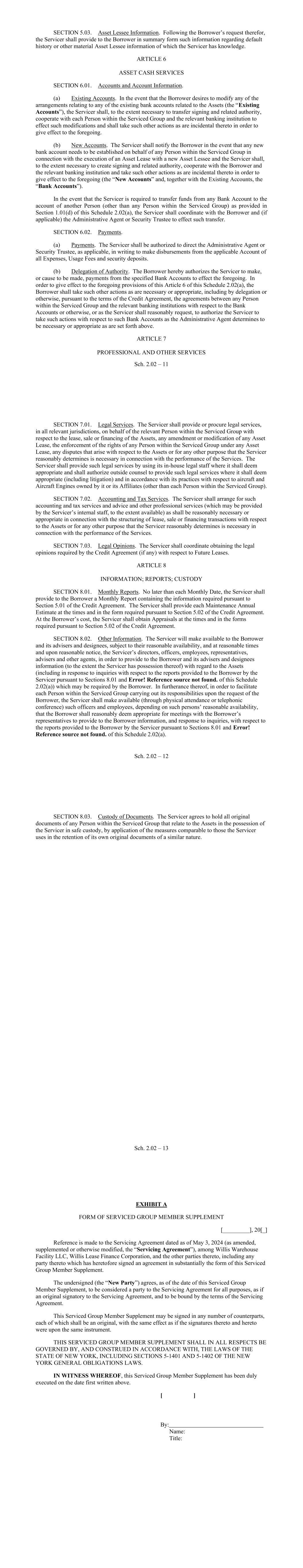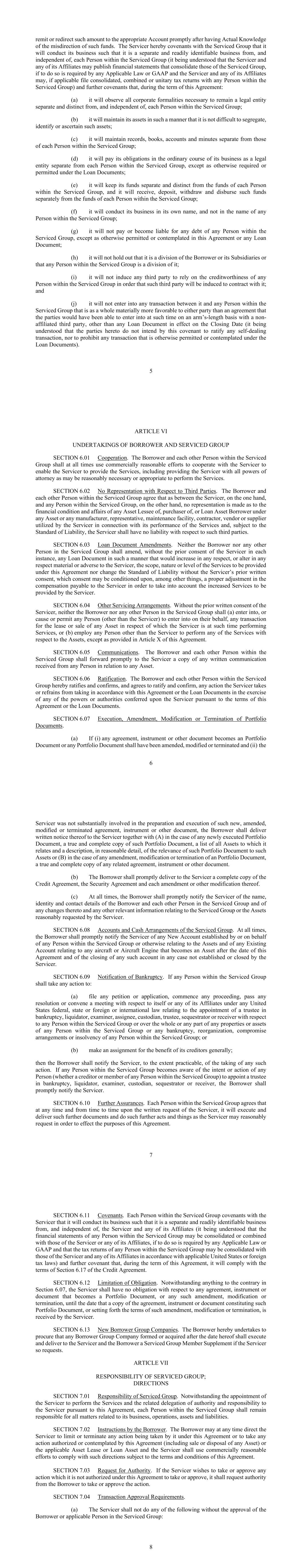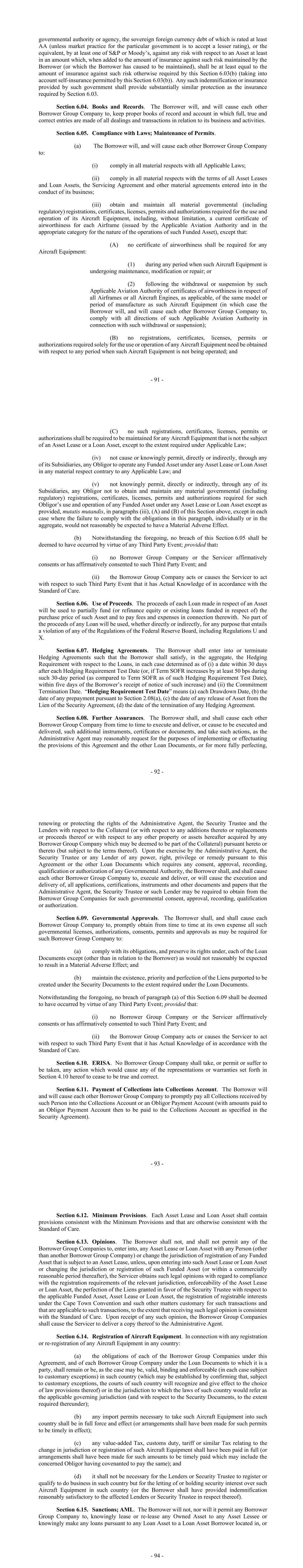 - 91 - governmental authority or agency, the sovereign foreign currency debt of which is rated at least AA (unless market practice for the particular government is to accept a lesser rating), or the equivalent, by at least one of S&P or Moody’s, against any risk with respect to an Asset at least in an amount which, when added to the amount of insurance against such risk maintained by the Borrower (or which the Borrower has caused to be maintained), shall be at least equal to the amount of insurance against such risk otherwise required by this Section 6.03(b) (taking into account self-insurance permitted by this Section 6.03(b)). Any such indemnification or insurance provided by such government shall provide substantially similar protection as the insurance required by Section 6.03. Section 6.04. Books and Records. The Borrower will, and will cause each other Borrower Group Company to, keep proper books of record and account in which full, true and correct entries are made of all dealings and transactions in relation to its business and activities. Section 6.05. Compliance with Laws; Maintenance of Permits. (a) The Borrower will, and will cause each other Borrower Group Company to: (i) comply in all material respects with all Applicable Laws; (ii) comply in all material respects with the terms of all Asset Leases and Loan Assets, the Servicing Agreement and other material agreements entered into in the conduct of its business; (iii) obtain and maintain all material governmental (including regulatory) registrations, certificates, licenses, permits and authorizations required for the use and operation of its Aircraft Equipment, including, without limitation, a current certificate of airworthiness for each Airframe (issued by the Applicable Aviation Authority and in the appropriate category for the nature of the operations of such Funded Asset), except that: (A) no certificate of airworthiness shall be required for any Aircraft Equipment: (1) during any period when such Aircraft Equipment is undergoing maintenance, modification or repair; or (2) following the withdrawal or suspension by such Applicable Aviation Authority of certificates of airworthiness in respect of all Airframes or all Aircraft Engines, as applicable, of the same model or period of manufacture as such Aircraft Equipment (in which case the Borrower will, and will cause each other Borrower Group Company to, comply with all directions of such Applicable Aviation Authority in connection with such withdrawal or suspension); (B) no registrations, certificates, licenses, permits or authorizations required solely for the use or operation of any Aircraft Equipment need be obtained with respect to any period when such Aircraft Equipment is not being operated; and - 92 - (C) no such registrations, certificates, licenses, permits or authorizations shall be required to be maintained for any Aircraft Equipment that is not the subject of an Asset Lease or a Loan Asset, except to the extent required under Applicable Law; (iv) not cause or knowingly permit, directly or indirectly, through any of its Subsidiaries, any Obligor to operate any Funded Asset under any Asset Lease or Loan Asset in any material respect contrary to any Applicable Law; and (v) not knowingly permit, directly or indirectly, through any of its Subsidiaries, any Obligor not to obtain and maintain any material governmental (including regulatory) registrations, certificates, licenses, permits and authorizations required for such Obligor’s use and operation of any Funded Asset under any Asset Lease or Loan Asset except as provided, mutatis mutandis, in paragraphs (iii), (A) and (B) of this Section above, except in each case where the failure to comply with the obligations in this paragraph, individually or in the aggregate, would not reasonably be expected to have a Material Adverse Effect. (b) Notwithstanding the foregoing, no breach of this Section 6.05 shall be deemed to have occurred by virtue of any Third Party Event; provided that: (i) no Borrower Group Company or the Servicer affirmatively consents or has affirmatively consented to such Third Party Event; and (ii) the Borrower Group Company acts or causes the Servicer to act with respect to such Third Party Event that it has Actual Knowledge of in accordance with the Standard of Care. Section 6.06. Use of Proceeds. The proceeds of each Loan made in respect of an Asset will be used to partially fund (or refinance equity or existing loans funded in respect of) the purchase price of such Asset and to pay fees and expenses in connection therewith. No part of the proceeds of any Loan will be used, whether directly or indirectly, for any purpose that entails a violation of any of the Regulations of the Federal Reserve Board, including Regulations U and X. Section 6.07. Hedging Agreements. The Borrower shall enter into or terminate Hedging Agreements such that the Borrower shall satisfy, in the aggregate, the Hedging Requirement with respect to the Loans, in each case determined as of (i) a date within 30 days after each Hedging Requirement Test Date (or, if Term SOFR increases by at least 50 bps during such 30-day period (as compared to Term SOFR as of such Hedging Requirement Test Date), within five days of the Borrower’s receipt of notice of such increase) and (ii) the Commitment Termination Date. “Hedging Requirement Test Date” means (a) each Drawdown Date, (b) the date of any prepayment pursuant to Section 2.08(a), (c) the date of any release of Asset from the Lien of the Security Agreement, (d) the date of the termination of any Hedging Agreement. Section 6.08. Further Assurances. The Borrower shall, and shall cause each other Borrower Group Company from time to time to execute and deliver, or cause to be executed and delivered, such additional instruments, certificates or documents, and take such actions, as the Administrative Agent may reasonably request for the purposes of implementing or effectuating th
