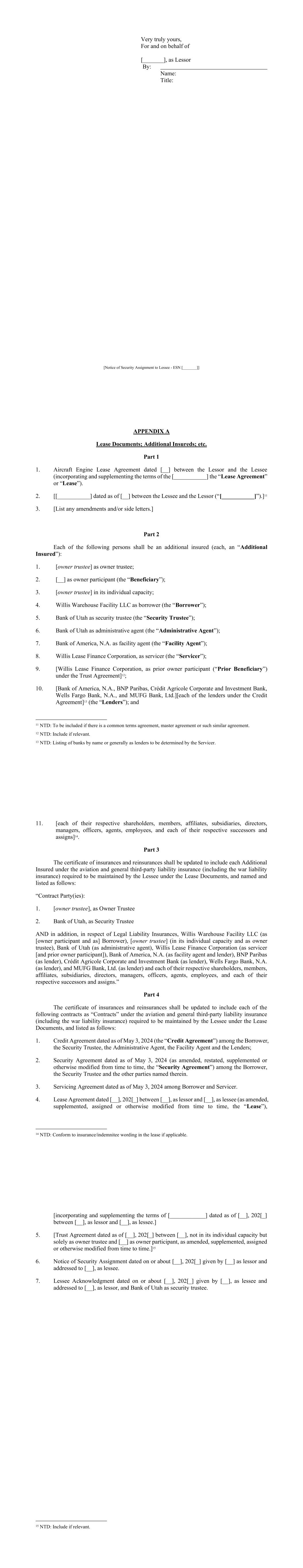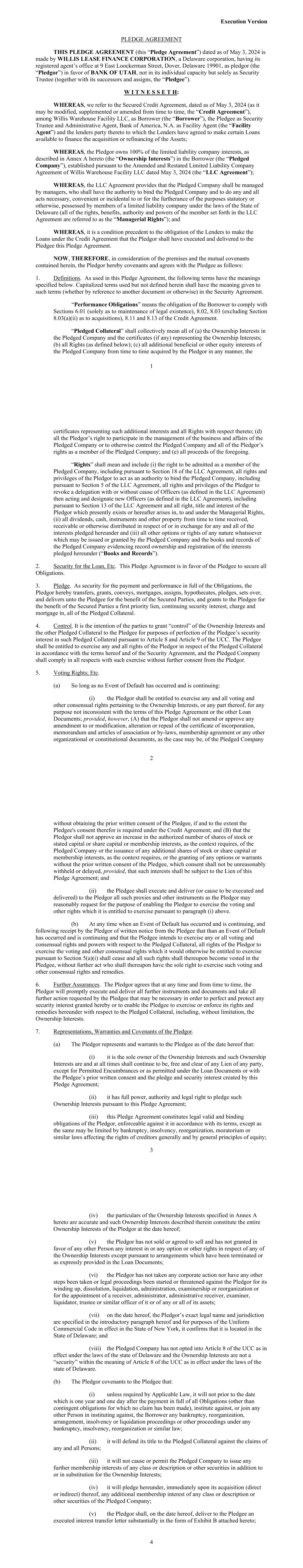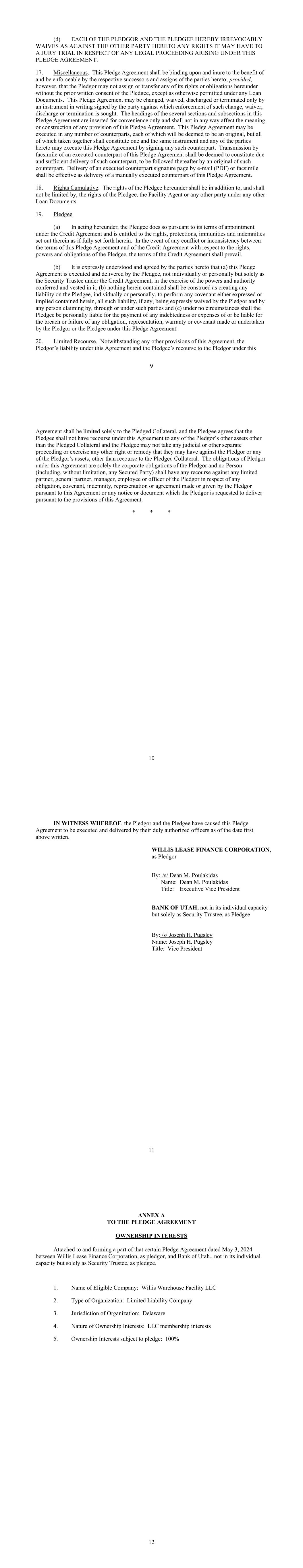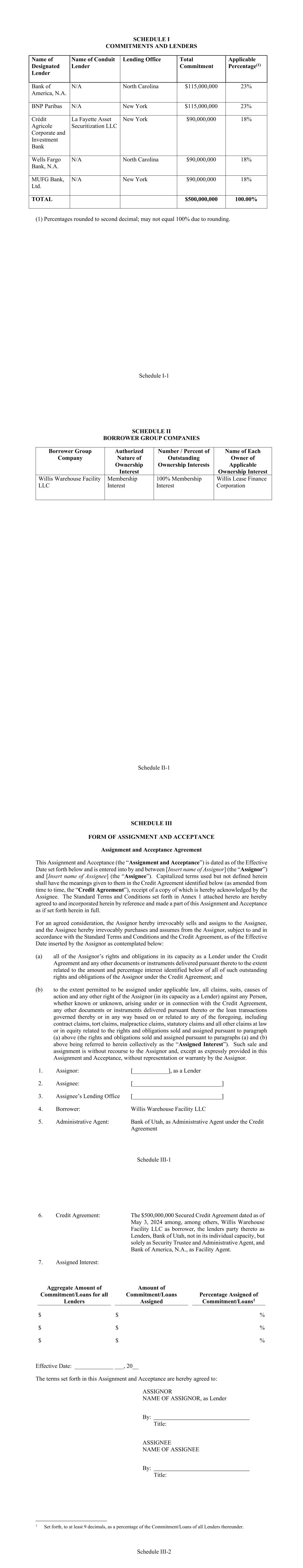 Schedule I-1 SCHEDULE I COMMITMENTS AND LENDERS Name of Designated Lender Name of Conduit Lender Lending Office Total Commitment Applicable Percentage(1) Bank of America, N.A. N/A North Carolina $115,000,000 23% BNP Paribas N/A New York $115,000,000 23% Crédit Agricole Corporate and Investment Bank La Fayette Asset Securitization LLC New York $90,000,000 18% Wells Fargo Bank, N.A. N/A North Carolina $90,000,000 18% MUFG Bank, Ltd. N/A New York $90,000,000 18% TOTAL $500,000,000 100.00% (1) Percentages rounded to second decimal; may not equal 100% due to rounding. Schedule II-1 SCHEDULE II BORROWER GROUP COMPANIES Borrower Group Company Authorized Nature of Ownership Interest Number / Percent of Outstanding Ownership Interests Name of Each Owner of Applicable Ownership Interest Willis Warehouse Facility LLC Membership Interest 100% Membership Interest Willis Lease Finance Corporation Schedule III-1 SCHEDULE III FORM OF ASSIGNMENT AND ACCEPTANCE Assignment and Acceptance Agreement This Assignment and Acceptance (the “Assignment and Acceptance”) is dated as of the Effective Date set forth below and is entered into by and between [Insert name of Assignor] (the “Assignor”) and [Insert name of Assignee] (the “Assignee”). Capitalized terms used but not defined herein shall have the meanings given to them in the Credit Agreement identified below (as amended from time to time, the “Credit Agreement”), receipt of a copy of which is hereby acknowledged by the Assignee. The Standard Terms and Conditions set forth in Annex 1 attached hereto are hereby agreed to and incorporated herein by reference and made a part of this Assignment and Acceptance as if set forth herein in full. For an agreed consideration, the Assignor hereby irrevocably sells and assigns to the Assignee, and the Assignee hereby irrevocably purchases and assumes from the Assignor, subject to and in accordance with the Standard Terms and Conditions and the Credit Agreement, as of the Effective Date inserted by the Assignor as contemplated below: (a) all of the Assignor’s rights and obligations in its capacity as a Lender under the Credit Agreement and any other documents or instruments delivered pursuant thereto to the extent related to the amount and percentage interest identified below of all of such outstanding rights and obligations of the Assignor under the Credit Agreement; and (b) to the extent permitted to be assigned under applicable law, all claims, suits, causes of action and any other right of the Assignor (in its capacity as a Lender) against any Person, whether known or unknown, arising under or in connection with the Credit Agreement, any other documents or instruments delivered pursuant thereto or the loan transactions governed thereby or in any way based on or related to any of the foregoing, including contract claims, tort claims, malpractice claims, statutory claims and all other claims at law or in equity related to the rights and obligations sold and assigned pursuant to paragraph (a) above (the rights and obligations sold and assigned pursuant to paragraphs (a) and (b) above being referred to herein collectively as the “Assigned Interest”). Such sale and assignment is without recourse to the Assignor and, except as expressly provided in this Assignment and Acceptance, without representation or warranty by the Assignor. 1. Assignor: [____________], as a Lender 2. Assignee: [______________________________] 3. Assignee’s Lending Office [______________________________] 4. Borrower: Willis Warehouse Facility LLC 5. Administrative Agent: Bank of Utah, as Administrative Agent under the Credit Agreement Schedule III-2 6. Credit Agreement: The $500,000,000 Secured Credit Agreement dated as of May 3, 2024 among, among others, Willis Warehouse Facility LLC as borrower, the lenders party thereto as Lenders, Bank of Utah, not in its individual capacity, but solely as Security Trustee and Administrative Agent, and Bank of America, N.A., as Facility Agent. 7. Assigned Interest: Aggregate Amount of Commitment/Loans for all Lenders Amount of Commitment/Loans Assigned Percentage Assigned of Commitment/Loans1 $ $ % $ $ % $ $ % Effective Date: _____________ ___, 20__ The terms set forth in this Assignment and Acceptance are hereby agreed to: ASSIGNOR NAME OF ASSIGNOR, as Lender By: Title: ASSIGNEE NAME OF ASSIGNEE By: Title: 1 Set forth, to at least 9 decimals, as a percentage of the Commitment/Loans of all Lenders thereunder.