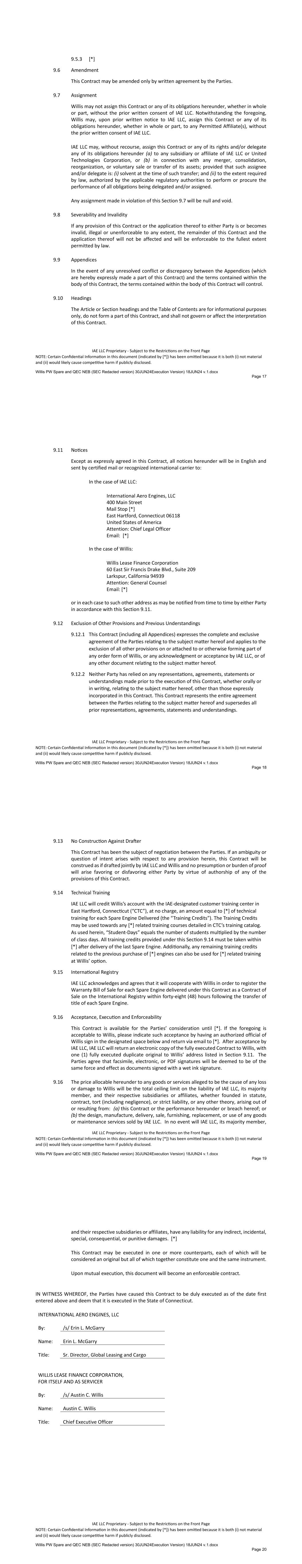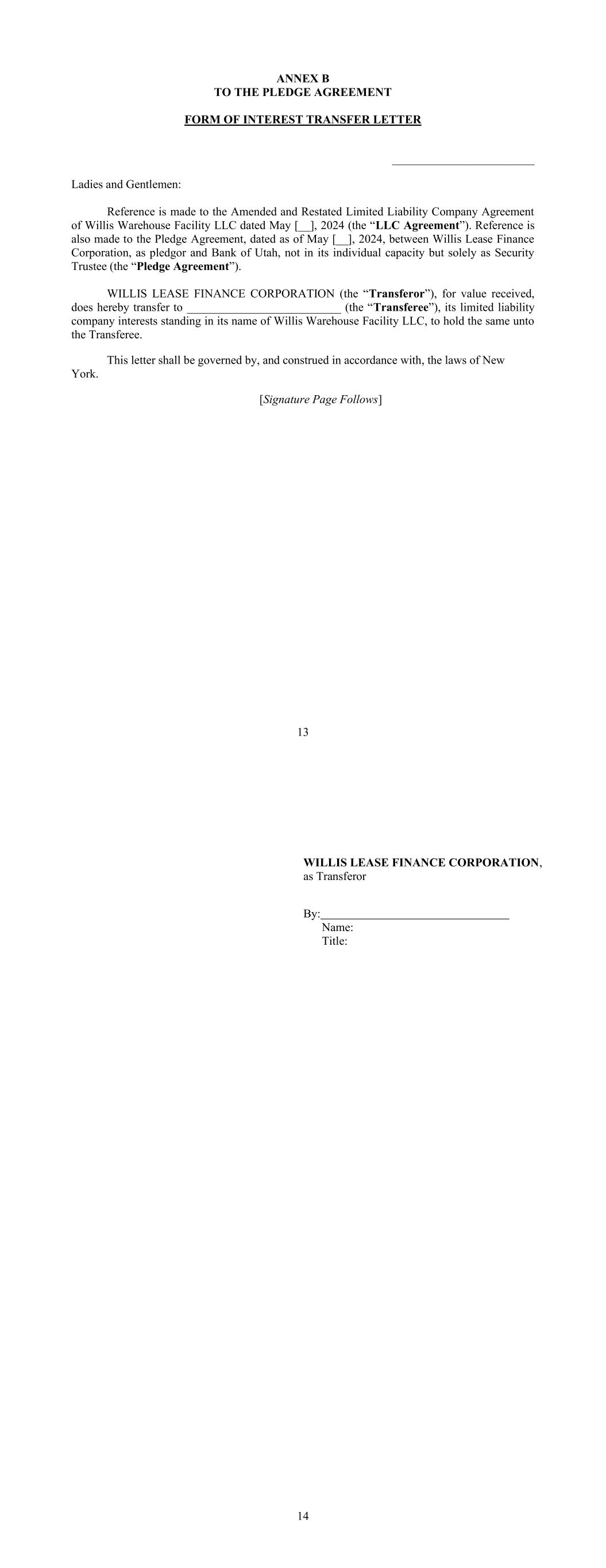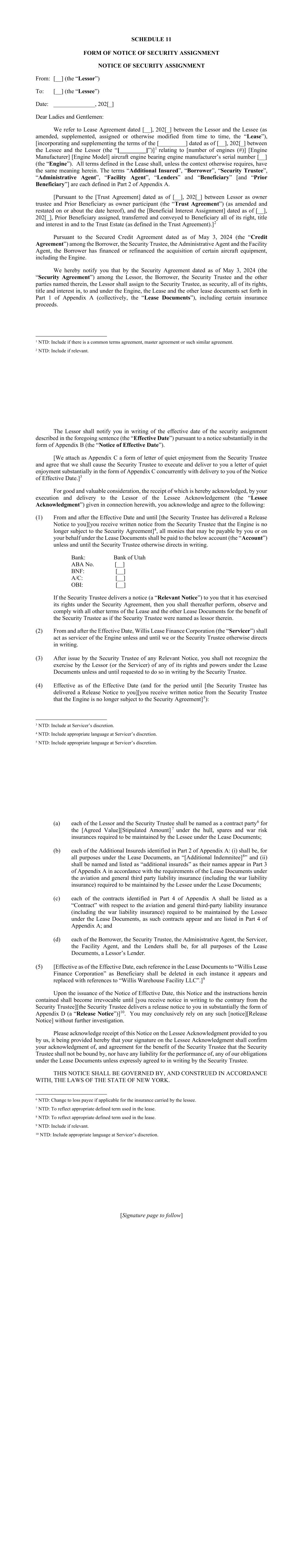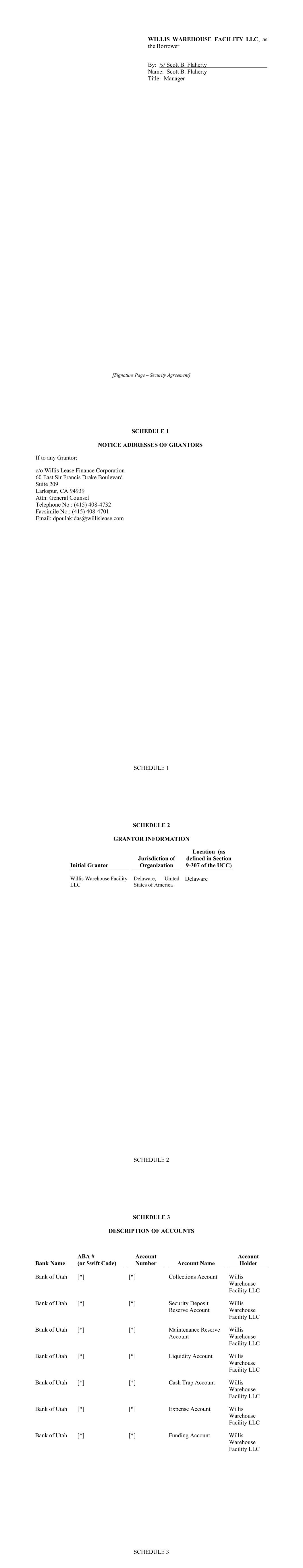 Schedule I-1 SCHEDULE I COMMITMENTS AND LENDERS Name of Designated Lender Name of Conduit Lender Lending Office Total Commitment Applicable Percentage(1) Bank of America, N.A. N/A North Carolina $115,000,000 23% BNP Paribas N/A New York $115,000,000 23% Crédit Agricole Corporate and Investment Bank La Fayette Asset Securitization LLC New York $90,000,000 18% Wells Fargo Bank, N.A. N/A North Carolina $90,000,000 18% MUFG Bank, Ltd. N/A New York $90,000,000 18% TOTAL $500,000,000 100.00% (1) Percentages rounded to second decimal; may not equal 100% due to rounding. Schedule II-1 SCHEDULE II BORROWER GROUP COMPANIES Borrower Group Company Authorized Nature of Ownership Interest Number / Percent of Outstanding Ownership Interests Name of Each Owner of Applicable Ownership Interest Willis Warehouse Facility LLC Membership Interest 100% Membership Interest Willis Lease Finance Corporation Schedule III-1 SCHEDULE III FORM OF ASSIGNMENT AND ACCEPTANCE Assignment and Acceptance Agreement This Assignment and Acceptance (the “Assignment and Acceptance”) is dated as of the Effective Date set forth below and is entered into by and between [Insert name of Assignor] (the “Assignor”) and [Insert name of Assignee] (the “Assignee”). Capitalized terms used but not defined herein shall have the meanings given to them in the Credit Agreement identified below (as amended from time to time, the “Credit Agreement”), receipt of a copy of which is hereby acknowledged by the Assignee. The Standard Terms and Conditions set forth in Annex 1 attached hereto are hereby agreed to and incorporated herein by reference and made a part of this Assignment and Acceptance as if set forth herein in full. For an agreed consideration, the Assignor hereby irrevocably sells and assigns to the Assignee, and the Assignee hereby irrevocably purchases and assumes from the Assignor, subject to and in accordance with the Standard Terms and Conditions and the Credit Agreement, as of the Effective Date inserted by the Assignor as contemplated below: (a) all of the Assignor’s rights and obligations in its capacity as a Lender under the Credit Agreement and any other documents or instruments delivered pursuant thereto to the extent related to the amount and percentage interest identified below of all of such outstanding rights and obligations of the Assignor under the Credit Agreement; and (b) to the extent permitted to be assigned under applicable law, all claims, suits, causes of action and any other right of the Assignor (in its capacity as a Lender) against any Person, whether known or unknown, arising under or in connection with the Credit Agreement, any other documents or instruments delivered pursuant thereto or the loan transactions governed thereby or in any way based on or related to any of the foregoing, including contract claims, tort claims, malpractice claims, statutory claims and all other claims at law or in equity related to the rights and obligations sold and assigned pursuant to paragraph (a) above (the rights and obligations sold and assigned pursuant to paragraphs (a) and (b) above being referred to herein collectively as the “Assigned Interest”). Such sale and assignment is without recourse to the Assignor and, except as expressly provided in this Assignment and Acceptance, without representation or warranty by the Assignor. 1. Assignor: [____________], as a Lender 2. Assignee: [______________________________] 3. Assignee’s Lending Office [______________________________] 4. Borrower: Willis Warehouse Facility LLC 5. Administrative Agent: Bank of Utah, as Administrative Agent under the Credit Agreement Schedule III-2 6. Credit Agreement: The $500,000,000 Secured Credit Agreement dated as of May 3, 2024 among, among others, Willis Warehouse Facility LLC as borrower, the lenders party thereto as Lenders, Bank of Utah, not in its individual capacity, but solely as Security Trustee and Administrative Agent, and Bank of America, N.A., as Facility Agent. 7. Assigned Interest: Aggregate Amount of Commitment/Loans for all Lenders Amount of Commitment/Loans Assigned Percentage Assigned of Commitment/Loans1 $ $ % $ $ % $ $ % Effective Date: _____________ ___, 20__ The terms set forth in this Assignment and Acceptance are hereby agreed to: ASSIGNOR NAME OF ASSIGNOR, as Lender By: Title: ASSIGNEE NAME OF ASSIGNEE By: Title: 1 Set forth, to at least 9 decimals, as a percentage of the Commitment/Loans of all Lenders thereunder.