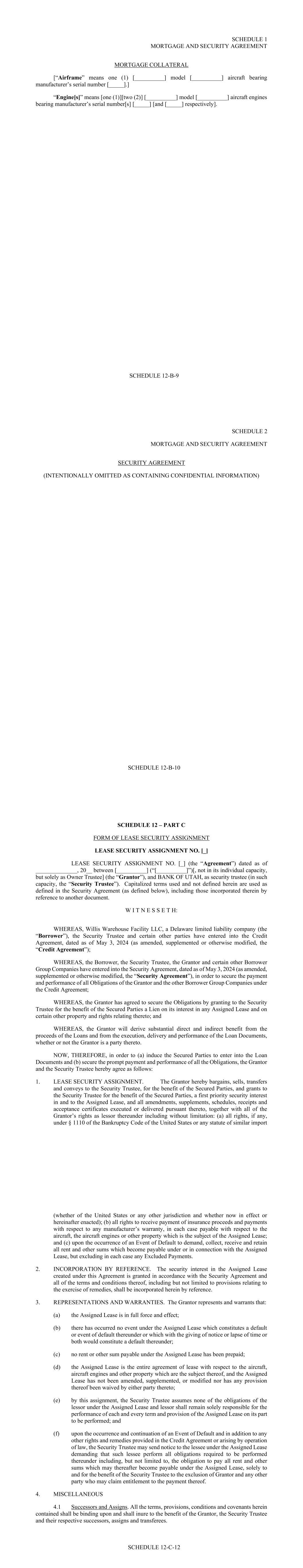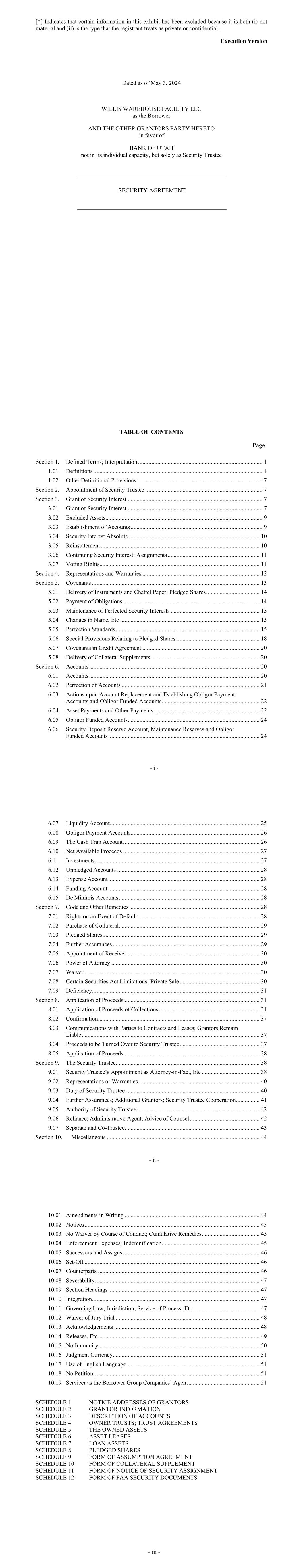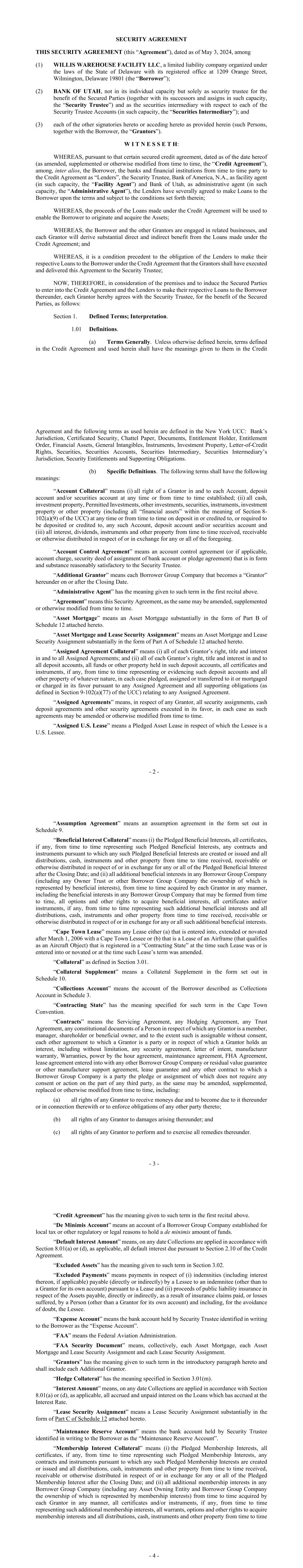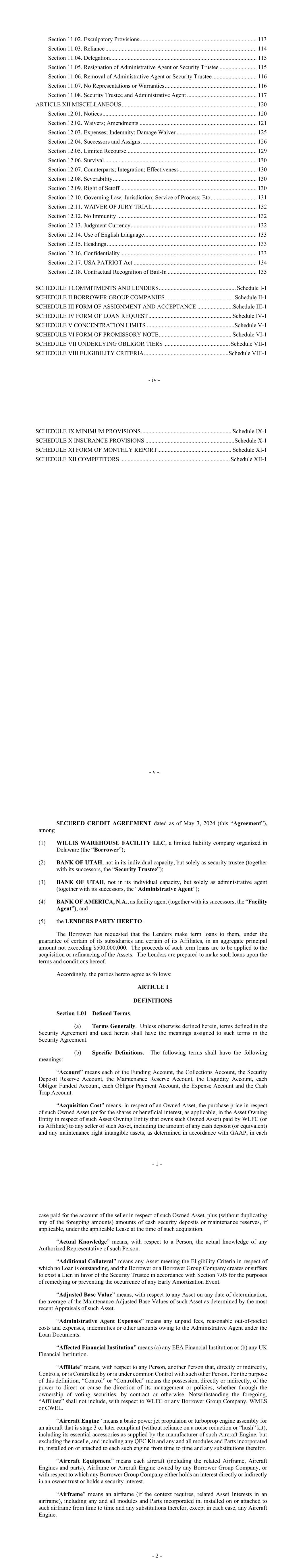 - iv - Section 11.02. Exculpatory Provisions ............................................................................... 113 Section 11.03. Reliance ...................................................................................................... 114 Section 11.04. Delegation ................................................................................................... 115 Section 11.05. Resignation of Administrative Agent or Security Trustee ......................... 115 Section 11.06. Removal of Administrative Agent or Security Trustee .............................. 116 Section 11.07. No Representations or Warranties .............................................................. 116 Section 11.08. Security Trustee and Administrative Agent ............................................... 117 ARTICLE XII MISCELLANEOUS ........................................................................................... 120 Section 12.01. Notices ........................................................................................................ 120 Section 12.02. Waivers; Amendments ............................................................................... 121 Section 12.03. Expenses; Indemnity; Damage Waiver ...................................................... 125 Section 12.04. Successors and Assigns .............................................................................. 126 Section 12.05. Limited Recourse ........................................................................................ 129 Section 12.06. Survival ....................................................................................................... 130 Section 12.07. Counterparts; Integration; Effectiveness .................................................... 130 Section 12.08. Severability ................................................................................................. 130 Section 12.09. Right of Setoff ............................................................................................ 130 Section 12.10. Governing Law; Jurisdiction; Service of Process; Etc ............................... 131 Section 12.11. WAIVER OF JURY TRIAL ...................................................................... 132 Section 12.12. No Immunity .............................................................................................. 132 Section 12.13. Judgment Currency ..................................................................................... 132 Section 12.14. Use of English Language ............................................................................ 133 Section 12.15. Headings ..................................................................................................... 133 Section 12.16. Confidentiality ............................................................................................ 133 Section 12.17. USA PATRIOT Act ................................................................................... 134 Section 12.18. Contractual Recognition of Bail-In ............................................................ 135 SCHEDULE I COMMITMENTS AND LENDERS .................................................... Schedule I-1 SCHEDULE II BORROWER GROUP COMPANIES ............................................... Schedule II-1 SCHEDULE III FORM OF ASSIGNMENT AND ACCEPTANCE ........................Schedule III-1 SCHEDULE IV FORM OF LOAN REQUEST ........................................................ Schedule IV-1 SCHEDULE V CONCENTRATION LIMITS ........................................................... Schedule V-1 SCHEDULE VI FORM OF PROMISSORY NOTE ................................................. Schedule VI-1 SCHEDULE VII UNDERLYING OBLIGOR TIERS ............................................. Schedule VII-1 SCHEDULE VIII ELIGIBILITY CRITERIA ......................................................... Schedule VIII-1 - v - SCHEDULE IX MINIMUM PROVISIONS ............................................................. Schedule IX-1 SCHEDULE X INSURANCE PROVISIONS ............................................................ Schedule X-1 SCHEDULE XI FORM OF MONTHLY REPORT .................................................. Schedule XI-1 SCHEDULE XII COMPETITORS .......................................................................... Schedule XII-1 - 1 - SECURED CREDIT AGREEMENT dated as of May 3, 2024 (this “Agreement”), among (1) WILLIS WAREHOUSE FACILITY LLC, a limited liability company organized in Delaware (the “Borrower”); (2) BANK OF UTAH, not in its individual capacity, but solely as security trustee (together with its successors, the “Security Trustee”); (3) BANK OF UTAH, not in its individual capacity, but solely as administrative agent (together with its successors, the “Administrative Agent”); (4) BANK OF AMERICA, N.A., as facility agent (together with its successors, the “Facility Agent”); and (5) the LENDERS PARTY HERETO. The Borrower has requested that the Lenders make term loans to them, under the guarantee of certain of its subsidiaries and certain of its Affiliates, in an aggregate principal amount not exceeding $500,000,000. The proceeds of such term loans are to be applied to the acquisition or refinancing of the Assets. The Lenders are prepared to make such loans upon the terms and conditions hereof. Accordingly, the parties hereto agree as follows: ARTICLE I DEFINITIONS Section 1.01 Defined Terms. (a) Terms Generally. Unless otherwise defined herein, terms defined in the Security Agreement and used herein shall have the meanings assigned to such terms in the Security Agreement. (b) Specific Definitions. The following terms shall have the following meanings: “Account” means each of the Funding Account, the Collections Account, the Security Deposit Reserve Account, the Maintenance Reserve Account, the Liquidity Account, each Obligor Funded Account, each Obligor Payment Account, the Expense Account and the Cash Tr