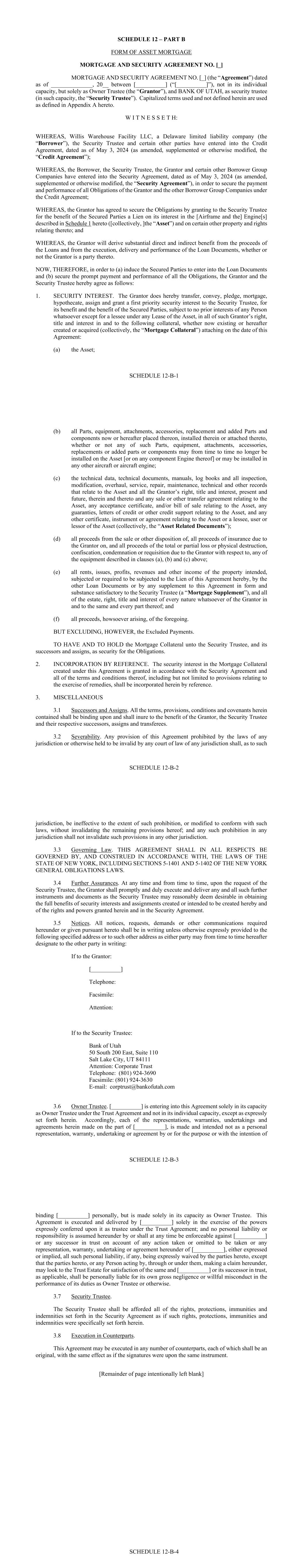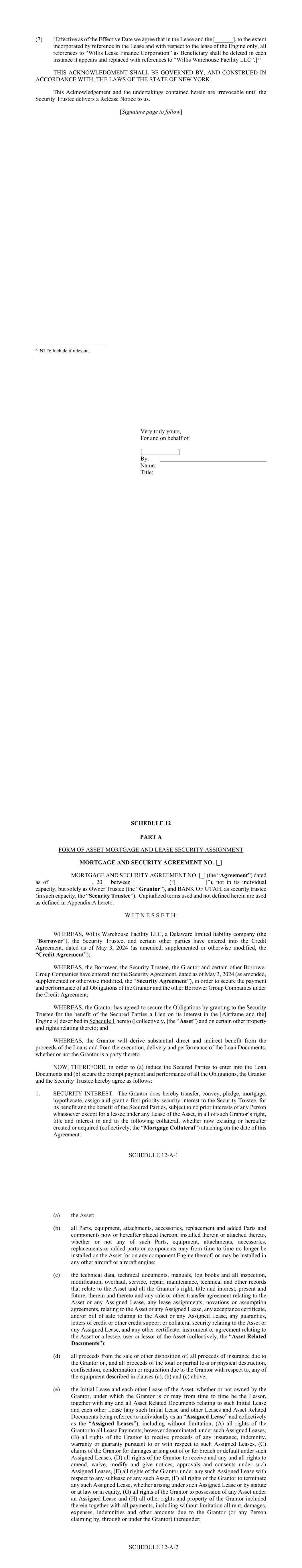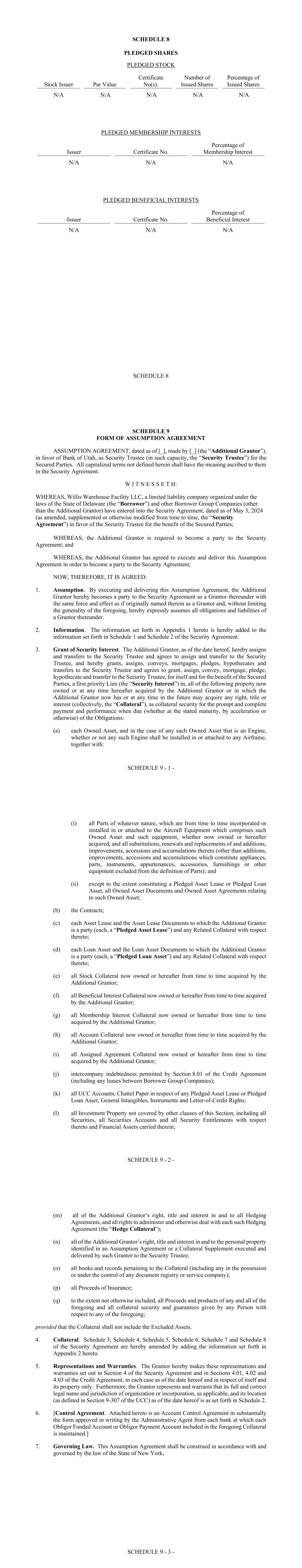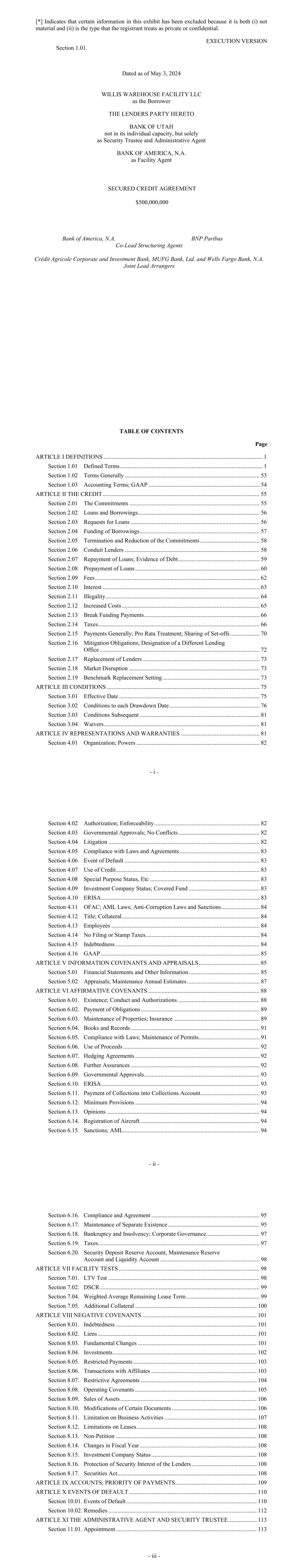 - iv - Section 11.02. Exculpatory Provisions ............................................................................... 113 Section 11.03. Reliance ...................................................................................................... 114 Section 11.04. Delegation ................................................................................................... 115 Section 11.05. Resignation of Administrative Agent or Security Trustee ......................... 115 Section 11.06. Removal of Administrative Agent or Security Trustee .............................. 116 Section 11.07. No Representations or Warranties .............................................................. 116 Section 11.08. Security Trustee and Administrative Agent ............................................... 117 ARTICLE XII MISCELLANEOUS ........................................................................................... 120 Section 12.01. Notices ........................................................................................................ 120 Section 12.02. Waivers; Amendments ............................................................................... 121 Section 12.03. Expenses; Indemnity; Damage Waiver ...................................................... 125 Section 12.04. Successors and Assigns .............................................................................. 126 Section 12.05. Limited Recourse ........................................................................................ 129 Section 12.06. Survival ....................................................................................................... 130 Section 12.07. Counterparts; Integration; Effectiveness .................................................... 130 Section 12.08. Severability ................................................................................................. 130 Section 12.09. Right of Setoff ............................................................................................ 130 Section 12.10. Governing Law; Jurisdiction; Service of Process; Etc ............................... 131 Section 12.11. WAIVER OF JURY TRIAL ...................................................................... 132 Section 12.12. No Immunity .............................................................................................. 132 Section 12.13. Judgment Currency ..................................................................................... 132 Section 12.14. Use of English Language ............................................................................ 133 Section 12.15. Headings ..................................................................................................... 133 Section 12.16. Confidentiality ............................................................................................ 133 Section 12.17. USA PATRIOT Act ................................................................................... 134 Section 12.18. Contractual Recognition of Bail-In ............................................................ 135 SCHEDULE I COMMITMENTS AND LENDERS .................................................... Schedule I-1 SCHEDULE II BORROWER GROUP COMPANIES ............................................... Schedule II-1 SCHEDULE III FORM OF ASSIGNMENT AND ACCEPTANCE ........................Schedule III-1 SCHEDULE IV FORM OF LOAN REQUEST ........................................................ Schedule IV-1 SCHEDULE V CONCENTRATION LIMITS ........................................................... Schedule V-1 SCHEDULE VI FORM OF PROMISSORY NOTE ................................................. Schedule VI-1 SCHEDULE VII UNDERLYING OBLIGOR TIERS ............................................. Schedule VII-1 SCHEDULE VIII ELIGIBILITY CRITERIA ......................................................... Schedule VIII-1 - v - SCHEDULE IX MINIMUM PROVISIONS ............................................................. Schedule IX-1 SCHEDULE X INSURANCE PROVISIONS ............................................................ Schedule X-1 SCHEDULE XI FORM OF MONTHLY REPORT .................................................. Schedule XI-1 SCHEDULE XII COMPETITORS .......................................................................... Schedule XII-1 - 1 - SECURED CREDIT AGREEMENT dated as of May 3, 2024 (this “Agreement”), among (1) WILLIS WAREHOUSE FACILITY LLC, a limited liability company organized in Delaware (the “Borrower”); (2) BANK OF UTAH, not in its individual capacity, but solely as security trustee (together with its successors, the “Security Trustee”); (3) BANK OF UTAH, not in its individual capacity, but solely as administrative agent (together with its successors, the “Administrative Agent”); (4) BANK OF AMERICA, N.A., as facility agent (together with its successors, the “Facility Agent”); and (5) the LENDERS PARTY HERETO. The Borrower has requested that the Lenders make term loans to them, under the guarantee of certain of its subsidiaries and certain of its Affiliates, in an aggregate principal amount not exceeding $500,000,000. The proceeds of such term loans are to be applied to the acquisition or refinancing of the Assets. The Lenders are prepared to make such loans upon the terms and conditions hereof. Accordingly, the parties hereto agree as follows: ARTICLE I DEFINITIONS Section 1.01 Defined Terms. (a) Terms Generally. Unless otherwise defined herein, terms defined in the Security Agreement and used herein shall have the meanings assigned to such terms in the Security Agreement. (b) Specific Definitions. The following terms shall have the following meanings: “Account” means each of the Funding Account, the Collections Account, the Security Deposit Reserve Account, the Maintenance Reserve Account, the Liquidity Account, each Obligor Funded Account, each Obligor Payment Account, the Expense Account and the Cash Tr