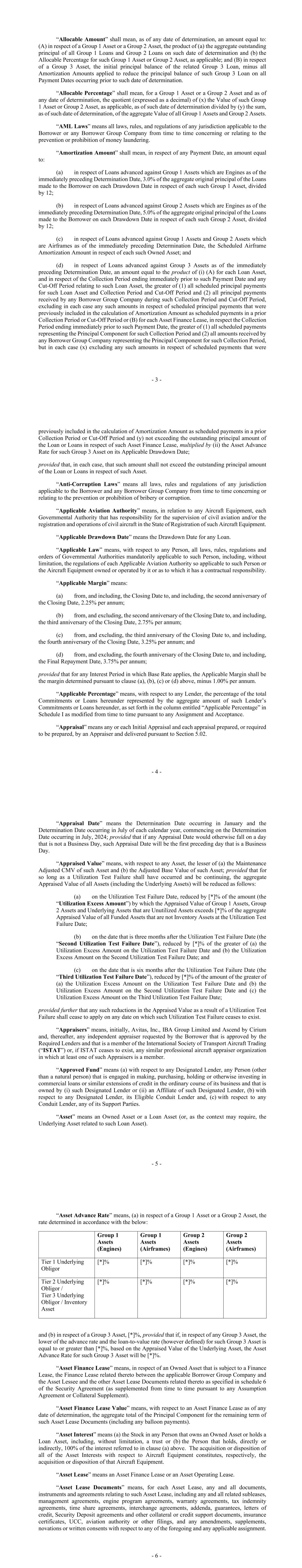 - 3 - “Allocable Amount” shall mean, as of any date of determination, an amount equal to: (A) in respect of a Group 1 Asset or a Group 2 Asset, the product of (a) the aggregate outstanding principal of all Group 1 Loans and Group 2 Loans on such date of determination and (b) the Allocable Percentage for such Group 1 Asset or Group 2 Asset, as applicable; and (B) in respect of a Group 3 Asset, the initial principal balance of the related Group 3 Loan, minus all Amortization Amounts applied to reduce the principal balance of such Group 3 Loan on all Payment Dates occurring prior to such date of determination. “Allocable Percentage” shall mean, for a Group 1 Asset or a Group 2 Asset and as of any date of determination, the quotient (expressed as a decimal) of (x) the Value of such Group 1 Asset or Group 2 Asset, as applicable, as of such date of determination divided by (y) the sum, as of such date of determination, of the aggregate Value of all Group 1 Assets and Group 2 Assets. “AML Laws” means all laws, rules, and regulations of any jurisdiction applicable to the Borrower or any Borrower Group Company from time to time concerning or relating to the prevention or prohibition of money laundering. “Amortization Amount” shall mean, in respect of any Payment Date, an amount equal to: (a) in respect of Loans advanced against Group 1 Assets which are Engines as of the immediately preceding Determination Date, 3.0% of the aggregate original principal of the Loans made to the Borrower on each Drawdown Date in respect of each such Group 1 Asset, divided by 12; (b) in respect of Loans advanced against Group 2 Assets which are Engines as of the immediately preceding Determination Date, 5.0% of the aggregate original principal of the Loans made to the Borrower on each Drawdown Date in respect of each such Group 2 Asset, divided by 12; (c) in respect of Loans advanced against Group 1 Assets and Group 2 Assets which are Airframes as of the immediately preceding Determination Date, the Scheduled Airframe Amortization Amount in respect of each such Owned Asset; and (d) in respect of Loans advanced against Group 3 Assets as of the immediately preceding Determination Date, an amount equal to the product of (i) (A) for each Loan Asset, and in respect of the Collection Period ending immediately prior to such Payment Date and any Cut-Off Period relating to such Loan Asset, the greater of (1) all scheduled principal payments for such Loan Asset and Collection Period and Cut-Off Period and (2) all principal payments received by any Borrower Group Company during such Collection Period and Cut-Off Period, excluding in each case any such amounts in respect of scheduled principal payments that were previously included in the calculation of Amortization Amount as scheduled payments in a prior Collection Period or Cut-Off Period or (B) for each Asset Finance Lease, in respect the Collection Period ending immediately prior to such Payment Date, the greater of (1) all scheduled payments representing the Principal Component for such Collection Period and (2) all amounts received by any Borrower Group Company representing the Principal Component for such Collection Period, but in each case (x) excluding any such amounts in respect of scheduled payments that were - 4 - previously included in the calculation of Amortization Amount as scheduled payments in a prior Collection Period or Cut-Off Period and (y) not exceeding the outstanding principal amount of the Loan or Loans in respect of such Asset Finance Lease, multiplied by (ii) the Asset Advance Rate for such Group 3 Asset on its Applicable Drawdown Date; provided that, in each case, that such amount shall not exceed the outstanding principal amount of the Loan or Loans in respect of such Asset. “Anti-Corruption Laws” means all laws, rules and regulations of any jurisdiction applicable to the Borrower and any Borrower Group Company from time to time concerning or relating to the prevention or prohibition of bribery or corruption. “Applicable Aviation Authority” means, in relation to any Aircraft Equipment, each Governmental Authority that has responsibility for the supervision of civil aviation and/or the registration and operations of civil aircraft in the State of Registration of such Aircraft Equipment. “Applicable Drawdown Date” means the Drawdown Date for any Loan. “Applicable Law” means, with respect to any Person, all laws, rules, regulations and orders of Governmental Authorities mandatorily applicable to such Person, including, without limitation, the regulations of each Applicable Aviation Authority so applicable to such Person or the Aircraft Equipment owned or operated by it or as to which it has a contractual responsibility. “Applicable Margin” means: (a) from, and including, the Closing Date to, and including, the second anniversary of the Closing Date, 2.25% per annum; (b) from, and excluding, the second anniversary of the Closing Date to, and including, the third anniversary of the Closing Date, 2.75% per annum; (c) from, and excluding, the third anniversary of the Closing Date to, and including, the fourth anniversary of the Closing Date, 3.25% per annum; and (d) from, and excluding, the fourth anniversary of the Closing Date to, and including, the Final Repayment Date, 3.75% per annum; provided that for any Interest Period in which Base Rate applies, the Applicable Margin shall be the margin determined pursuant to clause (a), (b), (c) or (d) above, minus 1.00% per annum. “Applicable Percentage” means, with respect to any Lender, the percentage of the total Commitments or Loans hereunder represented by the aggregate amount of such Lender’s Commitments or Loans hereunder, as set forth in the column entitled “Applicable Percentage” in Schedule I as modified from time to time pursuant to any Assignment and Acceptance. “Appraisal” means any or each Initial Appraisal and each appraisal prepared, or required t