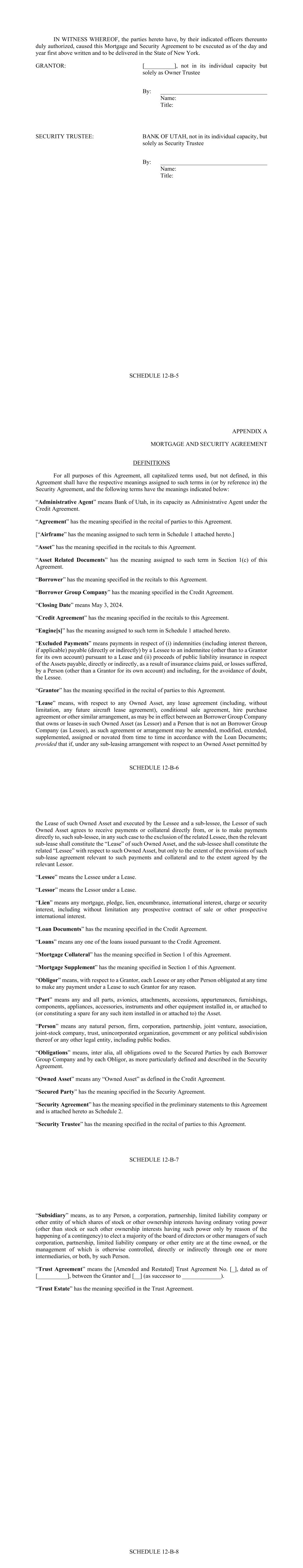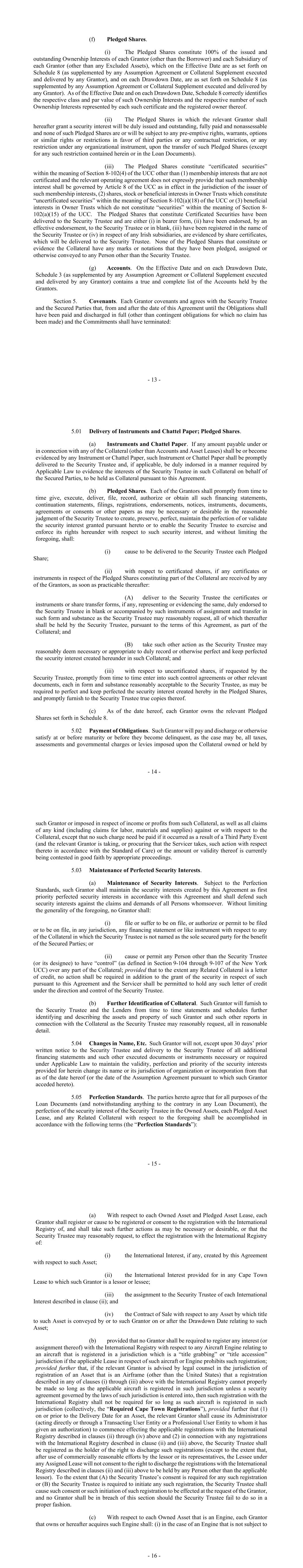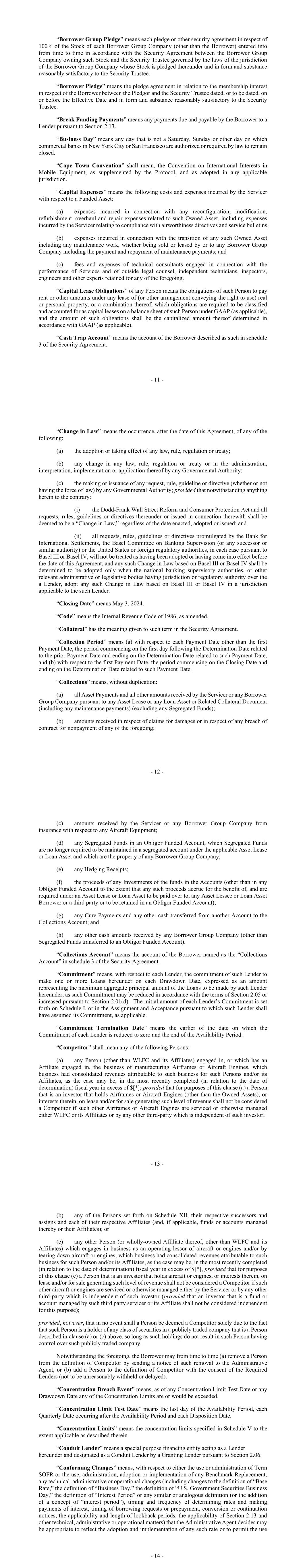 - 11 - “Borrower Group Pledge” means each pledge or other security agreement in respect of 100% of the Stock of each Borrower Group Company (other than the Borrower) entered into from time to time in accordance with the Security Agreement between the Borrower Group Company owning such Stock and the Security Trustee governed by the laws of the jurisdiction of the Borrower Group Company whose Stock is pledged thereunder and in form and substance reasonably satisfactory to the Security Trustee. “Borrower Pledge” means the pledge agreement in relation to the membership interest in respect of the Borrower between the Pledgor and the Security Trustee dated, or to be dated, on or before the Effective Date and in form and substance reasonably satisfactory to the Security Trustee. “Break Funding Payments” means any payments due and payable by the Borrower to a Lender pursuant to Section 2.13. “Business Day” means any day that is not a Saturday, Sunday or other day on which commercial banks in New York City or San Francisco are authorized or required by law to remain closed. “Cape Town Convention” shall mean, the Convention on International Interests in Mobile Equipment, as supplemented by the Protocol, and as adopted in any applicable jurisdiction. “Capital Expenses” means the following costs and expenses incurred by the Servicer with respect to a Funded Asset: (a) expenses incurred in connection with any reconfiguration, modification, refurbishment, overhaul and repair expenses related to such Owned Asset, including expenses incurred by the Servicer relating to compliance with airworthiness directives and service bulletins; (b) expenses incurred in connection with the transition of any such Owned Asset including any maintenance work, whether being sold or leased by or to any Borrower Group Company including the payment and repayment of maintenance payments; and (c) fees and expenses of technical consultants engaged in connection with the performance of Services and of outside legal counsel, independent technicians, inspectors, engineers and other experts retained for any of the foregoing. “Capital Lease Obligations” of any Person means the obligations of such Person to pay rent or other amounts under any lease of (or other arrangement conveying the right to use) real or personal property, or a combination thereof, which obligations are required to be classified and accounted for as capital leases on a balance sheet of such Person under GAAP (as applicable), and the amount of such obligations shall be the capitalized amount thereof determined in accordance with GAAP (as applicable). “Cash Trap Account” means the account of the Borrower described as such in schedule 3 of the Security Agreement. - 12 - “Change in Law” means the occurrence, after the date of this Agreement, of any of the following: (a) the adoption or taking effect of any law, rule, regulation or treaty; (b) any change in any law, rule, regulation or treaty or in the administration, interpretation, implementation or application thereof by any Governmental Authority; (c) the making or issuance of any request, rule, guideline or directive (whether or not having the force of law) by any Governmental Authority; provided that notwithstanding anything herein to the contrary: (i) the Dodd-Frank Wall Street Reform and Consumer Protection Act and all requests, rules, guidelines or directives thereunder or issued in connection therewith shall be deemed to be a “Change in Law,” regardless of the date enacted, adopted or issued; and (ii) all requests, rules, guidelines or directives promulgated by the Bank for International Settlements, the Basel Committee on Banking Supervision (or any successor or similar authority) or the United States or foreign regulatory authorities, in each case pursuant to Basel III or Basel IV, will not be treated as having been adopted or having come into effect before the date of this Agreement, and any such Change in Law based on Basel III or Basel IV shall be determined to be adopted only when the national banking supervisory authorities, or other relevant administrative or legislative bodies having jurisdiction or regulatory authority over the a Lender, adopt any such Change in Law based on Basel III or Basel IV in a jurisdiction applicable to the such Lender. “Closing Date” means May 3, 2024. “Code” means the Internal Revenue Code of 1986, as amended. “Collateral” has the meaning given to such term in the Security Agreement. “Collection Period” means (a) with respect to each Payment Date other than the first Payment Date, the period commencing on the first day following the Determination Date related to the prior Payment Date and ending on the Determination Date related to such Payment Date, and (b) with respect to the first Payment Date, the period commencing on the Closing Date and ending on the Determination Date related to such Payment Date. “Collections” means, without duplication: (a) all Asset Payments and all other amounts received by the Servicer or any Borrower Group Company pursuant to any Asset Lease or any Loan Asset or Related Collateral Document (including any maintenance payments) (excluding any Segregated Funds); (b) amounts received in respect of claims for damages or in respect of any breach of contract for nonpayment of any of the foregoing; - 13 - (c) amounts received by the Servicer or any Borrower Group Company from insurance with respect to any Aircraft Equipment; (d) any Segregated Funds in an Obligor Funded Account, which Segregated Funds are no longer required to be maintained in a segregated account under the applicable Asset Lease or Loan Asset and which are the property of any Borrower Group Company; (e) any Hedging Receipts; (f) the proceeds of any Investments of the funds in the Accounts (other than in any Obligor Funded Account to the extent that any such proceeds accrue for the benefit of, and are required under an Asset