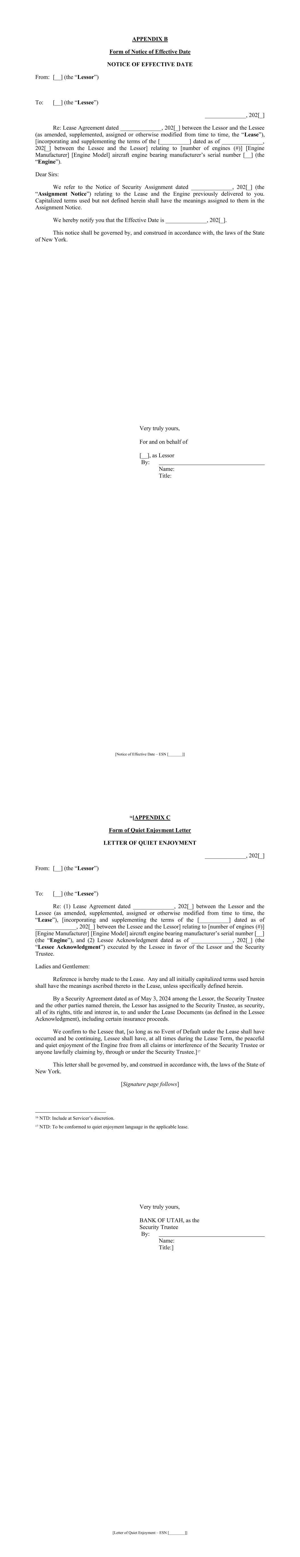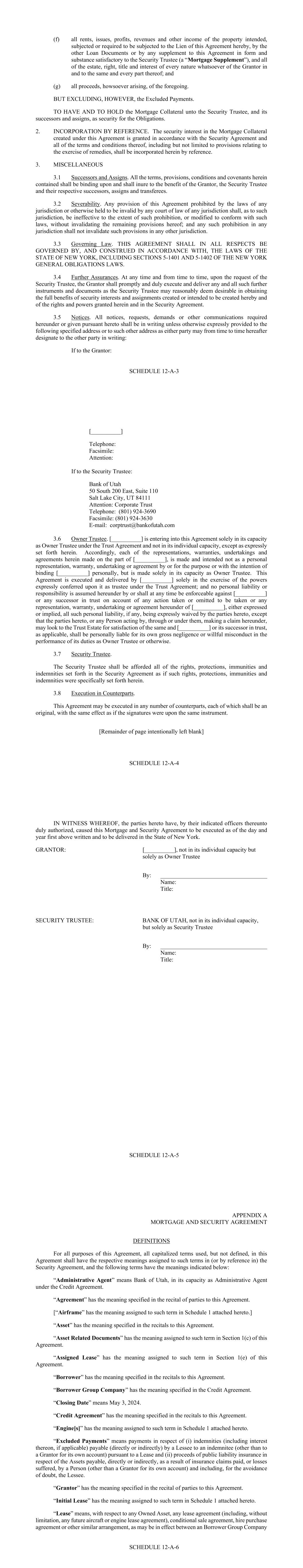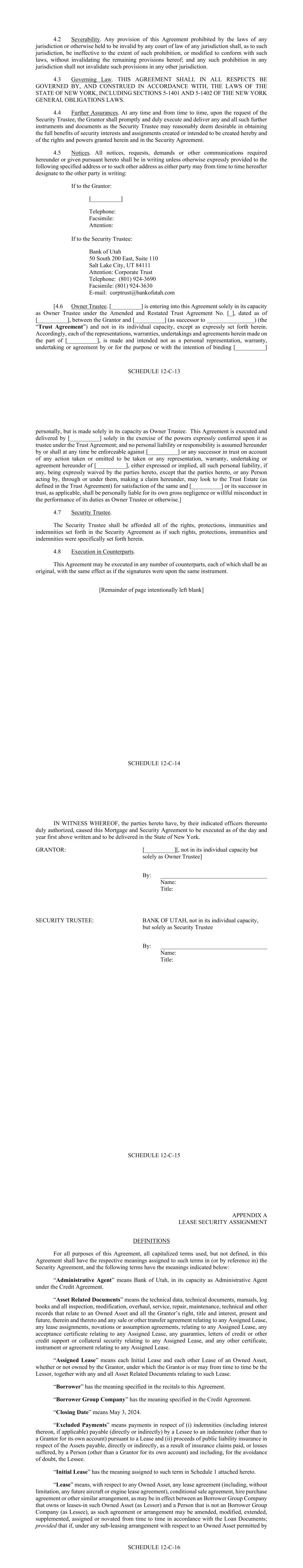 - 11 - “Borrower Group Pledge” means each pledge or other security agreement in respect of 100% of the Stock of each Borrower Group Company (other than the Borrower) entered into from time to time in accordance with the Security Agreement between the Borrower Group Company owning such Stock and the Security Trustee governed by the laws of the jurisdiction of the Borrower Group Company whose Stock is pledged thereunder and in form and substance reasonably satisfactory to the Security Trustee. “Borrower Pledge” means the pledge agreement in relation to the membership interest in respect of the Borrower between the Pledgor and the Security Trustee dated, or to be dated, on or before the Effective Date and in form and substance reasonably satisfactory to the Security Trustee. “Break Funding Payments” means any payments due and payable by the Borrower to a Lender pursuant to Section 2.13. “Business Day” means any day that is not a Saturday, Sunday or other day on which commercial banks in New York City or San Francisco are authorized or required by law to remain closed. “Cape Town Convention” shall mean, the Convention on International Interests in Mobile Equipment, as supplemented by the Protocol, and as adopted in any applicable jurisdiction. “Capital Expenses” means the following costs and expenses incurred by the Servicer with respect to a Funded Asset: (a) expenses incurred in connection with any reconfiguration, modification, refurbishment, overhaul and repair expenses related to such Owned Asset, including expenses incurred by the Servicer relating to compliance with airworthiness directives and service bulletins; (b) expenses incurred in connection with the transition of any such Owned Asset including any maintenance work, whether being sold or leased by or to any Borrower Group Company including the payment and repayment of maintenance payments; and (c) fees and expenses of technical consultants engaged in connection with the performance of Services and of outside legal counsel, independent technicians, inspectors, engineers and other experts retained for any of the foregoing. “Capital Lease Obligations” of any Person means the obligations of such Person to pay rent or other amounts under any lease of (or other arrangement conveying the right to use) real or personal property, or a combination thereof, which obligations are required to be classified and accounted for as capital leases on a balance sheet of such Person under GAAP (as applicable), and the amount of such obligations shall be the capitalized amount thereof determined in accordance with GAAP (as applicable). “Cash Trap Account” means the account of the Borrower described as such in schedule 3 of the Security Agreement. - 12 - “Change in Law” means the occurrence, after the date of this Agreement, of any of the following: (a) the adoption or taking effect of any law, rule, regulation or treaty; (b) any change in any law, rule, regulation or treaty or in the administration, interpretation, implementation or application thereof by any Governmental Authority; (c) the making or issuance of any request, rule, guideline or directive (whether or not having the force of law) by any Governmental Authority; provided that notwithstanding anything herein to the contrary: (i) the Dodd-Frank Wall Street Reform and Consumer Protection Act and all requests, rules, guidelines or directives thereunder or issued in connection therewith shall be deemed to be a “Change in Law,” regardless of the date enacted, adopted or issued; and (ii) all requests, rules, guidelines or directives promulgated by the Bank for International Settlements, the Basel Committee on Banking Supervision (or any successor or similar authority) or the United States or foreign regulatory authorities, in each case pursuant to Basel III or Basel IV, will not be treated as having been adopted or having come into effect before the date of this Agreement, and any such Change in Law based on Basel III or Basel IV shall be determined to be adopted only when the national banking supervisory authorities, or other relevant administrative or legislative bodies having jurisdiction or regulatory authority over the a Lender, adopt any such Change in Law based on Basel III or Basel IV in a jurisdiction applicable to the such Lender. “Closing Date” means May 3, 2024. “Code” means the Internal Revenue Code of 1986, as amended. “Collateral” has the meaning given to such term in the Security Agreement. “Collection Period” means (a) with respect to each Payment Date other than the first Payment Date, the period commencing on the first day following the Determination Date related to the prior Payment Date and ending on the Determination Date related to such Payment Date, and (b) with respect to the first Payment Date, the period commencing on the Closing Date and ending on the Determination Date related to such Payment Date. “Collections” means, without duplication: (a) all Asset Payments and all other amounts received by the Servicer or any Borrower Group Company pursuant to any Asset Lease or any Loan Asset or Related Collateral Document (including any maintenance payments) (excluding any Segregated Funds); (b) amounts received in respect of claims for damages or in respect of any breach of contract for nonpayment of any of the foregoing; - 13 - (c) amounts received by the Servicer or any Borrower Group Company from insurance with respect to any Aircraft Equipment; (d) any Segregated Funds in an Obligor Funded Account, which Segregated Funds are no longer required to be maintained in a segregated account under the applicable Asset Lease or Loan Asset and which are the property of any Borrower Group Company; (e) any Hedging Receipts; (f) the proceeds of any Investments of the funds in the Accounts (other than in any Obligor Funded Account to the extent that any such proceeds accrue for the benefit of, and are required under an Asset