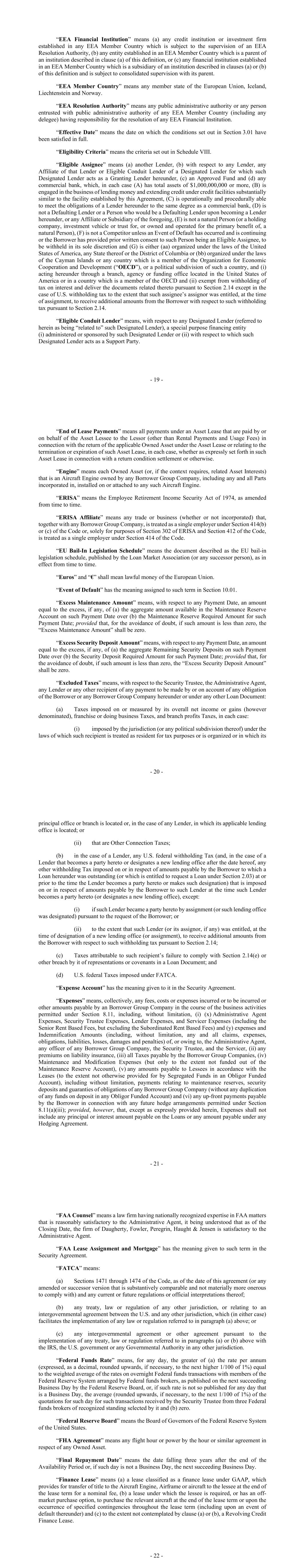 - 19 - “EEA Financial Institution” means (a) any credit institution or investment firm established in any EEA Member Country which is subject to the supervision of an EEA Resolution Authority, (b) any entity established in an EEA Member Country which is a parent of an institution described in clause (a) of this definition, or (c) any financial institution established in an EEA Member Country which is a subsidiary of an institution described in clauses (a) or (b) of this definition and is subject to consolidated supervision with its parent. “EEA Member Country” means any member state of the European Union, Iceland, Liechtenstein and Norway. “EEA Resolution Authority” means any public administrative authority or any person entrusted with public administrative authority of any EEA Member Country (including any delegee) having responsibility for the resolution of any EEA Financial Institution. “Effective Date” means the date on which the conditions set out in Section 3.01 have been satisfied in full. “Eligibility Criteria” means the criteria set out in Schedule VIII. “Eligible Assignee” means (a) another Lender, (b) with respect to any Lender, any Affiliate of that Lender or Eligible Conduit Lender of a Designated Lender for which such Designated Lender acts as a Granting Lender hereunder, (c) an Approved Fund and (d) any commercial bank, which, in each case (A) has total assets of $1,000,000,000 or more, (B) is engaged in the business of lending money and extending credit under credit facilities substantially similar to the facility established by this Agreement, (C) is operationally and procedurally able to meet the obligations of a Lender hereunder to the same degree as a commercial bank, (D) is not a Defaulting Lender or a Person who would be a Defaulting Lender upon becoming a Lender hereunder, or any Affiliate or Subsidiary of the foregoing, (E) is not a natural Person (or a holding company, investment vehicle or trust for, or owned and operated for the primary benefit of, a natural Person), (F) is not a Competitor unless an Event of Default has occurred and is continuing or the Borrower has provided prior written consent to such Person being an Eligible Assignee, to be withheld in its sole discretion and (G) is either (aa) organized under the laws of the United States of America, any State thereof or the District of Columbia or (bb) organized under the laws of the Cayman Islands or any country which is a member of the Organization for Economic Cooperation and Development (“OECD”), or a political subdivision of such a country, and (i) acting hereunder through a branch, agency or funding office located in the United States of America or in a country which is a member of the OECD and (ii) exempt from withholding of tax on interest and deliver the documents related thereto pursuant to Section 2.14 except in the case of U.S. withholding tax to the extent that such assignee’s assignor was entitled, at the time of assignment, to receive additional amounts from the Borrower with respect to such withholding tax pursuant to Section 2.14. “Eligible Conduit Lender” means, with respect to any Designated Lender (referred to herein as being “related to” such Designated Lender), a special purpose financing entity (i) administered or sponsored by such Designated Lender or (ii) with respect to which such Designated Lender acts as a Support Party. - 20 - “End of Lease Payments” means all payments under an Asset Lease that are paid by or on behalf of the Asset Lessee to the Lessor (other than Rental Payments and Usage Fees) in connection with the return of the applicable Owned Asset under the Asset Lease or relating to the termination or expiration of such Asset Lease, in each case, whether as expressly set forth in such Asset Lease in connection with a return condition settlement or otherwise. “Engine” means each Owned Asset (or, if the context requires, related Asset Interests) that is an Aircraft Engine owned by any Borrower Group Company, including any and all Parts incorporated in, installed on or attached to any such Aircraft Engine. “ERISA” means the Employee Retirement Income Security Act of 1974, as amended from time to time. “ERISA Affiliate” means any trade or business (whether or not incorporated) that, together with any Borrower Group Company, is treated as a single employer under Section 414(b) or (c) of the Code or, solely for purposes of Section 302 of ERISA and Section 412 of the Code, is treated as a single employer under Section 414 of the Code. “EU Bail-In Legislation Schedule” means the document described as the EU bail-in legislation schedule, published by the Loan Market Association (or any successor person), as in effect from time to time. “Euros” and “€” shall mean lawful money of the European Union. “Event of Default” has the meaning assigned to such term in Section 10.01. “Excess Maintenance Amount” means, with respect to any Payment Date, an amount equal to the excess, if any, of (a) the aggregate amount available in the Maintenance Reserve Account on such Payment Date over (b) the Maintenance Reserve Required Amount for such Payment Date; provided that, for the avoidance of doubt, if such amount is less than zero, the “Excess Maintenance Amount” shall be zero. “Excess Security Deposit Amount” means, with respect to any Payment Date, an amount equal to the excess, if any, of (a) the aggregate Remaining Security Deposits on such Payment Date over (b) the Security Deposit Required Amount for such Payment Date; provided that, for the avoidance of doubt, if such amount is less than zero, the “Excess Security Deposit Amount” shall be zero. “Excluded Taxes” means, with respect to the Security Trustee, the Administrative Agent, any Lender or any other recipient of any payment to be made by or on account of any obligation of the Borrower or any Borrower Group Company hereunder or under any othe