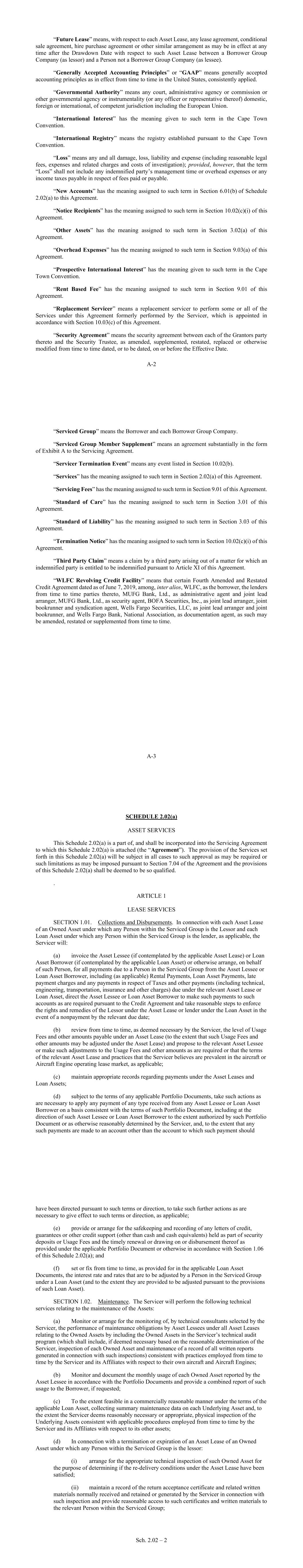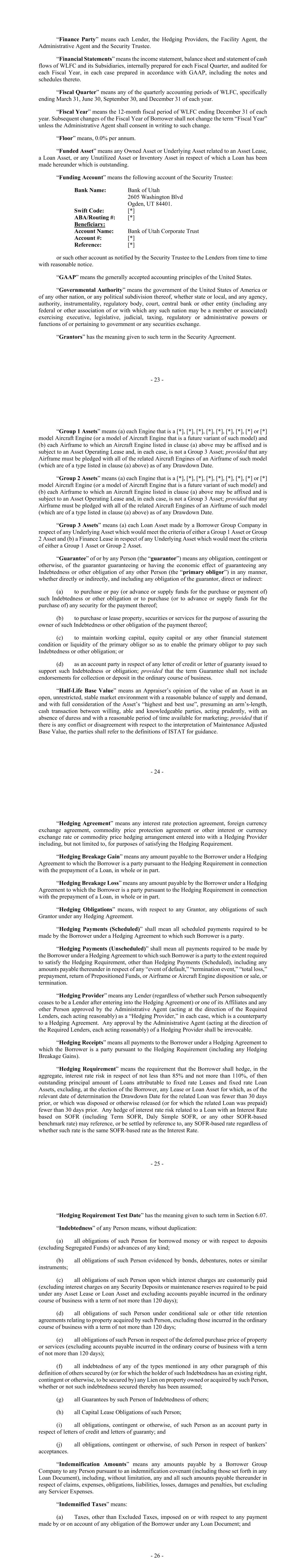 - 23 - “Finance Party” means each Lender, the Hedging Providers, the Facility Agent, the Administrative Agent and the Security Trustee. “Financial Statements” means the income statement, balance sheet and statement of cash flows of WLFC and its Subsidiaries, internally prepared for each Fiscal Quarter, and audited for each Fiscal Year, in each case prepared in accordance with GAAP, including the notes and schedules thereto. “Fiscal Quarter” means any of the quarterly accounting periods of WLFC, specifically ending March 31, June 30, September 30, and December 31 of each year. “Fiscal Year” means the 12-month fiscal period of WLFC ending December 31 of each year. Subsequent changes of the Fiscal Year of Borrower shall not change the term “Fiscal Year” unless the Administrative Agent shall consent in writing to such change. “Floor” means, 0.0% per annum. “Funded Asset” means any Owned Asset or Underlying Asset related to an Asset Lease, a Loan Asset, or any Unutilized Asset or Inventory Asset in respect of which a Loan has been made hereunder which is outstanding. “Funding Account” means the following account of the Security Trustee: Bank Name: Bank of Utah 2605 Washington Blvd Ogden, UT 84401. Swift Code: [*] ABA/Routing #: [*] Beneficiary: Account Name: Bank of Utah Corporate Trust Account #: [*] Reference: [*] or such other account as notified by the Security Trustee to the Lenders from time to time with reasonable notice. “GAAP” means the generally accepted accounting principles of the United States. “Governmental Authority” means the government of the United States of America or of any other nation, or any political subdivision thereof, whether state or local, and any agency, authority, instrumentality, regulatory body, court, central bank or other entity (including any federal or other association of or with which any such nation may be a member or associated) exercising executive, legislative, judicial, taxing, regulatory or administrative powers or functions of or pertaining to government or any securities exchange. “Grantors” has the meaning given to such term in the Security Agreement. - 24 - “Group 1 Assets” means (a) each Engine that is a [*], [*], [*], [*], [*], [*], [*], [*] or [*] model Aircraft Engine (or a model of Aircraft Engine that is a future variant of such model) and (b) each Airframe to which an Aircraft Engine listed in clause (a) above may be affixed and is subject to an Asset Operating Lease and, in each case, is not a Group 3 Asset; provided that any Airframe must be pledged with all of the related Aircraft Engines of an Airframe of such model (which are of a type listed in clause (a) above) as of any Drawdown Date. “Group 2 Assets” means (a) each Engine that is a [*], [*], [*], [*], [*], [*], [*], [*] or [*] model Aircraft Engine (or a model of Aircraft Engine that is a future variant of such model) and (b) each Airframe to which an Aircraft Engine listed in clause (a) above may be affixed and is subject to an Asset Operating Lease and, in each case, is not a Group 3 Asset; provided that any Airframe must be pledged with all of the related Aircraft Engines of an Airframe of such model (which are of a type listed in clause (a) above) as of any Drawdown Date. “Group 3 Assets” means (a) each Loan Asset made by a Borrower Group Company in respect of any Underlying Asset which would meet the criteria of either a Group 1 Asset or Group 2 Asset and (b) a Finance Lease in respect of any Underlying Asset which would meet the criteria of either a Group 1 Asset or Group 2 Asset. “Guarantee” of or by any Person (the “guarantor”) means any obligation, contingent or otherwise, of the guarantor guaranteeing or having the economic effect of guaranteeing any Indebtedness or other obligation of any other Person (the “primary obligor”) in any manner, whether directly or indirectly, and including any obligation of the guarantor, direct or indirect: (a) to purchase or pay (or advance or supply funds for the purchase or payment of) such Indebtedness or other obligation or to purchase (or to advance or supply funds for the purchase of) any security for the payment thereof; (b) to purchase or lease property, securities or services for the purpose of assuring the owner of such Indebtedness or other obligation of the payment thereof; (c) to maintain working capital, equity capital or any other financial statement condition or liquidity of the primary obligor so as to enable the primary obligor to pay such Indebtedness or other obligation; or (d) as an account party in respect of any letter of credit or letter of guaranty issued to support such Indebtedness or obligation; provided that the term Guarantee shall not include endorsements for collection or deposit in the ordinary course of business. “Half-Life Base Value” means an Appraiser’s opinion of the value of an Asset in an open, unrestricted, stable market environment with a reasonable balance of supply and demand, and with full consideration of the Asset’s “highest and best use”, presuming an arm’s-length, cash transaction between willing, able and knowledgeable parties, acting prudently, with an absence of duress and with a reasonable period of time available for marketing; provided that if there is any conflict or disagreement with respect to the interpretation of Maintenance Adjusted Base Value, the parties shall refer to the definitions of ISTAT for guidance. - 25 - “Hedging Agreement” means any interest rate protection agreement, foreign currency exchange agreement, commodity price protection agreement or other interest or currency exchange rate or commodity price hedging arrangement entered into with a Hedging Provider including, but not limited to, for purposes of satisfying the Hedging Requirement. “Hedging Breakage Gain” means any amount payable to the Borrower under a Hedging Agreement to which the Borrower is a party pursuant to the
