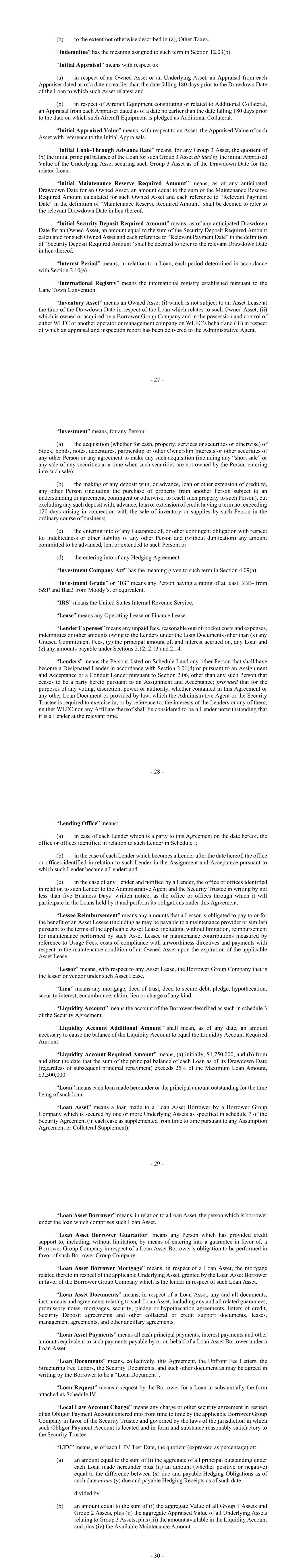 - 27 - (b) to the extent not otherwise described in (a), Other Taxes. “Indemnitee” has the meaning assigned to such term in Section 12.03(b). “Initial Appraisal” means with respect to: (a) in respect of an Owned Asset or an Underlying Asset, an Appraisal from each Appraiser dated as of a date no earlier than the date falling 180 days prior to the Drawdown Date of the Loan to which such Asset relates; and (b) in respect of Aircraft Equipment constituting or related to Additional Collateral, an Appraisal from each Appraiser dated as of a date no earlier than the date falling 180 days prior to the date on which such Aircraft Equipment is pledged as Additional Collateral. “Initial Appraised Value” means, with respect to an Asset, the Appraised Value of such Asset with reference to the Initial Appraisals. “Initial Look-Through Advance Rate” means, for any Group 3 Asset, the quotient of (x) the initial principal balance of the Loan for such Group 3 Asset divided by the initial Appraised Value of the Underlying Asset securing such Group 3 Asset as of the Drawdown Date for the related Loan. “Initial Maintenance Reserve Required Amount” means, as of any anticipated Drawdown Date for an Owned Asset, an amount equal to the sum of the Maintenance Reserve Required Amount calculated for such Owned Asset and each reference to “Relevant Payment Date” in the definition of “Maintenance Reserve Required Amount” shall be deemed to refer to the relevant Drawdown Date in lieu thereof. “Initial Security Deposit Required Amount” means, as of any anticipated Drawdown Date for an Owned Asset, an amount equal to the sum of the Security Deposit Required Amount calculated for such Owned Asset and each reference to “Relevant Payment Date” in the definition of “Security Deposit Required Amount” shall be deemed to refer to the relevant Drawdown Date in lieu thereof. “Interest Period” means, in relation to a Loan, each period determined in accordance with Section 2.10(e). “International Registry” means the international registry established pursuant to the Cape Town Convention. “Inventory Asset” means an Owned Asset (i) which is not subject to an Asset Lease at the time of the Drawdown Date in respect of the Loan which relates to such Owned Asset, (ii) which is owned or acquired by a Borrower Group Company and in the possession and control of either WLFC or another operator or management company on WLFC’s behalf and (iii) in respect of which an appraisal and inspection report has been delivered to the Administrative Agent. - 28 - “Investment” means, for any Person: (a) the acquisition (whether for cash, property, services or securities or otherwise) of Stock, bonds, notes, debentures, partnership or other Ownership Interests or other securities of any other Person or any agreement to make any such acquisition (including any “short sale” or any sale of any securities at a time when such securities are not owned by the Person entering into such sale); (b) the making of any deposit with, or advance, loan or other extension of credit to, any other Person (including the purchase of property from another Person subject to an understanding or agreement, contingent or otherwise, to resell such property to such Person), but excluding any such deposit with, advance, loan or extension of credit having a term not exceeding 120 days arising in connection with the sale of inventory or supplies by such Person in the ordinary course of business; (c) the entering into of any Guarantee of, or other contingent obligation with respect to, Indebtedness or other liability of any other Person and (without duplication) any amount committed to be advanced, lent or extended to such Person; or (d) the entering into of any Hedging Agreement. “Investment Company Act” has the meaning given to such term in Section 4.09(a). “Investment Grade” or “IG” means any Person having a rating of at least BBB- from S&P and Baa3 from Moody’s, or equivalent. “IRS” means the United States Internal Revenue Service. “Lease” means any Operating Lease or Finance Lease. “Lender Expenses” means any unpaid fees, reasonable out-of-pocket costs and expenses, indemnities or other amounts owing to the Lenders under the Loan Documents other than (x) any Unused Commitment Fees, (y) the principal amount of, and interest accrued on, any Loan and (z) any amounts payable under Sections 2.12, 2.13 and 2.14. “Lenders” means the Persons listed on Schedule I and any other Person that shall have become a Designated Lender in accordance with Section 2.01(d) or pursuant to an Assignment and Acceptance or a Conduit Lender pursuant to Section 2.06, other than any such Person that ceases to be a party hereto pursuant to an Assignment and Acceptance; provided that for the purposes of any voting, discretion, power or authority, whether contained in this Agreement or any other Loan Document or provided by law, which the Administrative Agent or the Security Trustee is required to exercise in, or by reference to, the interests of the Lenders or any of them, neither WLFC nor any Affiliate thereof shall be considered to be a Lender notwithstanding that it is a Lender at the relevant time. - 29 - “Lending Office” means: (a) in case of each Lender which is a party to this Agreement on the date hereof, the office or offices identified in relation to such Lender in Schedule I; (b) in the case of each Lender which becomes a Lender after the date hereof, the office or offices identified in relation to such Lender in the Assignment and Acceptance pursuant to which such Lender became a Lender; and (c) in the case of any Lender and notified by a Lender, the office or offices identified in relation to such Lender to the Administrative Agent and the Security Trustee in writing by not less than five Business Days’ written notice, as the office or offices through which it will participate in the Loans held by it an