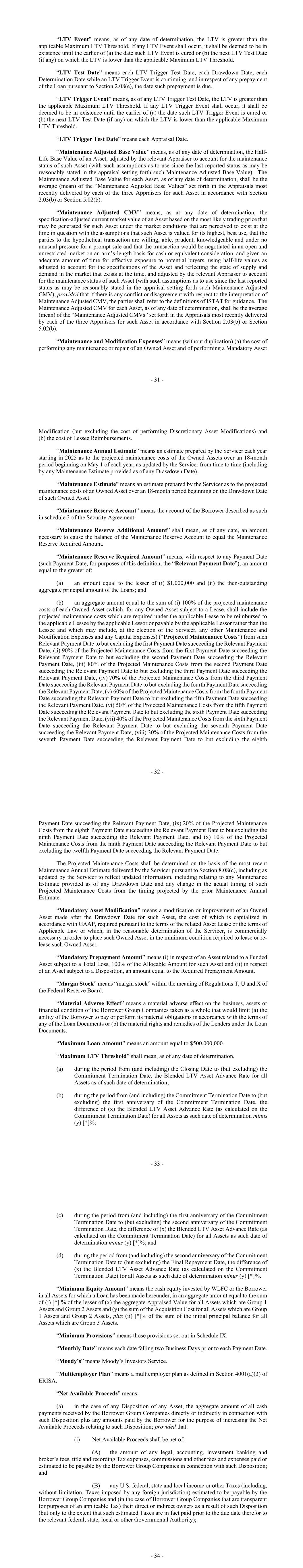 - 31 - “LTV Event” means, as of any date of determination, the LTV is greater than the applicable Maximum LTV Threshold. If any LTV Event shall occur, it shall be deemed to be in existence until the earlier of (a) the date such LTV Event is cured or (b) the next LTV Test Date (if any) on which the LTV is lower than the applicable Maximum LTV Threshold. “LTV Test Date” means each LTV Trigger Test Date, each Drawdown Date, each Determination Date while an LTV Trigger Event is continuing, and in respect of any prepayment of the Loan pursuant to Section 2.08(e), the date such prepayment is due. “LTV Trigger Event” means, as of any LTV Trigger Test Date, the LTV is greater than the applicable Maximum LTV Threshold. If any LTV Trigger Event shall occur, it shall be deemed to be in existence until the earlier of (a) the date such LTV Trigger Event is cured or (b) the next LTV Test Date (if any) on which the LTV is lower than the applicable Maximum LTV Threshold. “LTV Trigger Test Date” means each Appraisal Date. “Maintenance Adjusted Base Value” means, as of any date of determination, the Half- Life Base Value of an Asset, adjusted by the relevant Appraiser to account for the maintenance status of such Asset (with such assumptions as to use since the last reported status as may be reasonably stated in the appraisal setting forth such Maintenance Adjusted Base Value). The Maintenance Adjusted Base Value for each Asset, as of any date of determination, shall be the average (mean) of the “Maintenance Adjusted Base Values” set forth in the Appraisals most recently delivered by each of the three Appraisers for such Asset in accordance with Section 2.03(b) or Section 5.02(b). “Maintenance Adjusted CMV” means, as at any date of determination, the specification-adjusted current market value of an Asset based on the most likely trading price that may be generated for such Asset under the market conditions that are perceived to exist at the time in question with the assumptions that such Asset is valued for its highest, best use, that the parties to the hypothetical transaction are willing, able, prudent, knowledgeable and under no unusual pressure for a prompt sale and that the transaction would be negotiated in an open and unrestricted market on an arm’s-length basis for cash or equivalent consideration, and given an adequate amount of time for effective exposure to potential buyers, using half-life values as adjusted to account for the specifications of the Asset and reflecting the state of supply and demand in the market that exists at the time, and adjusted by the relevant Appraiser to account for the maintenance status of such Asset (with such assumptions as to use since the last reported status as may be reasonably stated in the appraisal setting forth such Maintenance Adjusted CMV); provided that if there is any conflict or disagreement with respect to the interpretation of Maintenance Adjusted CMV, the parties shall refer to the definitions of ISTAT for guidance. The Maintenance Adjusted CMV for each Asset, as of any date of determination, shall be the average (mean) of the “Maintenance Adjusted CMVs” set forth in the Appraisals most recently delivered by each of the three Appraisers for such Asset in accordance with Section 2.03(b) or Section 5.02(b). “Maintenance and Modification Expenses” means (without duplication) (a) the cost of performing any maintenance or repair of an Owned Asset and of performing a Mandatory Asset - 32 - Modification (but excluding the cost of performing Discretionary Asset Modifications) and (b) the cost of Lessee Reimbursements. “Maintenance Annual Estimate” means an estimate prepared by the Servicer each year starting in 2025 as to the projected maintenance costs of the Owned Assets over an 18-month period beginning on May 1 of each year, as updated by the Servicer from time to time (including by any Maintenance Estimate provided as of any Drawdown Date). “Maintenance Estimate” means an estimate prepared by the Servicer as to the projected maintenance costs of an Owned Asset over an 18-month period beginning on the Drawdown Date of such Owned Asset. “Maintenance Reserve Account” means the account of the Borrower described as such in schedule 3 of the Security Agreement. “Maintenance Reserve Additional Amount” shall mean, as of any date, an amount necessary to cause the balance of the Maintenance Reserve Account to equal the Maintenance Reserve Required Amount. “Maintenance Reserve Required Amount” means, with respect to any Payment Date (such Payment Date, for purposes of this definition, the “Relevant Payment Date”), an amount equal to the greater of: (a) an amount equal to the lesser of (i) $1,000,000 and (ii) the then-outstanding aggregate principal amount of the Loans; and (b) an aggregate amount equal to the sum of (i) 100% of the projected maintenance costs of each Owned Asset (which, for any Owned Asset subject to a Lease, shall include the projected maintenance costs which are required under the applicable Lease to be reimbursed to the applicable Lessee by the applicable Lessor or payable by the applicable Lessor rather than the Lessee and which may include, at the election of the Servicer, any other Maintenance and Modification Expenses and any Capital Expenses) (“Projected Maintenance Costs”) from such Relevant Payment Date to but excluding the first Payment Date succeeding the Relevant Payment Date, (ii) 90% of the Projected Maintenance Costs from the first Payment Date succeeding the Relevant Payment Date to but excluding the second Payment Date succeeding the Relevant Payment Date, (iii) 80% of the Projected Maintenance Costs from the second Payment Date succeeding the Relevant Payment Date to but excluding the third Payment Date succeeding the Relevant Payment Date, (iv) 70% of the Projected Maintenance Costs from the third Payment Date succeeding the Relevant Payment Date to but excludi