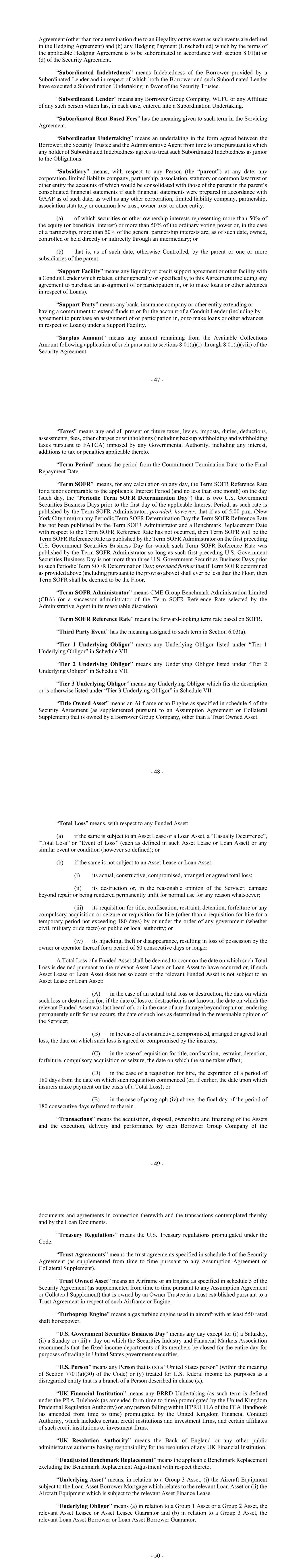 - 47 - Agreement (other than for a termination due to an illegality or tax event as such events are defined in the Hedging Agreement) and (b) any Hedging Payment (Unscheduled) which by the terms of the applicable Hedging Agreement is to be subordinated in accordance with section 8.01(a) or (d) of the Security Agreement. “Subordinated Indebtedness” means Indebtedness of the Borrower provided by a Subordinated Lender and in respect of which both the Borrower and such Subordinated Lender have executed a Subordination Undertaking in favor of the Security Trustee. “Subordinated Lender” means any Borrower Group Company, WLFC or any Affiliate of any such person which has, in each case, entered into a Subordination Undertaking. “Subordinated Rent Based Fees” has the meaning given to such term in the Servicing Agreement. “Subordination Undertaking” means an undertaking in the form agreed between the Borrower, the Security Trustee and the Administrative Agent from time to time pursuant to which any holder of Subordinated Indebtedness agrees to treat such Subordinated Indebtedness as junior to the Obligations. “Subsidiary” means, with respect to any Person (the “parent”) at any date, any corporation, limited liability company, partnership, association, statutory or common law trust or other entity the accounts of which would be consolidated with those of the parent in the parent’s consolidated financial statements if such financial statements were prepared in accordance with GAAP as of such date, as well as any other corporation, limited liability company, partnership, association statutory or common law trust, owner trust or other entity: (a) of which securities or other ownership interests representing more than 50% of the equity (or beneficial interest) or more than 50% of the ordinary voting power or, in the case of a partnership, more than 50% of the general partnership interests are, as of such date, owned, controlled or held directly or indirectly through an intermediary; or (b) that is, as of such date, otherwise Controlled, by the parent or one or more subsidiaries of the parent. “Support Facility” means any liquidity or credit support agreement or other facility with a Conduit Lender which relates, either generally or specifically, to this Agreement (including any agreement to purchase an assignment of or participation in, or to make loans or other advances in respect of Loans). “Support Party” means any bank, insurance company or other entity extending or having a commitment to extend funds to or for the account of a Conduit Lender (including by agreement to purchase an assignment of or participation in, or to make loans or other advances in respect of Loans) under a Support Facility. “Surplus Amount” means any amount remaining from the Available Collections Amount following application of such pursuant to sections 8.01(a)(i) through 8.01(a)(viii) of the Security Agreement. - 48 - “Taxes” means any and all present or future taxes, levies, imposts, duties, deductions, assessments, fees, other charges or withholdings (including backup withholding and withholding taxes pursuant to FATCA) imposed by any Governmental Authority, including any interest, additions to tax or penalties applicable thereto. “Term Period” means the period from the Commitment Termination Date to the Final Repayment Date. “Term SOFR” means, for any calculation on any day, the Term SOFR Reference Rate for a tenor comparable to the applicable Interest Period (and no less than one month) on the day (such day, the “Periodic Term SOFR Determination Day”) that is two U.S. Government Securities Business Days prior to the first day of the applicable Interest Period, as such rate is published by the Term SOFR Administrator; provided, however, that if as of 5:00 p.m. (New York City time) on any Periodic Term SOFR Determination Day the Term SOFR Reference Rate has not been published by the Term SOFR Administrator and a Benchmark Replacement Date with respect to the Term SOFR Reference Rate has not occurred, then Term SOFR will be the Term SOFR Reference Rate as published by the Term SOFR Administrator on the first preceding U.S. Government Securities Business Day for which such Term SOFR Reference Rate was published by the Term SOFR Administrator so long as such first preceding U.S. Government Securities Business Day is not more than three U.S. Government Securities Business Days prior to such Periodic Term SOFR Determination Day; provided further that if Term SOFR determined as provided above (including pursuant to the proviso above) shall ever be less than the Floor, then Term SOFR shall be deemed to be the Floor. “Term SOFR Administrator” means CME Group Benchmark Administration Limited (CBA) (or a successor administrator of the Term SOFR Reference Rate selected by the Administrative Agent in its reasonable discretion). “Term SOFR Reference Rate” means the forward-looking term rate based on SOFR. “Third Party Event” has the meaning assigned to such term in Section 6.03(a). “Tier 1 Underlying Obligor” means any Underlying Obligor listed under “Tier 1 Underlying Obligor” in Schedule VII. “Tier 2 Underlying Obligor” means any Underlying Obligor listed under “Tier 2 Underlying Obligor” in Schedule VII. “Tier 3 Underlying Obligor” means any Underlying Obligor which fits the description or is otherwise listed under “Tier 3 Underlying Obligor” in Schedule VII. “Title Owned Asset” means an Airframe or an Engine as specified in schedule 5 of the Security Agreement (as supplemented pursuant to an Assumption Agreement or Collateral Supplement) that is owned by a Borrower Group Company, other than a Trust Owned Asset. - 49 - “Total Loss” means, with respect to any Funded Asset: (a) if the same is subject to an Asset Lease or a Loan Asset, a “Casualty Occurrence”, “Total Loss” or “Event of Loss” (each as defined in such Asset Lease