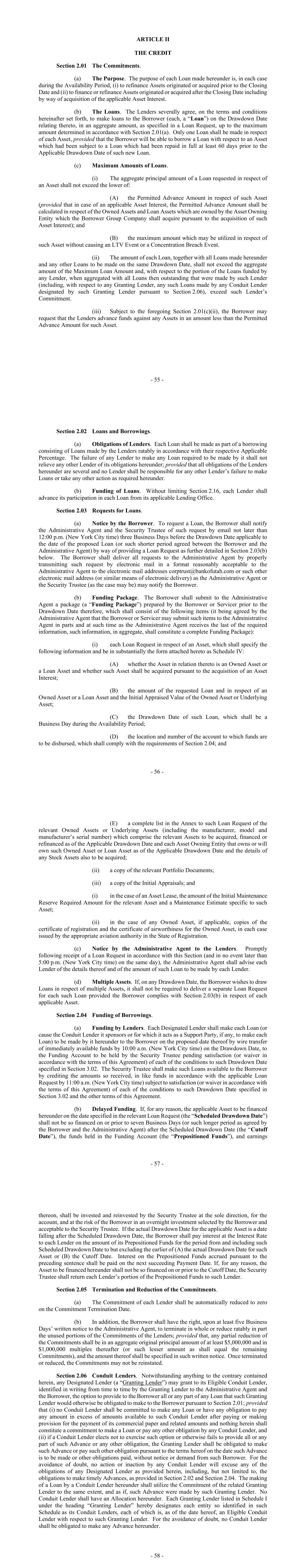 - 55 - ARTICLE II THE CREDIT Section 2.01 The Commitments. (a) The Purpose. The purpose of each Loan made hereunder is, in each case during the Availability Period, (i) to refinance Assets originated or acquired prior to the Closing Date and (ii) to finance or refinance Assets originated or acquired after the Closing Date including by way of acquisition of the applicable Asset Interest. (b) The Loans. The Lenders severally agree, on the terms and conditions hereinafter set forth, to make loans to the Borrower (each, a “Loan”) on the Drawdown Date relating thereto, in an aggregate amount, as specified in a Loan Request, up to the maximum amount determined in accordance with Section 2.01(a). Only one Loan shall be made in respect of each Asset, provided that the Borrower will be able to borrow a Loan with respect to an Asset which had been subject to a Loan which had been repaid in full at least 60 days prior to the Applicable Drawdown Date of such new Loan. (c) Maximum Amounts of Loans. (i) The aggregate principal amount of a Loan requested in respect of an Asset shall not exceed the lower of: (A) the Permitted Advance Amount in respect of such Asset (provided that in case of an applicable Asset Interest, the Permitted Advance Amount shall be calculated in respect of the Owned Assets and Loan Assets which are owned by the Asset Owning Entity which the Borrower Group Company shall acquire pursuant to the acquisition of such Asset Interest); and (B) the maximum amount which may be utilized in respect of such Asset without causing an LTV Event or a Concentration Breach Event. (ii) The amount of each Loan, together with all Loans made hereunder and any other Loans to be made on the same Drawdown Date, shall not exceed the aggregate amount of the Maximum Loan Amount and, with respect to the portion of the Loans funded by any Lender, when aggregated with all Loans then outstanding that were made by such Lender (including, with respect to any Granting Lender, any such Loans made by any Conduit Lender designated by such Granting Lender pursuant to Section 2.06), exceed such Lender’s Commitment. (iii) Subject to the foregoing Section 2.01(c)(ii), the Borrower may request that the Lenders advance funds against any Assets in an amount less than the Permitted Advance Amount for such Asset. - 56 - Section 2.02 Loans and Borrowings. (a) Obligations of Lenders. Each Loan shall be made as part of a borrowing consisting of Loans made by the Lenders ratably in accordance with their respective Applicable Percentage. The failure of any Lender to make any Loan required to be made by it shall not relieve any other Lender of its obligations hereunder; provided that all obligations of the Lenders hereunder are several and no Lender shall be responsible for any other Lender’s failure to make Loans or take any other action as required hereunder. (b) Funding of Loans. Without limiting Section 2.16, each Lender shall advance its participation in each Loan from its applicable Lending Office. Section 2.03 Requests for Loans. (a) Notice by the Borrower. To request a Loan, the Borrower shall notify the Administrative Agent and the Security Trustee of such request by email not later than 12:00 p.m. (New York City time) three Business Days before the Drawdown Date applicable to the date of the proposed Loan (or such shorter period agreed between the Borrower and the Administrative Agent) by way of providing a Loan Request as further detailed in Section 2.03(b) below. The Borrower shall deliver all requests to the Administrative Agent by properly transmitting such request by electronic mail in a format reasonably acceptable to the Administrative Agent to the electronic mail addresses corptrust@bankofutah.com or such other electronic mail address (or similar means of electronic delivery) as the Administrative Agent or the Security Trustee (as the case may be) may notify the Borrower. (b) Funding Package. The Borrower shall submit to the Administrative Agent a package (a “Funding Package”) prepared by the Borrower or Servicer prior to the Drawdown Date therefore, which shall consist of the following items (it being agreed by the Administrative Agent that the Borrower or Servicer may submit such items to the Administrative Agent in parts and at such time as the Administrative Agent receives the last of the required information, such information, in aggregate, shall constitute a complete Funding Package): (i) each Loan Request in respect of an Asset, which shall specify the following information and be in substantially the form attached hereto as Schedule IV: (A) whether the Asset in relation thereto is an Owned Asset or a Loan Asset and whether such Asset shall be acquired pursuant to the acquisition of an Asset Interest; (B) the amount of the requested Loan and in respect of an Owned Asset or a Loan Asset and the Initial Appraised Value of the Owned Asset or Underlying Asset; (C) the Drawdown Date of such Loan, which shall be a Business Day during the Availability Period; (D) the location and number of the account to which funds are to be disbursed, which shall comply with the requirements of Section 2.04; and - 57 - (E) a complete list in the Annex to such Loan Request of the relevant Owned Assets or Underlying Assets (including the manufacturer, model and manufacturer’s serial number) which comprise the relevant Assets to be acquired, financed or refinanced as of the Applicable Drawdown Date and each Asset Owning Entity that owns or will own such Owned Asset or Loan Asset as of the Applicable Drawdown Date and the details of any Stock Assets also to be acquired; (ii) a copy of the relevant Portfolio Documents; (iii) a copy of the Initial Appraisals; and (i) in the case of an Asset Lease, the amount of the Initial Maintenance Reserve Required Amount for the relevant Asset and a Maintenance Estimate specific to such Asset; (ii) in the case of any Owned Asset, if applicable, copies of the certificate of registra