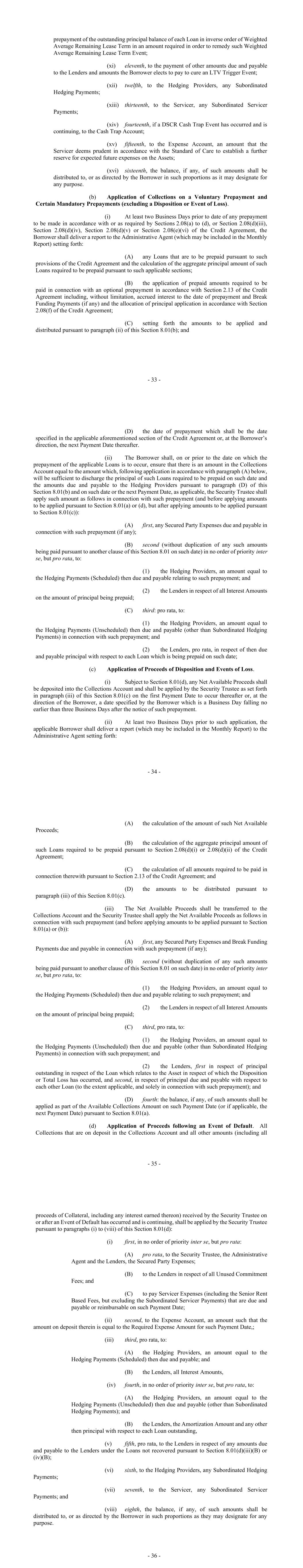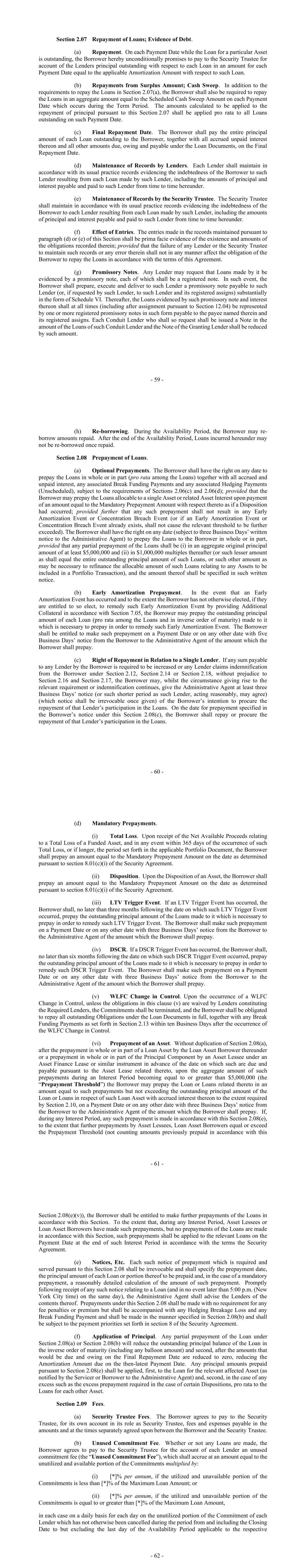 - 59 - Section 2.07 Repayment of Loans; Evidence of Debt. (a) Repayment. On each Payment Date while the Loan for a particular Asset is outstanding, the Borrower hereby unconditionally promises to pay to the Security Trustee for account of the Lenders principal outstanding with respect to each Loan in an amount for each Payment Date equal to the applicable Amortization Amount with respect to such Loan. (b) Repayments from Surplus Amount; Cash Sweep. In addition to the requirements to repay the Loans in Section 2.07(a), the Borrower shall also be required to repay the Loans in an aggregate amount equal to the Scheduled Cash Sweep Amount on each Payment Date which occurs during the Term Period. The amounts calculated to be applied to the repayment of principal pursuant to this Section 2.07 shall be applied pro rata to all Loans outstanding on such Payment Date. (c) Final Repayment Date. The Borrower shall pay the entire principal amount of each Loan outstanding to the Borrower, together with all accrued unpaid interest thereon and all other amounts due, owing and payable under the Loan Documents, on the Final Repayment Date. (d) Maintenance of Records by Lenders. Each Lender shall maintain in accordance with its usual practice records evidencing the indebtedness of the Borrower to such Lender resulting from each Loan made by such Lender, including the amounts of principal and interest payable and paid to such Lender from time to time hereunder. (e) Maintenance of Records by the Security Trustee. The Security Trustee shall maintain in accordance with its usual practice records evidencing the indebtedness of the Borrower to each Lender resulting from each Loan made by such Lender, including the amounts of principal and interest payable and paid to such Lender from time to time hereunder. (f) Effect of Entries. The entries made in the records maintained pursuant to paragraph (d) or (e) of this Section shall be prima facie evidence of the existence and amounts of the obligations recorded therein; provided that the failure of any Lender or the Security Trustee to maintain such records or any error therein shall not in any manner affect the obligation of the Borrower to repay the Loans in accordance with the terms of this Agreement. (g) Promissory Notes. Any Lender may request that Loans made by it be evidenced by a promissory note, each of which shall be a registered note. In such event, the Borrower shall prepare, execute and deliver to such Lender a promissory note payable to such Lender (or, if requested by such Lender, to such Lender and its registered assigns) substantially in the form of Schedule VI. Thereafter, the Loans evidenced by such promissory note and interest thereon shall at all times (including after assignment pursuant to Section 12.04) be represented by one or more registered promissory notes in such form payable to the payee named therein and its registered assigns. Each Conduit Lender who shall so request shall be issued a Note in the amount of the Loans of such Conduit Lender and the Note of the Granting Lender shall be reduced by such amount. - 60 - (h) Re-borrowing. During the Availability Period, the Borrower may re- borrow amounts repaid. After the end of the Availability Period, Loans incurred hereunder may not be re-borrowed once repaid. Section 2.08 Prepayment of Loans. (a) Optional Prepayments. The Borrower shall have the right on any date to prepay the Loans in whole or in part (pro rata among the Loans) together with all accrued and unpaid interest, any associated Break Funding Payments and any associated Hedging Payments (Unscheduled), subject to the requirements of Sections 2.06(c) and 2.06(d); provided that the Borrower may prepay the Loans allocable to a single Asset or related Asset Interest upon payment of an amount equal to the Mandatory Prepayment Amount with respect thereto as if a Disposition had occurred; provided further that any such prepayment shall not result in any Early Amortization Event or Concentration Breach Event (or if an Early Amortization Event or Concentration Breach Event already exists, shall not cause the relevant threshold to be further exceeded). The Borrower shall have the right on any date (subject to three Business Days’ written notice to the Administrative Agent) to prepay the Loans to the Borrower in whole or in part, provided that any partial prepayment of the Loans shall be (i) in an aggregate original principal amount of at least $5,000,000 and (ii) in $1,000,000 multiples thereafter (or such lesser amount as shall equal the entire outstanding principal amount of such Loans, or such other amount as may be necessary to refinance the allocable amount of such Loans relating to any Assets to be included in a Portfolio Transaction), and the amount thereof shall be specified in such written notice. (b) Early Amortization Prepayment. In the event that an Early Amortization Event has occurred and to the extent the Borrower has not otherwise elected, if they are entitled to so elect, to remedy such Early Amortization Event by providing Additional Collateral in accordance with Section 7.05, the Borrower may prepay the outstanding principal amount of each Loan (pro rata among the Loans and in inverse order of maturity) made to it which is necessary to prepay in order to remedy such Early Amortization Event. The Borrower shall be entitled to make such prepayment on a Payment Date or on any other date with five Business Days’ notice from the Borrower to the Administrative Agent of the amount which the Borrower shall prepay. (c) Right of Repayment in Relation to a Single Lender. If any sum payable to any Lender by the Borrower is required to be increased or any Lender claims indemnification from the Borrower under Section 2.12, Section 2.14 or Section 2.18, without prejudice to Section 2.16 and Section 2.17, the Borrower may, whilst the circumstance giving rise to the relevant requirement or indemnification continues, give the Administ