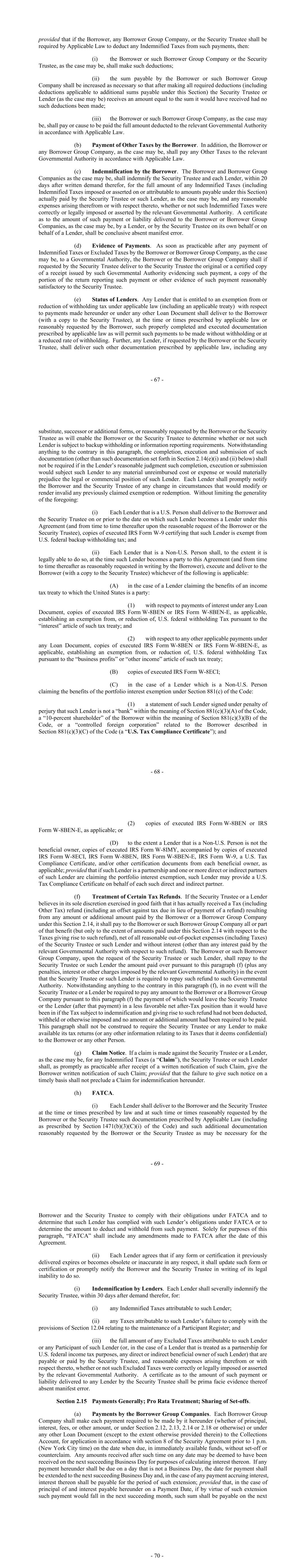 - 67 - provided that if the Borrower, any Borrower Group Company, or the Security Trustee shall be required by Applicable Law to deduct any Indemnified Taxes from such payments, then: (i) the Borrower or such Borrower Group Company or the Security Trustee, as the case may be, shall make such deductions; (ii) the sum payable by the Borrower or such Borrower Group Company shall be increased as necessary so that after making all required deductions (including deductions applicable to additional sums payable under this Section) the Security Trustee or Lender (as the case may be) receives an amount equal to the sum it would have received had no such deductions been made; (iii) the Borrower or such Borrower Group Company, as the case may be, shall pay or cause to be paid the full amount deducted to the relevant Governmental Authority in accordance with Applicable Law. (b) Payment of Other Taxes by the Borrower. In addition, the Borrower or any Borrower Group Company, as the case may be, shall pay any Other Taxes to the relevant Governmental Authority in accordance with Applicable Law. (c) Indemnification by the Borrower. The Borrower and Borrower Group Companies as the case may be, shall indemnify the Security Trustee and each Lender, within 20 days after written demand therefor, for the full amount of any Indemnified Taxes (including Indemnified Taxes imposed or asserted on or attributable to amounts payable under this Section) actually paid by the Security Trustee or such Lender, as the case may be, and any reasonable expenses arising therefrom or with respect thereto, whether or not such Indemnified Taxes were correctly or legally imposed or asserted by the relevant Governmental Authority. A certificate as to the amount of such payment or liability delivered to the Borrower or Borrower Group Companies, as the case may be, by a Lender, or by the Security Trustee on its own behalf or on behalf of a Lender, shall be conclusive absent manifest error. (d) Evidence of Payments. As soon as practicable after any payment of Indemnified Taxes or Excluded Taxes by the Borrower or Borrower Group Company, as the case may be, to a Governmental Authority, the Borrower or the Borrower Group Company shall if requested by the Security Trustee deliver to the Security Trustee the original or a certified copy of a receipt issued by such Governmental Authority evidencing such payment, a copy of the portion of the return reporting such payment or other evidence of such payment reasonably satisfactory to the Security Trustee. (e) Status of Lenders. Any Lender that is entitled to an exemption from or reduction of withholding tax under applicable law (including an applicable treaty) with respect to payments made hereunder or under any other Loan Document shall deliver to the Borrower (with a copy to the Security Trustee), at the time or times prescribed by applicable law or reasonably requested by the Borrower, such properly completed and executed documentation prescribed by applicable law as will permit such payments to be made without withholding or at a reduced rate of withholding. Further, any Lender, if requested by the Borrower or the Security Trustee, shall deliver such other documentation prescribed by applicable law, including any - 68 - substitute, successor or additional forms, or reasonably requested by the Borrower or the Security Trustee as will enable the Borrower or the Security Trustee to determine whether or not such Lender is subject to backup withholding or information reporting requirements. Notwithstanding anything to the contrary in this paragraph, the completion, execution and submission of such documentation (other than such documentation set forth in Section 2.14(e)(i) and (ii) below) shall not be required if in the Lender’s reasonable judgment such completion, execution or submission would subject such Lender to any material unreimbursed cost or expense or would materially prejudice the legal or commercial position of such Lender. Each Lender shall promptly notify the Borrower and the Security Trustee of any change in circumstances that would modify or render invalid any previously claimed exemption or redemption. Without limiting the generality of the foregoing: (i) Each Lender that is a U.S. Person shall deliver to the Borrower and the Security Trustee on or prior to the date on which such Lender becomes a Lender under this Agreement (and from time to time thereafter upon the reasonable request of the Borrower or the Security Trustee), copies of executed IRS Form W-9 certifying that such Lender is exempt from U.S. federal backup withholding tax; and (ii) Each Lender that is a Non-U.S. Person shall, to the extent it is legally able to do so, at the time such Lender becomes a party to this Agreement (and from time to time thereafter as reasonably requested in writing by the Borrower), execute and deliver to the Borrower (with a copy to the Security Trustee) whichever of the following is applicable: (A) in the case of a Lender claiming the benefits of an income tax treaty to which the United States is a party: (1) with respect to payments of interest under any Loan Document, copies of executed IRS Form W-8BEN or IRS Form W-8BEN-E, as applicable, establishing an exemption from, or reduction of, U.S. federal withholding Tax pursuant to the “interest” article of such tax treaty; and (2) with respect to any other applicable payments under any Loan Document, copies of executed IRS Form W-8BEN or IRS Form W-8BEN-E, as applicable, establishing an exemption from, or reduction of, U.S. federal withholding Tax pursuant to the “business profits” or “other income” article of such tax treaty; (B) copies of executed IRS Form W-8ECI; (C) in the case of a Lender which is a Non-U.S. Person claiming the benefits of the portfolio interest exemption under Section 881(c) of the Code: (1) a statement of such Lender signed under penalty of perjury that such Lender is not a “bank” within the mean