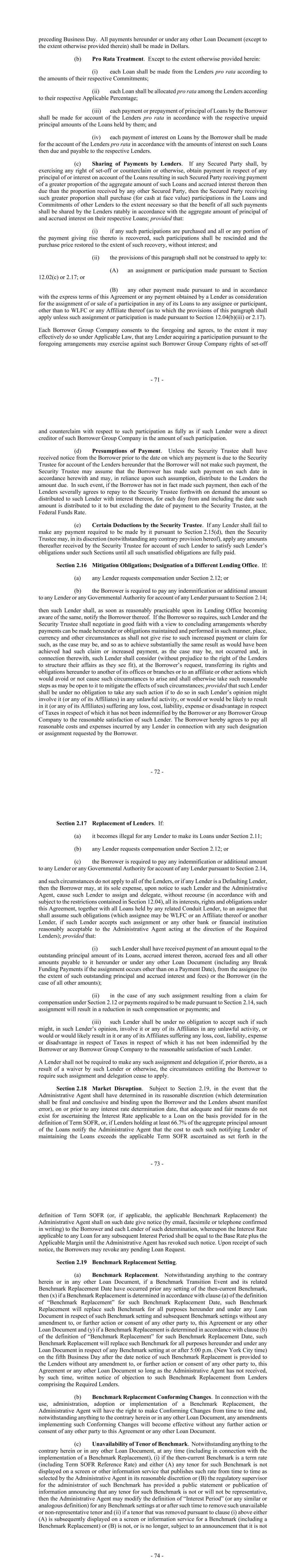 - 71 - preceding Business Day. All payments hereunder or under any other Loan Document (except to the extent otherwise provided therein) shall be made in Dollars. (b) Pro Rata Treatment. Except to the extent otherwise provided herein: (i) each Loan shall be made from the Lenders pro rata according to the amounts of their respective Commitments; (ii) each Loan shall be allocated pro rata among the Lenders according to their respective Applicable Percentage; (iii) each payment or prepayment of principal of Loans by the Borrower shall be made for account of the Lenders pro rata in accordance with the respective unpaid principal amounts of the Loans held by them; and (iv) each payment of interest on Loans by the Borrower shall be made for the account of the Lenders pro rata in accordance with the amounts of interest on such Loans then due and payable to the respective Lenders. (c) Sharing of Payments by Lenders. If any Secured Party shall, by exercising any right of set-off or counterclaim or otherwise, obtain payment in respect of any principal of or interest on account of the Loans resulting in such Secured Party receiving payment of a greater proportion of the aggregate amount of such Loans and accrued interest thereon then due than the proportion received by any other Secured Party, then the Secured Party receiving such greater proportion shall purchase (for cash at face value) participations in the Loans and Commitments of other Lenders to the extent necessary so that the benefit of all such payments shall be shared by the Lenders ratably in accordance with the aggregate amount of principal of and accrued interest on their respective Loans; provided that: (i) if any such participations are purchased and all or any portion of the payment giving rise thereto is recovered, such participations shall be rescinded and the purchase price restored to the extent of such recovery, without interest; and (ii) the provisions of this paragraph shall not be construed to apply to: (A) an assignment or participation made pursuant to Section 12.02(c) or 2.17; or (B) any other payment made pursuant to and in accordance with the express terms of this Agreement or any payment obtained by a Lender as consideration for the assignment of or sale of a participation in any of its Loans to any assignee or participant, other than to WLFC or any Affiliate thereof (as to which the provisions of this paragraph shall apply unless such assignment or participation is made pursuant to Section 12.04(b)(iii) or 2.17). Each Borrower Group Company consents to the foregoing and agrees, to the extent it may effectively do so under Applicable Law, that any Lender acquiring a participation pursuant to the foregoing arrangements may exercise against such Borrower Group Company rights of set-off - 72 - and counterclaim with respect to such participation as fully as if such Lender were a direct creditor of such Borrower Group Company in the amount of such participation. (d) Presumptions of Payment. Unless the Security Trustee shall have received notice from the Borrower prior to the date on which any payment is due to the Security Trustee for account of the Lenders hereunder that the Borrower will not make such payment, the Security Trustee may assume that the Borrower has made such payment on such date in accordance herewith and may, in reliance upon such assumption, distribute to the Lenders the amount due. In such event, if the Borrower has not in fact made such payment, then each of the Lenders severally agrees to repay to the Security Trustee forthwith on demand the amount so distributed to such Lender with interest thereon, for each day from and including the date such amount is distributed to it to but excluding the date of payment to the Security Trustee, at the Federal Funds Rate. (e) Certain Deductions by the Security Trustee. If any Lender shall fail to make any payment required to be made by it pursuant to Section 2.15(d), then the Security Trustee may, in its discretion (notwithstanding any contrary provision hereof), apply any amounts thereafter received by the Security Trustee for account of such Lender to satisfy such Lender’s obligations under such Sections until all such unsatisfied obligations are fully paid. Section 2.16 Mitigation Obligations; Designation of a Different Lending Office. If: (a) any Lender requests compensation under Section 2.12; or (b) the Borrower is required to pay any indemnification or additional amount to any Lender or any Governmental Authority for account of any Lender pursuant to Section 2.14; then such Lender shall, as soon as reasonably practicable upon its Lending Office becoming aware of the same, notify the Borrower thereof. If the Borrower so requires, such Lender and the Security Trustee shall negotiate in good faith with a view to concluding arrangements whereby payments can be made hereunder or obligations maintained and performed in such manner, place, currency and other circumstances as shall not give rise to such increased payment or claim for such, as the case may be, and so as to achieve substantially the same result as would have been achieved had such claim or increased payment, as the case may be, not occurred and, in connection therewith, such Lender shall consider (without prejudice to the right of the Lenders to structure their affairs as they see fit), at the Borrower’s request, transferring its rights and obligations hereunder to another of its offices or branches or to an affiliate or other actions which would avoid or not cause such circumstances to arise and shall otherwise take such reasonable steps as may be open to it to mitigate the effects of such circumstances; provided that such Lender shall be under no obligation to take any such action if to do so in such Lender’s opinion might involve it (or any of its Affiliates) in any unlawful activity, or would or would be likely to result in it (or any of its Affiliates) suffering any loss, cost, liability, 