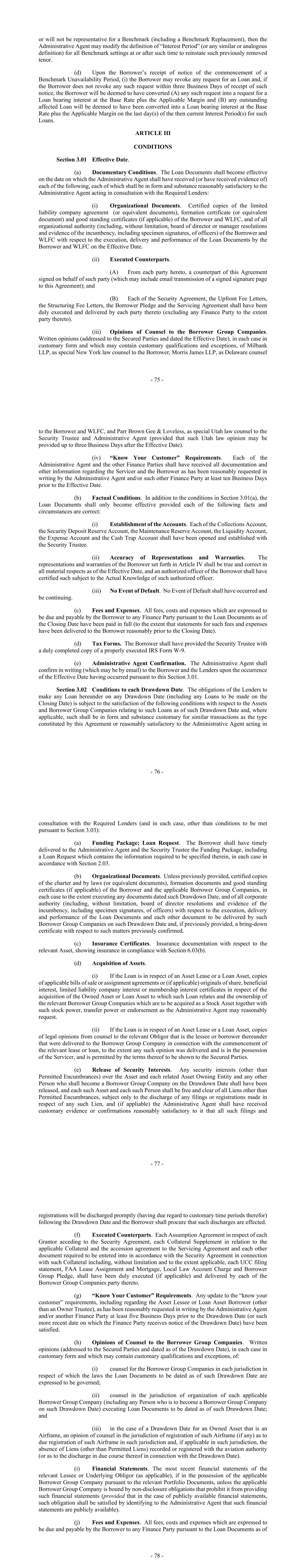 - 75 - or will not be representative for a Benchmark (including a Benchmark Replacement), then the Administrative Agent may modify the definition of “Interest Period” (or any similar or analogous definition) for all Benchmark settings at or after such time to reinstate such previously removed tenor. (d) Upon the Borrower’s receipt of notice of the commencement of a Benchmark Unavailability Period, (i) the Borrower may revoke any request for an Loan and, if the Borrower does not revoke any such request within three Business Days of receipt of such notice, the Borrower will be deemed to have converted (A) any such request into a request for a Loan bearing interest at the Base Rate plus the Applicable Margin and (B) any outstanding affected Loan will be deemed to have been converted into a Loan bearing interest at the Base Rate plus the Applicable Margin on the last day(s) of the then current Interest Period(s) for such Loans. ARTICLE III CONDITIONS Section 3.01 Effective Date. (a) Documentary Conditions. The Loan Documents shall become effective on the date on which the Administrative Agent shall have received (or have received evidence of) each of the following, each of which shall be in form and substance reasonably satisfactory to the Administrative Agent acting in consultation with the Required Lenders: (i) Organizational Documents. Certified copies of the limited liability company agreement (or equivalent documents), formation certificate (or equivalent document) and good standing certificates (if applicable) of the Borrower and WLFC, and of all organizational authority (including, without limitation, board of director or manager resolutions and evidence of the incumbency, including specimen signatures, of officers) of the Borrower and WLFC with respect to the execution, delivery and performance of the Loan Documents by the Borrower and WLFC on the Effective Date. (ii) Executed Counterparts. (A) From each party hereto, a counterpart of this Agreement signed on behalf of such party (which may include email transmission of a signed signature page to this Agreement); and (B) Each of the Security Agreement, the Upfront Fee Letters, the Structuring Fee Letters, the Borrower Pledge and the Servicing Agreement shall have been duly executed and delivered by each party thereto (excluding any Finance Party to the extent party thereto). (iii) Opinions of Counsel to the Borrower Group Companies. Written opinions (addressed to the Secured Parties and dated the Effective Date), in each case in customary form and which may contain customary qualifications and exceptions, of Milbank LLP, as special New York law counsel to the Borrower, Morris James LLP, as Delaware counsel - 76 - to the Borrower and WLFC, and Parr Brown Gee & Loveless, as special Utah law counsel to the Security Trustee and Administrative Agent (provided that such Utah law opinion may be provided up to three Business Days after the Effective Date). (iv) “Know Your Customer” Requirements. Each of the Administrative Agent and the other Finance Parties shall have received all documentation and other information regarding the Servicer and the Borrower as has been reasonably requested in writing by the Administrative Agent and/or such other Finance Party at least ten Business Days prior to the Effective Date. (b) Factual Conditions. In addition to the conditions in Section 3.01(a), the Loan Documents shall only become effective provided each of the following facts and circumstances are correct: (i) Establishment of the Accounts. Each of the Collections Account, the Security Deposit Reserve Account, the Maintenance Reserve Account, the Liquidity Account, the Expense Account and the Cash Trap Account shall have been opened and established with the Security Trustee. (ii) Accuracy of Representations and Warranties. The representations and warranties of the Borrower set forth in Article IV shall be true and correct in all material respects as of the Effective Date, and an authorized officer of the Borrower shall have certified such subject to the Actual Knowledge of such authorized officer. (iii) No Event of Default. No Event of Default shall have occurred and be continuing. (c) Fees and Expenses. All fees, costs and expenses which are expressed to be due and payable by the Borrower to any Finance Party pursuant to the Loan Documents as of the Closing Date have been paid in full (to the extent that statements for such fees and expenses have been delivered to the Borrower reasonably prior to the Closing Date). (d) Tax Forms. The Borrower shall have provided the Security Trustee with a duly completed copy of a properly executed IRS Form W-9. (e) Administrative Agent Confirmation. The Administrative Agent shall confirm in writing (which may be by email) to the Borrower and the Lenders upon the occurrence of the Effective Date having occurred pursuant to this Section 3.01. Section 3.02 Conditions to each Drawdown Date. The obligations of the Lenders to make any Loan hereunder on any Drawdown Date (including any Loans to be made on the Closing Date) is subject to the satisfaction of the following conditions with respect to the Assets and Borrower Group Companies relating to such Loans as of such Drawdown Date and, where applicable, such shall be in form and substance customary for similar transactions as the type constituted by this Agreement or reasonably satisfactory to the Administrative Agent acting in - 77 - consultation with the Required Lenders (and in each case, other than conditions to be met pursuant to Section 3.03): (a) Funding Package; Loan Request. The Borrower shall have timely delivered to the Administrative Agent and the Security Trustee the Funding Package, including a Loan Request which contains the information required to be specified therein, in each case in accordance with Section 2.03. (b) Organizational Documents. Unless previously provided, certified copies of the charter and by laws (or equivalent documents), for