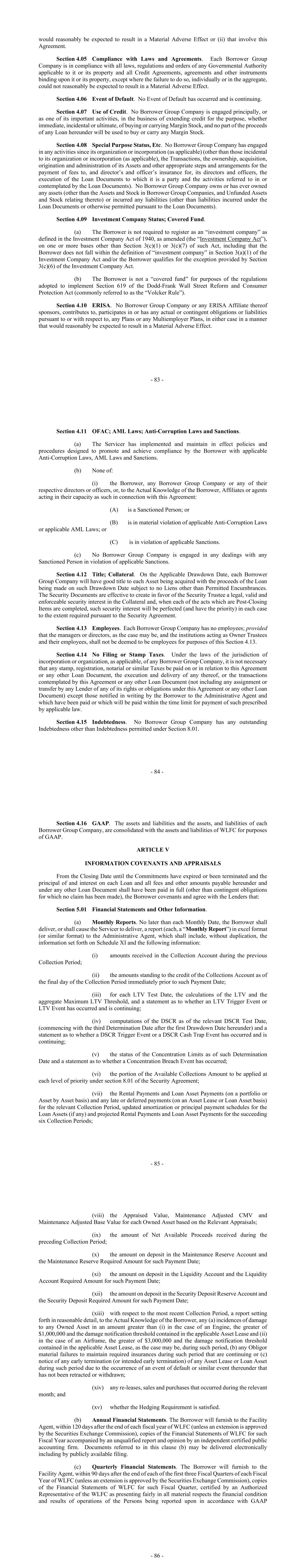 - 83 - would reasonably be expected to result in a Material Adverse Effect or (ii) that involve this Agreement. Section 4.05 Compliance with Laws and Agreements. Each Borrower Group Company is in compliance with all laws, regulations and orders of any Governmental Authority applicable to it or its property and all Credit Agreements, agreements and other instruments binding upon it or its property, except where the failure to do so, individually or in the aggregate, could not reasonably be expected to result in a Material Adverse Effect. Section 4.06 Event of Default. No Event of Default has occurred and is continuing. Section 4.07 Use of Credit. No Borrower Group Company is engaged principally, or as one of its important activities, in the business of extending credit for the purpose, whether immediate, incidental or ultimate, of buying or carrying Margin Stock, and no part of the proceeds of any Loan hereunder will be used to buy or carry any Margin Stock. Section 4.08 Special Purpose Status, Etc. No Borrower Group Company has engaged in any activities since its organization or incorporation (as applicable) (other than those incidental to its organization or incorporation (as applicable), the Transactions, the ownership, acquisition, origination and administration of its Assets and other appropriate steps and arrangements for the payment of fees to, and director’s and officer’s insurance for, its directors and officers, the execution of the Loan Documents to which it is a party and the activities referred to in or contemplated by the Loan Documents). No Borrower Group Company owns or has ever owned any assets (other than the Assets and Stock in Borrower Group Companies, and Unfunded Assets and Stock relating thereto) or incurred any liabilities (other than liabilities incurred under the Loan Documents or otherwise permitted pursuant to the Loan Documents). Section 4.09 Investment Company Status; Covered Fund. (a) The Borrower is not required to register as an “investment company” as defined in the Investment Company Act of 1940, as amended (the “Investment Company Act”), on one or more bases other than Section 3(c)(1) or 3(c)(7) of such Act, including that the Borrower does not fall within the definition of “investment company” in Section 3(a)(1) of the Investment Company Act and/or the Borrower qualifies for the exception provided by Section 3(c)(6) of the Investment Company Act. (b) The Borrower is not a “covered fund” for purposes of the regulations adopted to implement Section 619 of the Dodd-Frank Wall Street Reform and Consumer Protection Act (commonly referred to as the “Volcker Rule”). Section 4.10 ERISA. No Borrower Group Company or any ERISA Affiliate thereof sponsors, contributes to, participates in or has any actual or contingent obligations or liabilities pursuant to or with respect to, any Plans or any Multiemployer Plans, in either case in a manner that would reasonably be expected to result in a Material Adverse Effect. - 84 - Section 4.11 OFAC; AML Laws; Anti-Corruption Laws and Sanctions. (a) The Servicer has implemented and maintain in effect policies and procedures designed to promote and achieve compliance by the Borrower with applicable Anti-Corruption Laws, AML Laws and Sanctions. (b) None of: (i) the Borrower, any Borrower Group Company or any of their respective directors or officers, or, to the Actual Knowledge of the Borrower, Affiliates or agents acting in their capacity as such in connection with this Agreement: (A) is a Sanctioned Person; or (B) is in material violation of applicable Anti-Corruption Laws or applicable AML Laws; or (C) is in violation of applicable Sanctions. (c) No Borrower Group Company is engaged in any dealings with any Sanctioned Person in violation of applicable Sanctions. Section 4.12 Title; Collateral. On the Applicable Drawdown Date, each Borrower Group Company will have good title to each Asset being acquired with the proceeds of the Loan being made on such Drawdown Date subject to no Liens other than Permitted Encumbrances. The Security Documents are effective to create in favor of the Security Trustee a legal, valid and enforceable security interest in the Collateral and, when each of the acts which are Post-Closing Items are completed, such security interest will be perfected (and have the priority) in each case to the extent required pursuant to the Security Agreement. Section 4.13 Employees. Each Borrower Group Company has no employees; provided that the managers or directors, as the case may be, and the institutions acting as Owner Trustees and their employees, shall not be deemed to be employees for purposes of this Section 4.13. Section 4.14 No Filing or Stamp Taxes. Under the laws of the jurisdiction of incorporation or organization, as applicable, of any Borrower Group Company, it is not necessary that any stamp, registration, notarial or similar Taxes be paid on or in relation to this Agreement or any other Loan Document, the execution and delivery of any thereof, or the transactions contemplated by this Agreement or any other Loan Document (not including any assignment or transfer by any Lender of any of its rights or obligations under this Agreement or any other Loan Document) except those notified in writing by the Borrower to the Administrative Agent and which have been paid or which will be paid within the time limit for payment of such prescribed by applicable law. Section 4.15 Indebtedness. No Borrower Group Company has any outstanding Indebtedness other than Indebtedness permitted under Section 8.01. - 85 - Section 4.16 GAAP. The assets and liabilities and the assets, and liabilities of each Borrower Group Company, are consolidated with the assets and liabilities of WLFC for purposes of GAAP. ARTICLE V INFORMATION COVENANTS AND APPRAISALS From the Closing Date until the Commitments have expired or been terminated and the principal of and interest on each Loan and all fees and other amounts