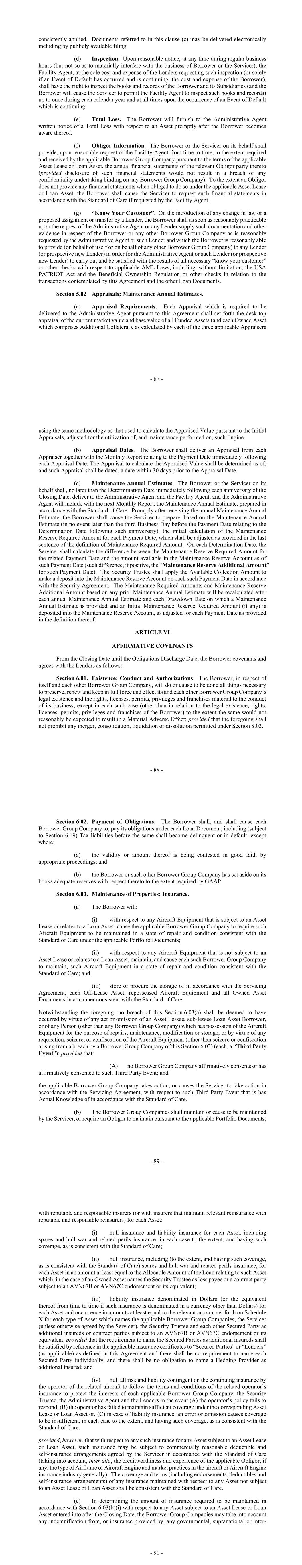 - 87 - consistently applied. Documents referred to in this clause (c) may be delivered electronically including by publicly available filing. (d) Inspection. Upon reasonable notice, at any time during regular business hours (but not so as to materially interfere with the business of Borrower or the Servicer), the Facility Agent, at the sole cost and expense of the Lenders requesting such inspection (or solely if an Event of Default has occurred and is continuing, the cost and expense of the Borrower), shall have the right to inspect the books and records of the Borrower and its Subsidiaries (and the Borrower will cause the Servicer to permit the Facility Agent to inspect such books and records) up to once during each calendar year and at all times upon the occurrence of an Event of Default which is continuing. (e) Total Loss. The Borrower will furnish to the Administrative Agent written notice of a Total Loss with respect to an Asset promptly after the Borrower becomes aware thereof. (f) Obligor Information. The Borrower or the Servicer on its behalf shall provide, upon reasonable request of the Facility Agent from time to time, to the extent required and received by the applicable Borrower Group Company pursuant to the terms of the applicable Asset Lease or Loan Asset, the annual financial statements of the relevant Obligor party thereto (provided disclosure of such financial statements would not result in a breach of any confidentiality undertaking binding on any Borrower Group Company). To the extent an Obligor does not provide any financial statements when obliged to do so under the applicable Asset Lease or Loan Asset, the Borrower shall cause the Servicer to request such financial statements in accordance with the Standard of Care if requested by the Facility Agent. (g) “Know Your Customer”. On the introduction of any change in law or a proposed assignment or transfer by a Lender, the Borrower shall as soon as reasonably practicable upon the request of the Administrative Agent or any Lender supply such documentation and other evidence in respect of the Borrower or any other Borrower Group Company as is reasonably requested by the Administrative Agent or such Lender and which the Borrower is reasonably able to provide (on behalf of itself or on behalf of any other Borrower Group Company) to any Lender (or prospective new Lender) in order for the Administrative Agent or such Lender (or prospective new Lender) to carry out and be satisfied with the results of all necessary “know your customer” or other checks with respect to applicable AML Laws, including, without limitation, the USA PATRIOT Act and the Beneficial Ownership Regulation or other checks in relation to the transactions contemplated by this Agreement and the other Loan Documents. Section 5.02 Appraisals; Maintenance Annual Estimates. (a) Appraisal Requirements. Each Appraisal which is required to be delivered to the Administrative Agent pursuant to this Agreement shall set forth the desk-top appraisal of the current market value and base value of all Funded Assets (and each Owned Asset which comprises Additional Collateral), as calculated by each of the three applicable Appraisers - 88 - using the same methodology as that used to calculate the Appraised Value pursuant to the Initial Appraisals, adjusted for the utilization of, and maintenance performed on, such Engine. (b) Appraisal Dates. The Borrower shall deliver an Appraisal from each Appraiser together with the Monthly Report relating to the Payment Date immediately following each Appraisal Date. The Appraisal to calculate the Appraised Value shall be determined as of, and such Appraisal shall be dated, a date within 30 days prior to the Appraisal Date. (c) Maintenance Annual Estimates. The Borrower or the Servicer on its behalf shall, no later than the Determination Date immediately following each anniversary of the Closing Date, deliver to the Administrative Agent and the Facility Agent, and the Administrative Agent will include with the next Monthly Report, the Maintenance Annual Estimate, prepared in accordance with the Standard of Care. Promptly after receiving the annual Maintenance Annual Estimate, the Borrower shall cause the Servicer to prepare, based on the Maintenance Annual Estimate (in no event later than the third Business Day before the Payment Date relating to the Determination Date following such anniversary), the initial calculation of the Maintenance Reserve Required Amount for each Payment Date, which shall be adjusted as provided in the last sentence of the definition of Maintenance Required Amount. On each Determination Date, the Servicer shall calculate the difference between the Maintenance Reserve Required Amount for the related Payment Date and the amount available in the Maintenance Reserve Account as of such Payment Date (such difference, if positive, the “Maintenance Reserve Additional Amount” for such Payment Date). The Security Trustee shall apply the Available Collection Amount to make a deposit into the Maintenance Reserve Account on each such Payment Date in accordance with the Security Agreement. The Maintenance Required Amounts and Maintenance Reserve Additional Amount based on any prior Maintenance Annual Estimate will be recalculated after each annual Maintenance Annual Estimate and each Drawdown Date on which a Maintenance Annual Estimate is provided and an Initial Maintenance Reserve Required Amount (if any) is deposited into the Maintenance Reserve Account, as adjusted for each Payment Date as provided in the definition thereof. ARTICLE VI AFFIRMATIVE COVENANTS From the Closing Date until the Obligations Discharge Date, the Borrower covenants and agrees with the Lenders as follows: Section 6.01. Existence; Conduct and Authorizations. The Borrower, in respect of itself and each other Borrower Group Company, will do or cause to be done all things necessary to preserve, renew and keep in full force and effect its and e
