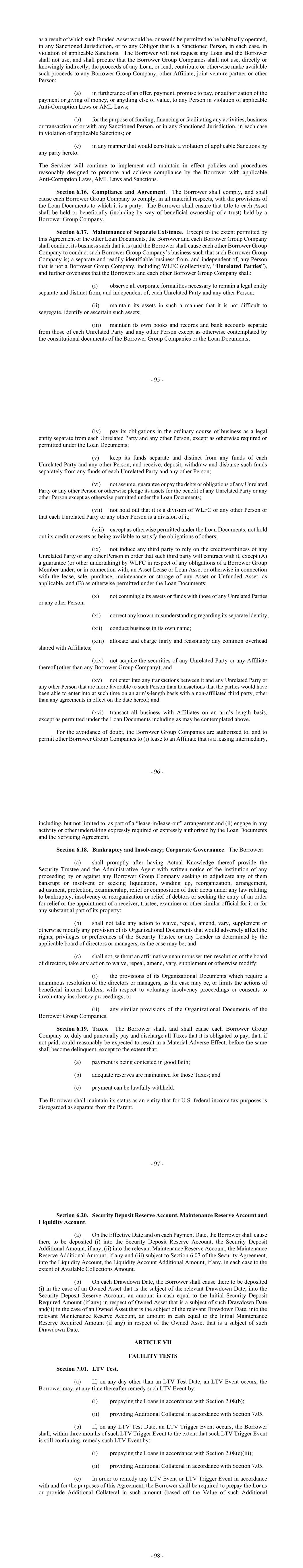 - 95 - as a result of which such Funded Asset would be, or would be permitted to be habitually operated, in any Sanctioned Jurisdiction, or to any Obligor that is a Sanctioned Person, in each case, in violation of applicable Sanctions. The Borrower will not request any Loan and the Borrower shall not use, and shall procure that the Borrower Group Companies shall not use, directly or knowingly indirectly, the proceeds of any Loan, or lend, contribute or otherwise make available such proceeds to any Borrower Group Company, other Affiliate, joint venture partner or other Person: (a) in furtherance of an offer, payment, promise to pay, or authorization of the payment or giving of money, or anything else of value, to any Person in violation of applicable Anti-Corruption Laws or AML Laws; (b) for the purpose of funding, financing or facilitating any activities, business or transaction of or with any Sanctioned Person, or in any Sanctioned Jurisdiction, in each case in violation of applicable Sanctions; or (c) in any manner that would constitute a violation of applicable Sanctions by any party hereto. The Servicer will continue to implement and maintain in effect policies and procedures reasonably designed to promote and achieve compliance by the Borrower with applicable Anti-Corruption Laws, AML Laws and Sanctions. Section 6.16. Compliance and Agreement. The Borrower shall comply, and shall cause each Borrower Group Company to comply, in all material respects, with the provisions of the Loan Documents to which it is a party. The Borrower shall ensure that title to each Asset shall be held or beneficially (including by way of beneficial ownership of a trust) held by a Borrower Group Company. Section 6.17. Maintenance of Separate Existence. Except to the extent permitted by this Agreement or the other Loan Documents, the Borrower and each Borrower Group Company shall conduct its business such that it is (and the Borrower shall cause each other Borrower Group Company to conduct such Borrower Group Company’s business such that such Borrower Group Company is) a separate and readily identifiable business from, and independent of, any Person that is not a Borrower Group Company, including WLFC (collectively, “Unrelated Parties”), and further covenants that the Borrowers and each other Borrower Group Company shall: (i) observe all corporate formalities necessary to remain a legal entity separate and distinct from, and independent of, each Unrelated Party and any other Person; (ii) maintain its assets in such a manner that it is not difficult to segregate, identify or ascertain such assets; (iii) maintain its own books and records and bank accounts separate from those of each Unrelated Party and any other Person except as otherwise contemplated by the constitutional documents of the Borrower Group Companies or the Loan Documents; - 96 - (iv) pay its obligations in the ordinary course of business as a legal entity separate from each Unrelated Party and any other Person, except as otherwise required or permitted under the Loan Documents; (v) keep its funds separate and distinct from any funds of each Unrelated Party and any other Person, and receive, deposit, withdraw and disburse such funds separately from any funds of each Unrelated Party and any other Person; (vi) not assume, guarantee or pay the debts or obligations of any Unrelated Party or any other Person or otherwise pledge its assets for the benefit of any Unrelated Party or any other Person except as otherwise permitted under the Loan Documents; (vii) not hold out that it is a division of WLFC or any other Person or that each Unrelated Party or any other Person is a division of it; (viii) except as otherwise permitted under the Loan Documents, not hold out its credit or assets as being available to satisfy the obligations of others; (ix) not induce any third party to rely on the creditworthiness of any Unrelated Party or any other Person in order that such third party will contract with it, except (A) a guarantee (or other undertaking) by WLFC in respect of any obligations of a Borrower Group Member under, or in connection with, an Asset Lease or Loan Asset or otherwise in connection with the lease, sale, purchase, maintenance or storage of any Asset or Unfunded Asset, as applicable, and (B) as otherwise permitted under the Loan Documents; (x) not commingle its assets or funds with those of any Unrelated Parties or any other Person; (xi) correct any known misunderstanding regarding its separate identity; (xii) conduct business in its own name; (xiii) allocate and charge fairly and reasonably any common overhead shared with Affiliates; (xiv) not acquire the securities of any Unrelated Party or any Affiliate thereof (other than any Borrower Group Company); and (xv) not enter into any transactions between it and any Unrelated Party or any other Person that are more favorable to such Person than transactions that the parties would have been able to enter into at such time on an arm’s-length basis with a non-affiliated third party, other than any agreements in effect on the date hereof; and (xvi) transact all business with Affiliates on an arm’s length basis, except as permitted under the Loan Documents including as may be contemplated above. For the avoidance of doubt, the Borrower Group Companies are authorized to, and to permit other Borrower Group Companies to (i) lease to an Affiliate that is a leasing intermediary, - 97 - including, but not limited to, as part of a “lease-in/lease-out” arrangement and (ii) engage in any activity or other undertaking expressly required or expressly authorized by the Loan Documents and the Servicing Agreement. Section 6.18. Bankruptcy and Insolvency; Corporate Governance. The Borrower: (a) shall promptly after having Actual Knowledge thereof provide the Security Trustee and the Administrative Agent with written notice of the institution of any proceeding by or against any Borrower Group Company see