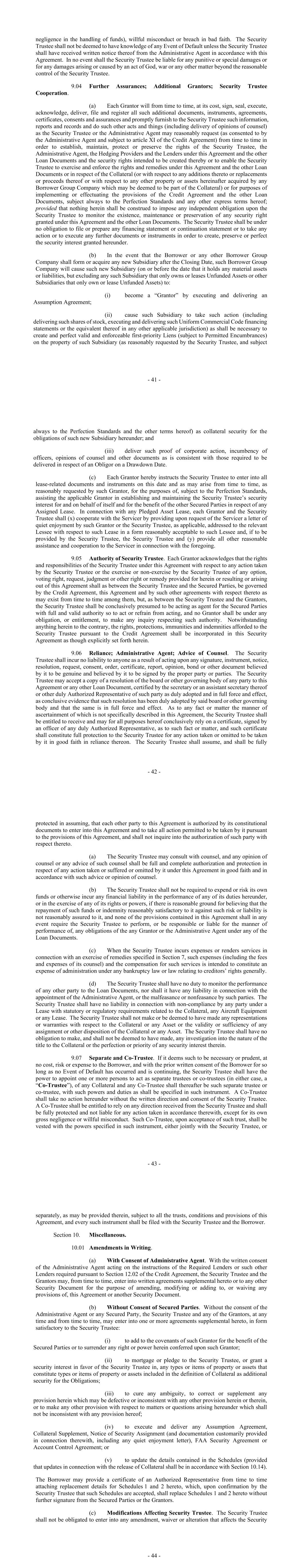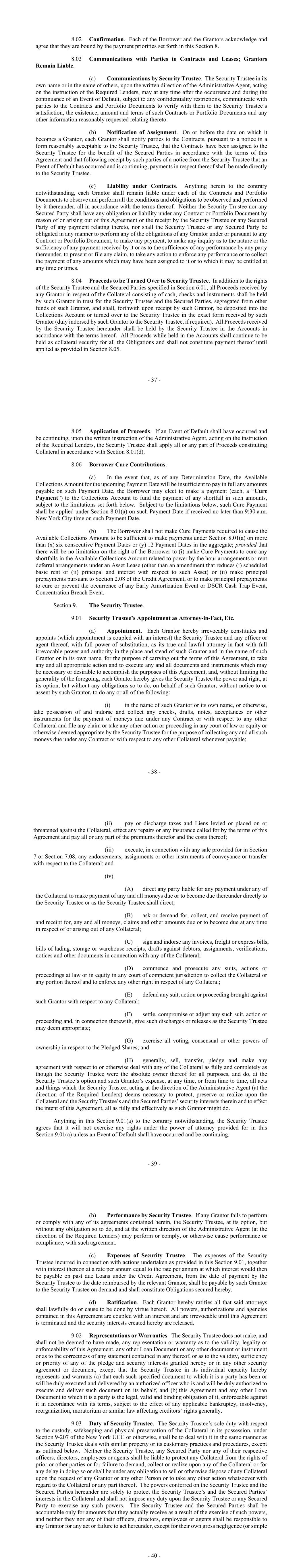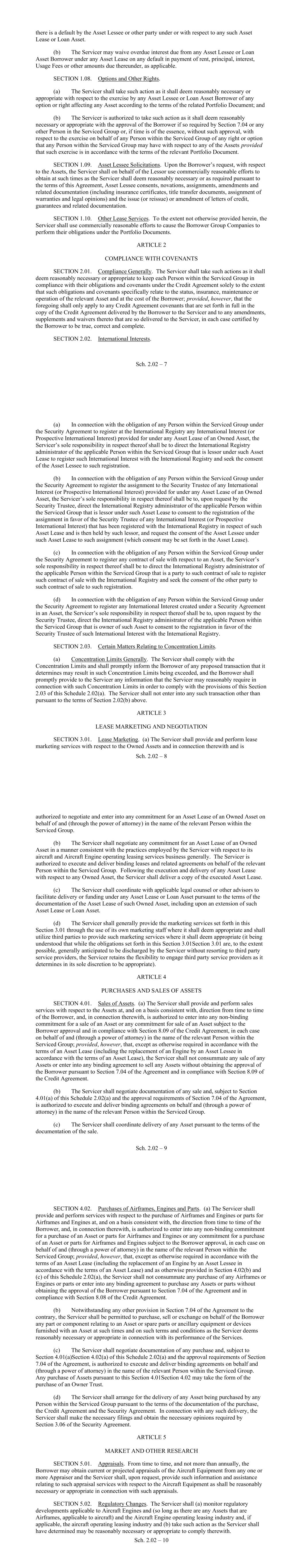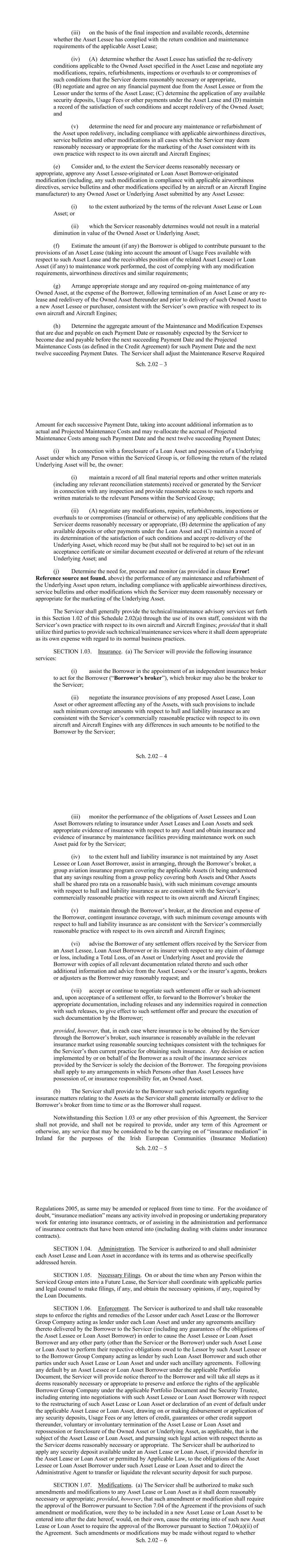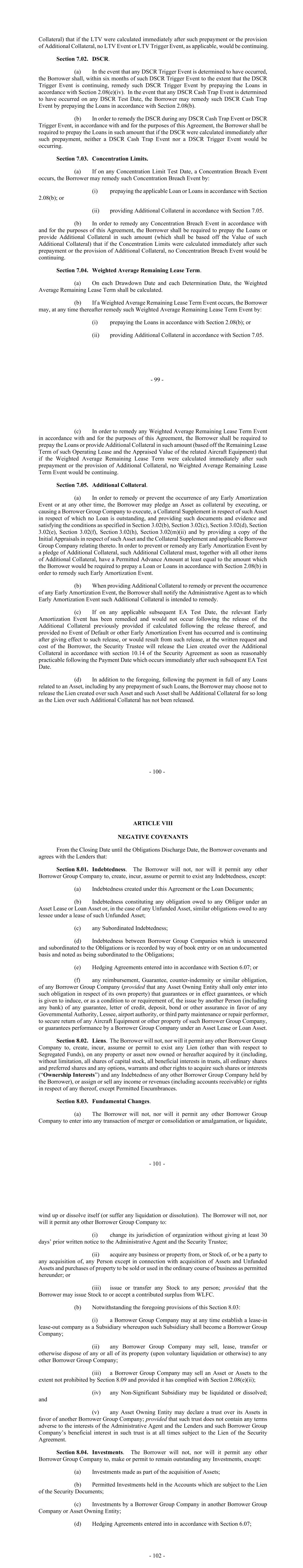 - 99 - Collateral) that if the LTV were calculated immediately after such prepayment or the provision of Additional Collateral, no LTV Event or LTV Trigger Event, as applicable, would be continuing. Section 7.02. DSCR. (a) In the event that any DSCR Trigger Event is determined to have occurred, the Borrower shall, within six months of such DSCR Trigger Event to the extent that the DSCR Trigger Event is continuing, remedy such DSCR Trigger Event by prepaying the Loans in accordance with Section 2.08(e)(iv). In the event that any DSCR Cash Trap Event is determined to have occurred on any DSCR Test Date, the Borrower may remedy such DSCR Cash Trap Event by prepaying the Loans in accordance with Section 2.08(b). (b) In order to remedy the DSCR during any DSCR Cash Trap Event or DSCR Trigger Event, in accordance with and for the purposes of this Agreement, the Borrower shall be required to prepay the Loans in such amount that if the DSCR were calculated immediately after such prepayment, neither a DSCR Cash Trap Event nor a DSCR Trigger Event would be occurring. Section 7.03. Concentration Limits. (a) If on any Concentration Limit Test Date, a Concentration Breach Event occurs, the Borrower may remedy such Concentration Breach Event by: (i) prepaying the applicable Loan or Loans in accordance with Section 2.08(b); or (ii) providing Additional Collateral in accordance with Section 7.05. (b) In order to remedy any Concentration Breach Event in accordance with and for the purposes of this Agreement, the Borrower shall be required to prepay the Loans or provide Additional Collateral in such amount (which shall be based off the Value of such Additional Collateral) that if the Concentration Limits were calculated immediately after such prepayment or the provision of Additional Collateral, no Concentration Breach Event would be continuing. Section 7.04. Weighted Average Remaining Lease Term. (a) On each Drawdown Date and each Determination Date, the Weighted Average Remaining Lease Term shall be calculated. (b) If a Weighted Average Remaining Lease Term Event occurs, the Borrower may, at any time thereafter remedy such Weighted Average Remaining Lease Term Event by: (i) prepaying the Loans in accordance with Section 2.08(b); or (ii) providing Additional Collateral in accordance with Section 7.05. - 100 - (c) In order to remedy any Weighted Average Remaining Lease Term Event in accordance with and for the purposes of this Agreement, the Borrower shall be required to prepay the Loans or provide Additional Collateral in such amount (based off the Remaining Lease Term of such Operating Lease and the Appraised Value of the related Aircraft Equipment) that if the Weighted Average Remaining Lease Term were calculated immediately after such prepayment or the provision of Additional Collateral, no Weighted Average Remaining Lease Term Event would be continuing. Section 7.05. Additional Collateral. (a) In order to remedy or prevent the occurrence of any Early Amortization Event or at any other time, the Borrower may pledge an Asset as collateral by executing, or causing a Borrower Group Company to execute, a Collateral Supplement in respect of such Asset in respect of which no Loan is outstanding, and providing such documents and evidence and satisfying the conditions as specified in Section 3.02(b), Section 3.02(c), Section 3.02(d), Section 3.02(e), Section 3.02(f), Section 3.02(h), Section 3.02(m)(ii) and by providing a copy of the Initial Appraisals in respect of such Asset and the Collateral Supplement and applicable Borrower Group Company relating thereto. In order to prevent or remedy any Early Amortization Event by a pledge of Additional Collateral, such Additional Collateral must, together with all other items of Additional Collateral, have a Permitted Advance Amount at least equal to the amount which the Borrower would be required to prepay a Loan or Loans in accordance with Section 2.08(b) in order to remedy such Early Amortization Event. (b) When providing Additional Collateral to remedy or prevent the occurrence of any Early Amortization Event, the Borrower shall notify the Administrative Agent as to which Early Amortization Event such Additional Collateral is intended to remedy. (c) If on any applicable subsequent EA Test Date, the relevant Early Amortization Event has been remedied and would not occur following the release of the Additional Collateral previously provided if calculated following the release thereof, and provided no Event of Default or other Early Amortization Event has occurred and is continuing after giving effect to such release, or would result from such release, at the written request and cost of the Borrower, the Security Trustee will release the Lien created over the Additional Collateral in accordance with section 10.14 of the Security Agreement as soon as reasonably practicable following the Payment Date which occurs immediately after such subsequent EA Test Date. (d) In addition to the foregoing, following the payment in full of any Loans related to an Asset, including by any prepayment of such Loans, the Borrower may choose not to release the Lien created over such Asset and such Asset shall be Additional Collateral for so long as the Lien over such Additional Collateral has not been released. - 101 - ARTICLE VIII NEGATIVE COVENANTS From the Closing Date until the Obligations Discharge Date, the Borrower covenants and agrees with the Lenders that: Section 8.01. Indebtedness. The Borrower will not, nor will it permit any other Borrower Group Company to, create, incur, assume or permit to exist any Indebtedness, except: (a) Indebtedness created under this Agreement or the Loan Documents; (b) Indebtedness constituting any obligation owed to any Obligor under an Asset Lease or Loan Asset or, in the case of any Unfunded Asset, similar obligations owed to any lessee under a lease of such Unfunded Asset; (c) any Subordinated Indebtedness; (d) Indebtedness between Borrower Grou