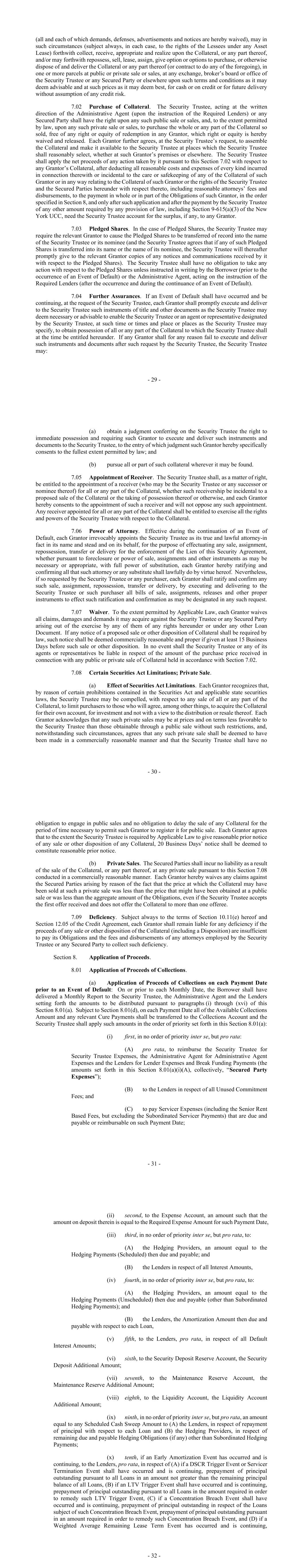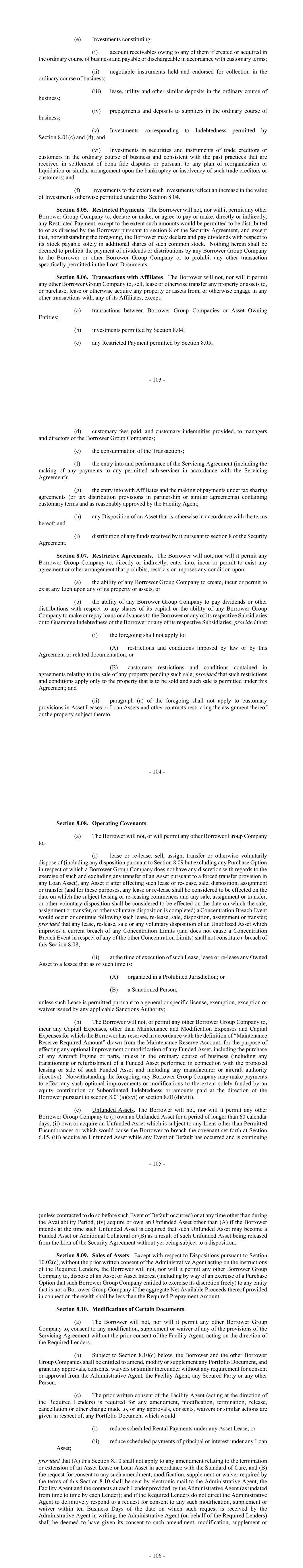 - 103 - (e) Investments constituting: (i) account receivables owing to any of them if created or acquired in the ordinary course of business and payable or dischargeable in accordance with customary terms; (ii) negotiable instruments held and endorsed for collection in the ordinary course of business; (iii) lease, utility and other similar deposits in the ordinary course of business; (iv) prepayments and deposits to suppliers in the ordinary course of business; (v) Investments corresponding to Indebtedness permitted by Section 8.01(c) and (d); and (vi) Investments in securities and instruments of trade creditors or customers in the ordinary course of business and consistent with the past practices that are received in settlement of bona fide disputes or pursuant to any plan of reorganization or liquidation or similar arrangement upon the bankruptcy or insolvency of such trade creditors or customers; and (f) Investments to the extent such Investments reflect an increase in the value of Investments otherwise permitted under this Section 8.04. Section 8.05. Restricted Payments. The Borrower will not, nor will it permit any other Borrower Group Company to, declare or make, or agree to pay or make, directly or indirectly, any Restricted Payment, except to the extent such amounts would be permitted to be distributed to or as directed by the Borrower pursuant to section 8 of the Security Agreement, and except that, notwithstanding the foregoing, the Borrower may declare and pay dividends with respect to its Stock payable solely in additional shares of such common stock. Nothing herein shall be deemed to prohibit the payment of dividends or distributions by any Borrower Group Company to the Borrower or other Borrower Group Company or to prohibit any other transaction specifically permitted in the Loan Documents. Section 8.06. Transactions with Affiliates. The Borrower will not, nor will it permit any other Borrower Group Company to, sell, lease or otherwise transfer any property or assets to, or purchase, lease or otherwise acquire any property or assets from, or otherwise engage in any other transactions with, any of its Affiliates, except: (a) transactions between Borrower Group Companies or Asset Owning Entities; (b) investments permitted by Section 8.04; (c) any Restricted Payment permitted by Section 8.05; - 104 - (d) customary fees paid, and customary indemnities provided, to managers and directors of the Borrower Group Companies; (e) the consummation of the Transactions; (f) the entry into and performance of the Servicing Agreement (including the making of any payments to any permitted sub-servicer in accordance with the Servicing Agreement); (g) the entry into with Affiliates and the making of payments under tax sharing agreements (or tax distribution provisions in partnership or similar agreements) containing customary terms and as reasonably approved by the Facility Agent; (h) any Disposition of an Asset that is otherwise in accordance with the terms hereof; and (i) distribution of any funds received by it pursuant to section 8 of the Security Agreement. Section 8.07. Restrictive Agreements. The Borrower will not, nor will it permit any Borrower Group Company to, directly or indirectly, enter into, incur or permit to exist any agreement or other arrangement that prohibits, restricts or imposes any condition upon: (a) the ability of any Borrower Group Company to create, incur or permit to exist any Lien upon any of its property or assets, or (b) the ability of any Borrower Group Company to pay dividends or other distributions with respect to any shares of its capital or the ability of any Borrower Group Company to make or repay loans or advances to the Borrower or any of its respective Subsidiaries or to Guarantee Indebtedness of the Borrower or any of its respective Subsidiaries; provided that: (i) the foregoing shall not apply to: (A) restrictions and conditions imposed by law or by this Agreement or related documentation, or (B) customary restrictions and conditions contained in agreements relating to the sale of any property pending such sale; provided that such restrictions and conditions apply only to the property that is to be sold and such sale is permitted under this Agreement; and (ii) paragraph (a) of the foregoing shall not apply to customary provisions in Asset Leases or Loan Assets and other contracts restricting the assignment thereof or the property subject thereto. - 105 - Section 8.08. Operating Covenants. (a) The Borrower will not, or will permit any other Borrower Group Company to, (i) lease or re-lease, sell, assign, transfer or otherwise voluntarily dispose of (including any disposition pursuant to Section 8.09 but excluding any Purchase Option in respect of which a Borrower Group Company does not have any discretion with regards to the exercise of such and excluding any transfer of an Asset pursuant to a forced transfer provision in any Loan Asset), any Asset if after effecting such lease or re-lease, sale, disposition, assignment or transfer (and for these purposes, any lease or re-lease shall be considered to be effected on the date on which the subject leasing or re-leasing commences and any sale, assignment or transfer, or other voluntary disposition shall be considered to be effected on the date on which the sale, assignment or transfer, or other voluntary disposition is completed) a Concentration Breach Event would occur or continue following such lease, re-lease, sale, disposition, assignment or transfer; provided that any lease, re-lease, sale or any voluntary disposition of an Unutilized Asset which improves a current breach of any Concentration Limits (and does not cause a Concentration Breach Event in respect of any of the other Concentration Limits) shall not constitute a breach of this Section 8.08; (ii) at the time of execution of such Lease, lease or re-lease any Owned Asset to a lessee that as of such time is: (A) organized in a Prohibited Jurisdic