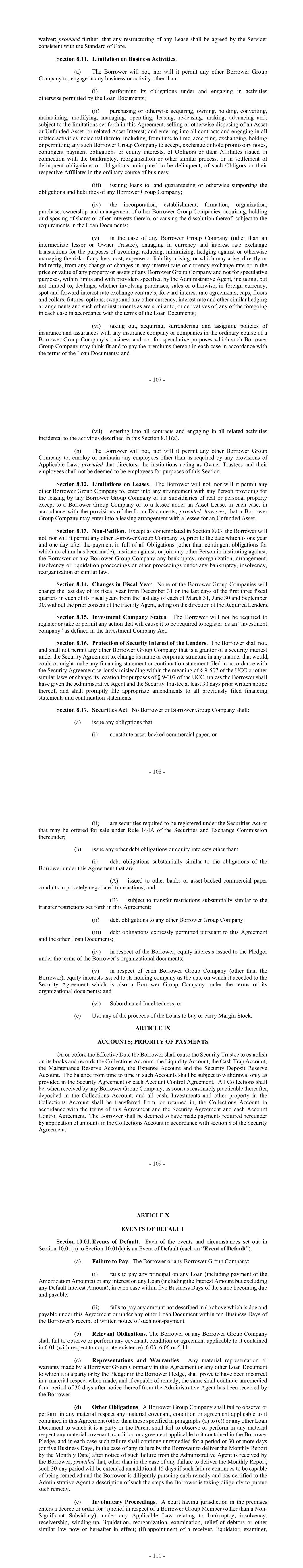 - 107 - waiver; provided further, that any restructuring of any Lease shall be agreed by the Servicer consistent with the Standard of Care. Section 8.11. Limitation on Business Activities. (a) The Borrower will not, nor will it permit any other Borrower Group Company to, engage in any business or activity other than: (i) performing its obligations under and engaging in activities otherwise permitted by the Loan Documents; (ii) purchasing or otherwise acquiring, owning, holding, converting, maintaining, modifying, managing, operating, leasing, re-leasing, making, advancing and, subject to the limitations set forth in this Agreement, selling or otherwise disposing of an Asset or Unfunded Asset (or related Asset Interest) and entering into all contracts and engaging in all related activities incidental thereto, including, from time to time, accepting, exchanging, holding or permitting any such Borrower Group Company to accept, exchange or hold promissory notes, contingent payment obligations or equity interests, of Obligors or their Affiliates issued in connection with the bankruptcy, reorganization or other similar process, or in settlement of delinquent obligations or obligations anticipated to be delinquent, of such Obligors or their respective Affiliates in the ordinary course of business; (iii) issuing loans to, and guaranteeing or otherwise supporting the obligations and liabilities of any Borrower Group Company; (iv) the incorporation, establishment, formation, organization, purchase, ownership and management of other Borrower Group Companies, acquiring, holding or disposing of shares or other interests therein, or causing the dissolution thereof, subject to the requirements in the Loan Documents; (v) in the case of any Borrower Group Company (other than an intermediate lessor or Owner Trustee), engaging in currency and interest rate exchange transactions for the purposes of avoiding, reducing, minimizing, hedging against or otherwise managing the risk of any loss, cost, expense or liability arising, or which may arise, directly or indirectly, from any change or changes in any interest rate or currency exchange rate or in the price or value of any property or assets of any Borrower Group Company and not for speculative purposes, within limits and with providers specified by the Administrative Agent, including, but not limited to, dealings, whether involving purchases, sales or otherwise, in foreign currency, spot and forward interest rate exchange contracts, forward interest rate agreements, caps, floors and collars, futures, options, swaps and any other currency, interest rate and other similar hedging arrangements and such other instruments as are similar to, or derivatives of, any of the foregoing in each case in accordance with the terms of the Loan Documents; (vi) taking out, acquiring, surrendering and assigning policies of insurance and assurances with any insurance company or companies in the ordinary course of a Borrower Group Company’s business and not for speculative purposes which such Borrower Group Company may think fit and to pay the premiums thereon in each case in accordance with the terms of the Loan Documents; and - 108 - (vii) entering into all contracts and engaging in all related activities incidental to the activities described in this Section 8.11(a). (b) The Borrower will not, nor will it permit any other Borrower Group Company to, employ or maintain any employees other than as required by any provisions of Applicable Law; provided that directors, the institutions acting as Owner Trustees and their employees shall not be deemed to be employees for purposes of this Section. Section 8.12. Limitations on Leases. The Borrower will not, nor will it permit any other Borrower Group Company to, enter into any arrangement with any Person providing for the leasing by any Borrower Group Company or its Subsidiaries of real or personal property except to a Borrower Group Company or to a lessee under an Asset Lease, in each case, in accordance with the provisions of the Loan Documents; provided, however, that a Borrower Group Company may enter into a leasing arrangement with a lessee for an Unfunded Asset. Section 8.13. Non-Petition. Except as contemplated in Section 8.03, the Borrower will not, nor will it permit any other Borrower Group Company to, prior to the date which is one year and one day after the payment in full of all Obligations (other than contingent obligations for which no claim has been made), institute against, or join any other Person in instituting against, the Borrower or any Borrower Group Company any bankruptcy, reorganization, arrangement, insolvency or liquidation proceedings or other proceedings under any bankruptcy, insolvency, reorganization or similar law. Section 8.14. Changes in Fiscal Year. None of the Borrower Group Companies will change the last day of its fiscal year from December 31 or the last days of the first three fiscal quarters in each of its fiscal years from the last day of each of March 31, June 30 and September 30, without the prior consent of the Facility Agent, acting on the direction of the Required Lenders. Section 8.15. Investment Company Status. The Borrower will not be required to register or take or permit any action that will cause it to be required to register, as an “investment company” as defined in the Investment Company Act. Section 8.16. Protection of Security Interest of the Lenders. The Borrower shall not, and shall not permit any other Borrower Group Company that is a grantor of a security interest under the Security Agreement to, change its name or corporate structure in any manner that would, could or might make any financing statement or continuation statement filed in accordance with the Security Agreement seriously misleading within the meaning of § 9-507 of the UCC or other similar laws or change its location for purposes of § 9-307 of the UCC, unless the Borrower shall have given the Administrat
