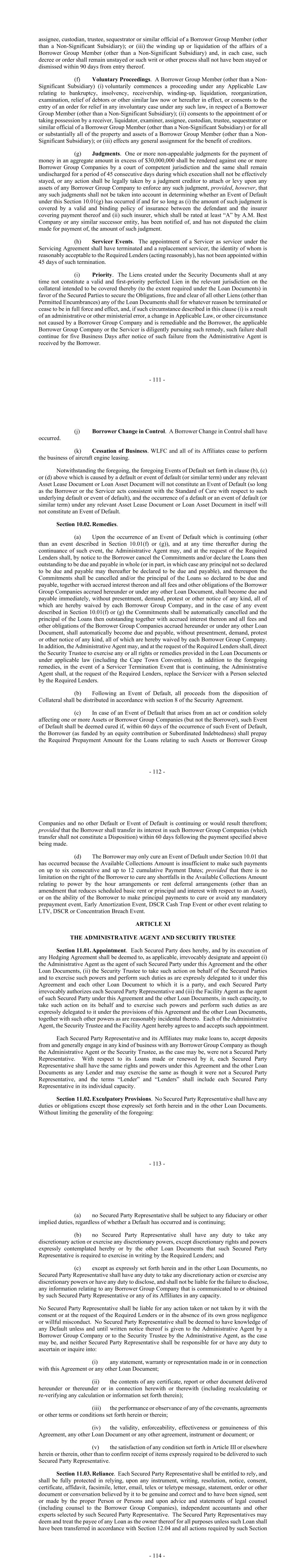 - 111 - assignee, custodian, trustee, sequestrator or similar official of a Borrower Group Member (other than a Non-Significant Subsidiary); or (iii) the winding up or liquidation of the affairs of a Borrower Group Member (other than a Non-Significant Subsidiary) and, in each case, such decree or order shall remain unstayed or such writ or other process shall not have been stayed or dismissed within 90 days from entry thereof. (f) Voluntary Proceedings. A Borrower Group Member (other than a Non- Significant Subsidiary) (i) voluntarily commences a proceeding under any Applicable Law relating to bankruptcy, insolvency, receivership, winding-up, liquidation, reorganization, examination, relief of debtors or other similar law now or hereafter in effect, or consents to the entry of an order for relief in any involuntary case under any such law, in respect of a Borrower Group Member (other than a Non-Significant Subsidiary); (ii) consents to the appointment of or taking possession by a receiver, liquidator, examiner, assignee, custodian, trustee, sequestrator or similar official of a Borrower Group Member (other than a Non-Significant Subsidiary) or for all or substantially all of the property and assets of a Borrower Group Member (other than a Non- Significant Subsidiary); or (iii) effects any general assignment for the benefit of creditors. (g) Judgments. One or more non-appealable judgments for the payment of money in an aggregate amount in excess of $30,000,000 shall be rendered against one or more Borrower Group Companies by a court of competent jurisdiction and the same shall remain undischarged for a period of 45 consecutive days during which execution shall not be effectively stayed, or any action shall be legally taken by a judgment creditor to attach or levy upon any assets of any Borrower Group Company to enforce any such judgment, provided, however, that any such judgments shall not be taken into account in determining whether an Event of Default under this Section 10.01(g) has occurred if and for so long as (i) the amount of such judgment is covered by a valid and binding policy of insurance between the defendant and the insurer covering payment thereof and (ii) such insurer, which shall be rated at least “A” by A.M. Best Company or any similar successor entity, has been notified of, and has not disputed the claim made for payment of, the amount of such judgment. (h) Servicer Events. The appointment of a Servicer as servicer under the Servicing Agreement shall have terminated and a replacement servicer, the identity of whom is reasonably acceptable to the Required Lenders (acting reasonably), has not been appointed within 45 days of such termination. (i) Priority. The Liens created under the Security Documents shall at any time not constitute a valid and first-priority perfected Lien in the relevant jurisdiction on the collateral intended to be covered thereby (to the extent required under the Loan Documents) in favor of the Secured Parties to secure the Obligations, free and clear of all other Liens (other than Permitted Encumbrances) any of the Loan Documents shall for whatever reason be terminated or cease to be in full force and effect, and, if such circumstance described in this clause (i) is a result of an administrative or other ministerial error, a change in Applicable Law, or other circumstance not caused by a Borrower Group Company and is remediable and the Borrower, the applicable Borrower Group Company or the Servicer is diligently pursuing such remedy, such failure shall continue for five Business Days after notice of such failure from the Administrative Agent is received by the Borrower. - 112 - (j) Borrower Change in Control. A Borrower Change in Control shall have occurred. (k) Cessation of Business. WLFC and all of its Affiliates cease to perform the business of aircraft engine leasing. Notwithstanding the foregoing, the foregoing Events of Default set forth in clause (b), (c) or (d) above which is caused by a default or event of default (or similar term) under any relevant Asset Lease Document or Loan Asset Document will not constitute an Event of Default (so long as the Borrower or the Servicer acts consistent with the Standard of Care with respect to such underlying default or event of default), and the occurrence of a default or an event of default (or similar term) under any relevant Asset Lease Document or Loan Asset Document in itself will not constitute an Event of Default. Section 10.02. Remedies. (a) Upon the occurrence of an Event of Default which is continuing (other than an event described in Section 10.01(f) or (g)), and at any time thereafter during the continuance of such event, the Administrative Agent may, and at the request of the Required Lenders shall, by notice to the Borrower cancel the Commitments and/or declare the Loans then outstanding to be due and payable in whole (or in part, in which case any principal not so declared to be due and payable may thereafter be declared to be due and payable), and thereupon the Commitments shall be cancelled and/or the principal of the Loans so declared to be due and payable, together with accrued interest thereon and all fees and other obligations of the Borrower Group Companies accrued hereunder or under any other Loan Document, shall become due and payable immediately, without presentment, demand, protest or other notice of any kind, all of which are hereby waived by each Borrower Group Company, and in the case of any event described in Section 10.01(f) or (g) the Commitments shall be automatically cancelled and the principal of the Loans then outstanding together with accrued interest thereon and all fees and other obligations of the Borrower Group Companies accrued hereunder or under any other Loan Document, shall automatically become due and payable, without presentment, demand, protest or other notice of any kind, all of which are hereby waived by each Borrower Group Company. In addition, the 