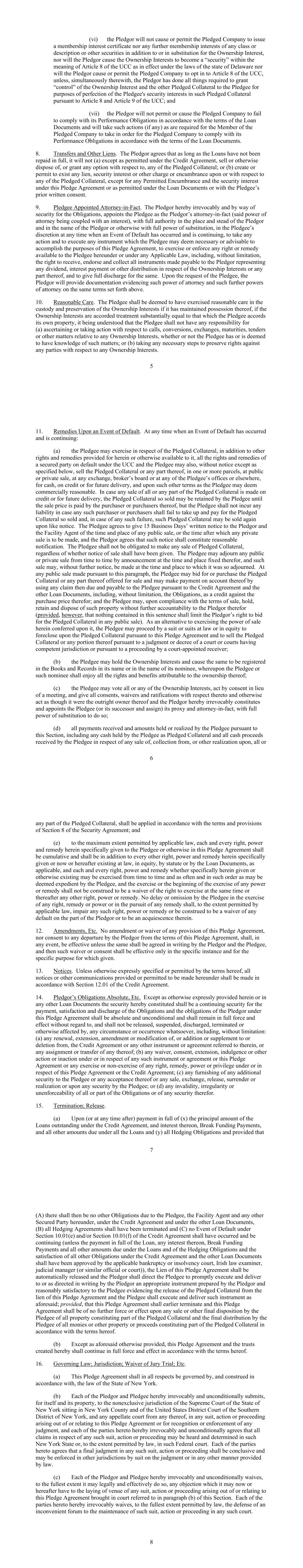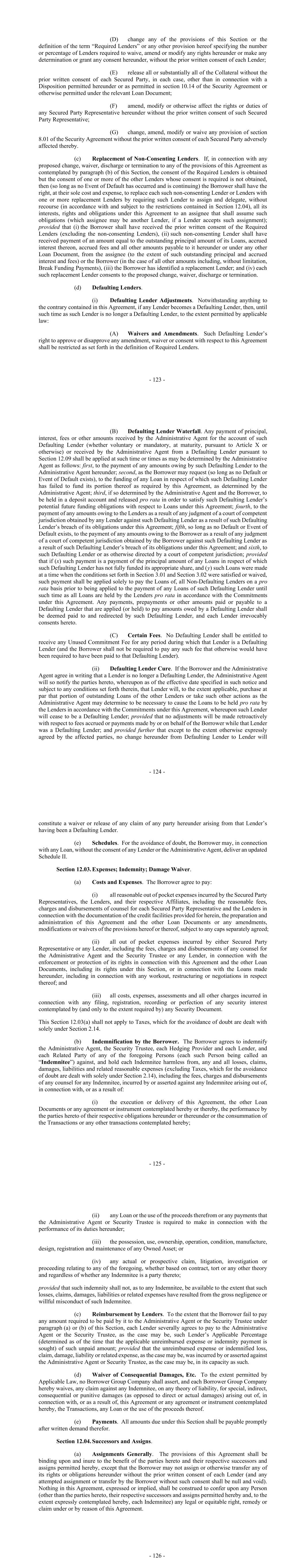- 123 - (D) change any of the provisions of this Section or the definition of the term “Required Lenders” or any other provision hereof specifying the number or percentage of Lenders required to waive, amend or modify any rights hereunder or make any determination or grant any consent hereunder, without the prior written consent of each Lender; (E) release all or substantially all of the Collateral without the prior written consent of each Secured Party, in each case, other than in connection with a Disposition permitted hereunder or as permitted in section 10.14 of the Security Agreement or otherwise permitted under the relevant Loan Document; (F) amend, modify or otherwise affect the rights or duties of any Secured Party Representative hereunder without the prior written consent of such Secured Party Representative; (G) change, amend, modify or waive any provision of section 8.01 of the Security Agreement without the prior written consent of each Secured Party adversely affected thereby. (c) Replacement of Non-Consenting Lenders. If, in connection with any proposed change, waiver, discharge or termination to any of the provisions of this Agreement as contemplated by paragraph (b) of this Section, the consent of the Required Lenders is obtained but the consent of one or more of the other Lenders whose consent is required is not obtained, then (so long as no Event of Default has occurred and is continuing) the Borrower shall have the right, at their sole cost and expense, to replace each such non-consenting Lender or Lenders with one or more replacement Lenders by requiring such Lender to assign and delegate, without recourse (in accordance with and subject to the restrictions contained in Section 12.04), all its interests, rights and obligations under this Agreement to an assignee that shall assume such obligations (which assignee may be another Lender, if a Lender accepts such assignment); provided that (i) the Borrower shall have received the prior written consent of the Required Lenders (excluding the non-consenting Lenders), (ii) such non-consenting Lender shall have received payment of an amount equal to the outstanding principal amount of its Loans, accrued interest thereon, accrued fees and all other amounts payable to it hereunder or under any other Loan Document, from the assignee (to the extent of such outstanding principal and accrued interest and fees) or the Borrower (in the case of all other amounts including, without limitation, Break Funding Payments), (iii) the Borrower has identified a replacement Lender; and (iv) each such replacement Lender consents to the proposed change, waiver, discharge or termination. (d) Defaulting Lenders. (i) Defaulting Lender Adjustments. Notwithstanding anything to the contrary contained in this Agreement, if any Lender becomes a Defaulting Lender, then, until such time as such Lender is no longer a Defaulting Lender, to the extent permitted by applicable law: (A) Waivers and Amendments. Such Defaulting Lender’s right to approve or disapprove any amendment, waiver or consent with respect to this Agreement shall be restricted as set forth in the definition of Required Lenders. - 124 - (B) Defaulting Lender Waterfall. Any payment of principal, interest, fees or other amounts received by the Administrative Agent for the account of such Defaulting Lender (whether voluntary or mandatory, at maturity, pursuant to Article X or otherwise) or received by the Administrative Agent from a Defaulting Lender pursuant to Section 12.09 shall be applied at such time or times as may be determined by the Administrative Agent as follows: first, to the payment of any amounts owing by such Defaulting Lender to the Administrative Agent hereunder; second, as the Borrower may request (so long as no Default or Event of Default exists), to the funding of any Loan in respect of which such Defaulting Lender has failed to fund its portion thereof as required by this Agreement, as determined by the Administrative Agent; third, if so determined by the Administrative Agent and the Borrower, to be held in a deposit account and released pro rata in order to satisfy such Defaulting Lender’s potential future funding obligations with respect to Loans under this Agreement; fourth, to the payment of any amounts owing to the Lenders as a result of any judgment of a court of competent jurisdiction obtained by any Lender against such Defaulting Lender as a result of such Defaulting Lender’s breach of its obligations under this Agreement; fifth, so long as no Default or Event of Default exists, to the payment of any amounts owing to the Borrower as a result of any judgment of a court of competent jurisdiction obtained by the Borrower against such Defaulting Lender as a result of such Defaulting Lender’s breach of its obligations under this Agreement; and sixth, to such Defaulting Lender or as otherwise directed by a court of competent jurisdiction; provided that if (x) such payment is a payment of the principal amount of any Loans in respect of which such Defaulting Lender has not fully funded its appropriate share, and (y) such Loans were made at a time when the conditions set forth in Section 3.01 and Section 3.02 were satisfied or waived, such payment shall be applied solely to pay the Loans of, all Non-Defaulting Lenders on a pro rata basis prior to being applied to the payment of any Loans of such Defaulting Lender until such time as all Loans are held by the Lenders pro rata in accordance with the Commitments under this Agreement. Any payments, prepayments or other amounts paid or payable to a Defaulting Lender that are applied (or held) to pay amounts owed by a Defaulting Lender shall be deemed paid to and redirected by such Defaulting Lender, and each Lender irrevocably consents hereto. (C) Certain Fees. No Defaulting Lender shall be entitled to receive any Unused Commitment Fee for any period during which that Lender is a Defaulting Lender (and the Borrower shall