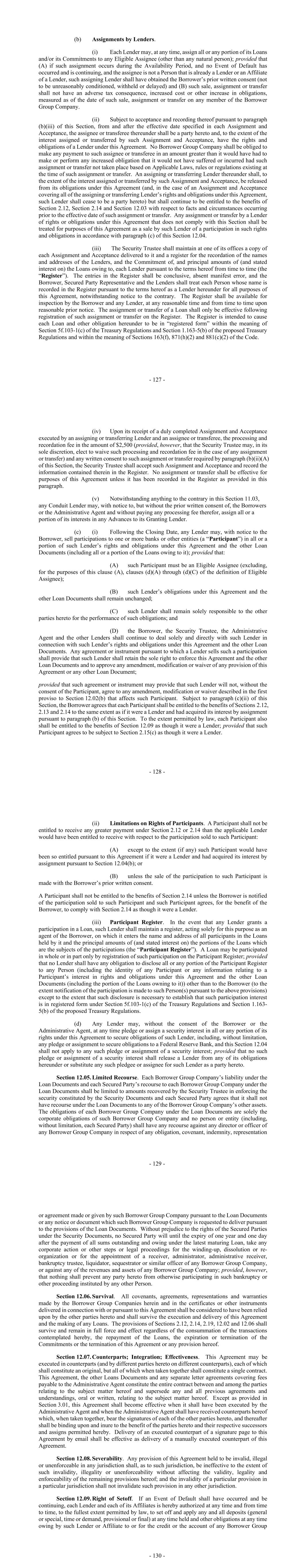 - 127 - (b) Assignments by Lenders. (i) Each Lender may, at any time, assign all or any portion of its Loans and/or its Commitments to any Eligible Assignee (other than any natural person); provided that (A) if such assignment occurs during the Availability Period, and no Event of Default has occurred and is continuing, and the assignee is not a Person that is already a Lender or an Affiliate of a Lender, such assigning Lender shall have obtained the Borrower’s prior written consent (not to be unreasonably conditioned, withheld or delayed) and (B) such sale, assignment or transfer shall not have an adverse tax consequence, increased cost or other increase in obligations, measured as of the date of such sale, assignment or transfer on any member of the Borrower Group Company. (ii) Subject to acceptance and recording thereof pursuant to paragraph (b)(iii) of this Section, from and after the effective date specified in each Assignment and Acceptance, the assignee or transferee thereunder shall be a party hereto and, to the extent of the interest assigned or transferred by such Assignment and Acceptance, have the rights and obligations of a Lender under this Agreement. No Borrower Group Company shall be obliged to make any payment to such assignee or transferee in an amount greater than it would have had to make or perform any increased obligation that it would not have suffered or incurred had such assignment or transfer not taken place based on Applicable Laws, rules or regulations existing at the time of such assignment or transfer. An assigning or transferring Lender thereunder shall, to the extent of the interest assigned or transferred by such Assignment and Acceptance, be released from its obligations under this Agreement (and, in the case of an Assignment and Acceptance covering all of the assigning or transferring Lender’s rights and obligations under this Agreement, such Lender shall cease to be a party hereto) but shall continue to be entitled to the benefits of Section 2.12, Section 2.14 and Section 12.03 with respect to facts and circumstances occurring prior to the effective date of such assignment or transfer. Any assignment or transfer by a Lender of rights or obligations under this Agreement that does not comply with this Section shall be treated for purposes of this Agreement as a sale by such Lender of a participation in such rights and obligations in accordance with paragraph (c) of this Section 12.04. (iii) The Security Trustee shall maintain at one of its offices a copy of each Assignment and Acceptance delivered to it and a register for the recordation of the names and addresses of the Lenders, and the Commitment of, and principal amounts of (and stated interest on) the Loans owing to, each Lender pursuant to the terms hereof from time to time (the “Register”). The entries in the Register shall be conclusive, absent manifest error, and the Borrower, Secured Party Representative and the Lenders shall treat each Person whose name is recorded in the Register pursuant to the terms hereof as a Lender hereunder for all purposes of this Agreement, notwithstanding notice to the contrary. The Register shall be available for inspection by the Borrower and any Lender, at any reasonable time and from time to time upon reasonable prior notice. The assignment or transfer of a Loan shall only be effective following registration of such assignment or transfer on the Register. The Register is intended to cause each Loan and other obligation hereunder to be in “registered form” within the meaning of Section 5f.103-1(c) of the Treasury Regulations and Section 1.163-5(b) of the proposed Treasury Regulations and within the meaning of Sections 163(f), 871(h)(2) and 881(c)(2) of the Code. - 128 - (iv) Upon its receipt of a duly completed Assignment and Acceptance executed by an assigning or transferring Lender and an assignee or transferee, the processing and recordation fee in the amount of $2,500 (provided, however, that the Security Trustee may, in its sole discretion, elect to waive such processing and recordation fee in the case of any assignment or transfer) and any written consent to such assignment or transfer required by paragraph (b)(ii)(A) of this Section, the Security Trustee shall accept such Assignment and Acceptance and record the information contained therein in the Register. No assignment or transfer shall be effective for purposes of this Agreement unless it has been recorded in the Register as provided in this paragraph. (v) Notwithstanding anything to the contrary in this Section 11.03, any Conduit Lender may, with notice to, but without the prior written consent of, the Borrowers or the Administrative Agent and without paying any processing fee therefor, assign all or a portion of its interests in any Advances to its Granting Lender. (c) (i) Following the Closing Date, any Lender may, with notice to the Borrower, sell participations to one or more banks or other entities (a “Participant”) in all or a portion of such Lender’s rights and obligations under this Agreement and the other Loan Documents (including all or a portion of the Loans owing to it); provided that: (A) such Participant must be an Eligible Assignee (excluding, for the purposes of this clause (A), clauses (d)(A) through (d)(C) of the definition of Eligible Assignee); (B) such Lender’s obligations under this Agreement and the other Loan Documents shall remain unchanged; (C) such Lender shall remain solely responsible to the other parties hereto for the performance of such obligations; and (D) the Borrower, the Security Trustee, the Administrative Agent and the other Lenders shall continue to deal solely and directly with such Lender in connection with such Lender’s rights and obligations under this Agreement and the other Loan Documents. Any agreement or instrument pursuant to which a Lender sells such a participation shall provide that such Lender shall retain the sole right to enforc