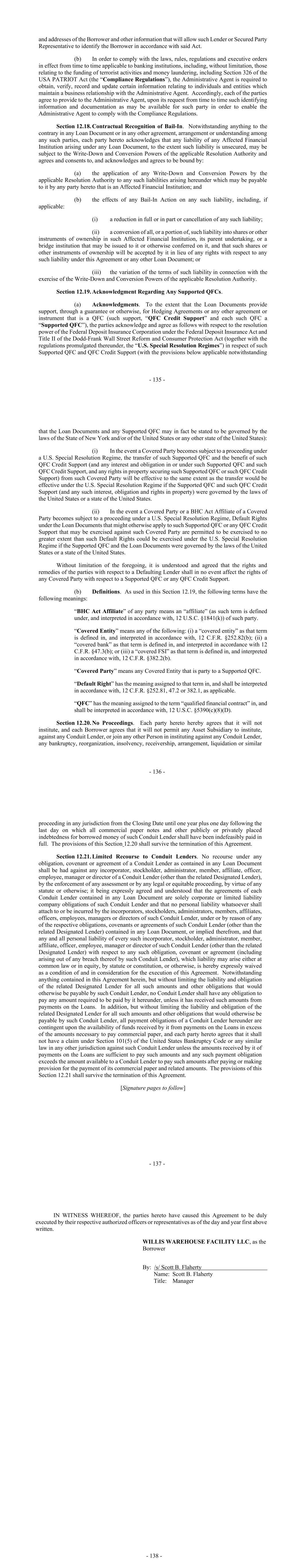 - 135 - and addresses of the Borrower and other information that will allow such Lender or Secured Party Representative to identify the Borrower in accordance with said Act. (b) In order to comply with the laws, rules, regulations and executive orders in effect from time to time applicable to banking institutions, including, without limitation, those relating to the funding of terrorist activities and money laundering, including Section 326 of the USA PATRIOT Act (the “Compliance Regulations”), the Administrative Agent is required to obtain, verify, record and update certain information relating to individuals and entities which maintain a business relationship with the Administrative Agent. Accordingly, each of the parties agree to provide to the Administrative Agent, upon its request from time to time such identifying information and documentation as may be available for such party in order to enable the Administrative Agent to comply with the Compliance Regulations. Section 12.18. Contractual Recognition of Bail-In. Notwithstanding anything to the contrary in any Loan Document or in any other agreement, arrangement or understanding among any such parties, each party hereto acknowledges that any liability of any Affected Financial Institution arising under any Loan Document, to the extent such liability is unsecured, may be subject to the Write-Down and Conversion Powers of the applicable Resolution Authority and agrees and consents to, and acknowledges and agrees to be bound by: (a) the application of any Write-Down and Conversion Powers by the applicable Resolution Authority to any such liabilities arising hereunder which may be payable to it by any party hereto that is an Affected Financial Institution; and (b) the effects of any Bail-In Action on any such liability, including, if applicable: (i) a reduction in full or in part or cancellation of any such liability; (ii) a conversion of all, or a portion of, such liability into shares or other instruments of ownership in such Affected Financial Institution, its parent undertaking, or a bridge institution that may be issued to it or otherwise conferred on it, and that such shares or other instruments of ownership will be accepted by it in lieu of any rights with respect to any such liability under this Agreement or any other Loan Document; or (iii) the variation of the terms of such liability in connection with the exercise of the Write-Down and Conversion Powers of the applicable Resolution Authority. Section 12.19. Acknowledgment Regarding Any Supported QFCs. (a) Acknowledgments. To the extent that the Loan Documents provide support, through a guarantee or otherwise, for Hedging Agreements or any other agreement or instrument that is a QFC (such support, “QFC Credit Support” and each such QFC a “Supported QFC”), the parties acknowledge and agree as follows with respect to the resolution power of the Federal Deposit Insurance Corporation under the Federal Deposit Insurance Act and Title II of the Dodd-Frank Wall Street Reform and Consumer Protection Act (together with the regulations promulgated thereunder, the “U.S. Special Resolution Regimes”) in respect of such Supported QFC and QFC Credit Support (with the provisions below applicable notwithstanding - 136 - that the Loan Documents and any Supported QFC may in fact be stated to be governed by the laws of the State of New York and/or of the United States or any other state of the United States): (i) In the event a Covered Party becomes subject to a proceeding under a U.S. Special Resolution Regime, the transfer of such Supported QFC and the benefit of such QFC Credit Support (and any interest and obligation in or under such Supported QFC and such QFC Credit Support, and any rights in property securing such Supported QFC or such QFC Credit Support) from such Covered Party will be effective to the same extent as the transfer would be effective under the U.S. Special Resolution Regime if the Supported QFC and such QFC Credit Support (and any such interest, obligation and rights in property) were governed by the laws of the United States or a state of the United States. (ii) In the event a Covered Party or a BHC Act Affiliate of a Covered Party becomes subject to a proceeding under a U.S. Special Resolution Regime, Default Rights under the Loan Documents that might otherwise apply to such Supported QFC or any QFC Credit Support that may be exercised against such Covered Party are permitted to be exercised to no greater extent than such Default Rights could be exercised under the U.S. Special Resolution Regime if the Supported QFC and the Loan Documents were governed by the laws of the United States or a state of the United States. Without limitation of the foregoing, it is understood and agreed that the rights and remedies of the parties with respect to a Defaulting Lender shall in no event affect the rights of any Covered Party with respect to a Supported QFC or any QFC Credit Support. (b) Definitions. As used in this Section 12.19, the following terms have the following meanings: “BHC Act Affiliate” of any party means an “affiliate” (as such term is defined under, and interpreted in accordance with, 12 U.S.C. §1841(k)) of such party. “Covered Entity” means any of the following: (i) a “covered entity” as that term is defined in, and interpreted in accordance with, 12 C.F.R. §252.82(b); (ii) a “covered bank” as that term is defined in, and interpreted in accordance with 12 C.F.R. §47.3(b); or (iii) a “covered FSI” as that term is defined in, and interpreted in accordance with, 12 C.F.R. §382.2(b). “Covered Party” means any Covered Entity that is party to a Supported QFC. “Default Right” has the meaning assigned to that term in, and shall be interpreted in accordance with, 12 C.F.R. §252.81, 47.2 or 382.1, as applicable. “QFC” has the meaning assigned to the term “qualified financial contract” in, and shall be interpreted in a