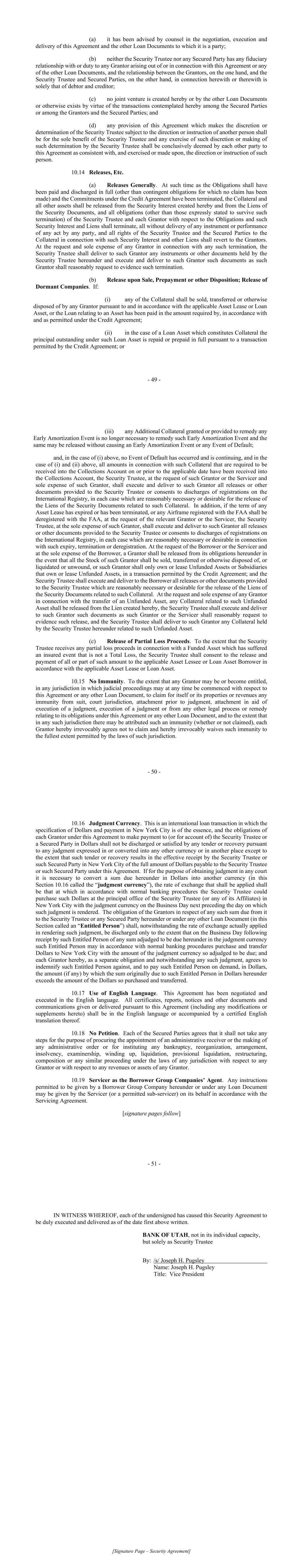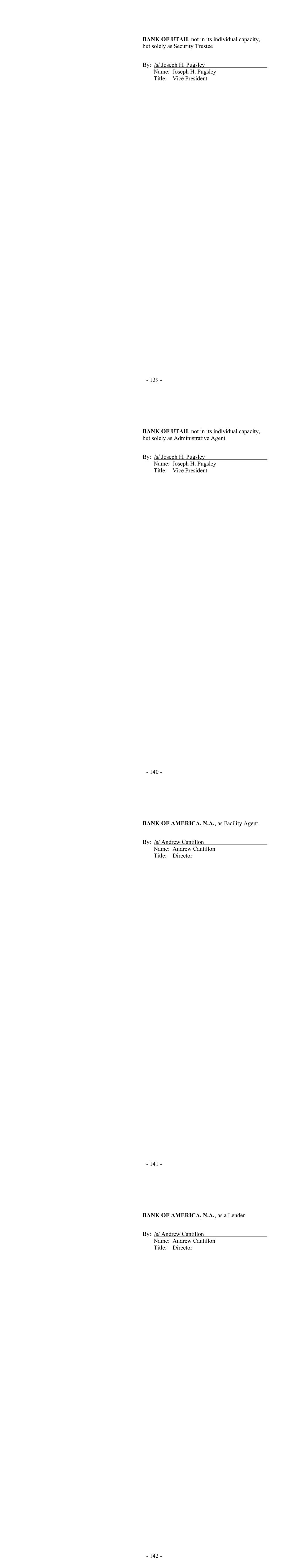 - 139 - BANK OF UTAH, not in its individual capacity, but solely as Security Trustee By: /s/ Joseph H. Pugsley Name: Joseph H. Pugsley Title: Vice President - 140 - BANK OF UTAH, not in its individual capacity, but solely as Administrative Agent By: /s/ Joseph H. Pugsley Name: Joseph H. Pugsley Title: Vice President - 141 - BANK OF AMERICA, N.A., as Facility Agent By: /s/ Andrew Cantillon Name: Andrew Cantillon Title: Director - 142 - BANK OF AMERICA, N.A., as a Lender By: /s/ Andrew Cantillon Name: Andrew Cantillon Title: Director