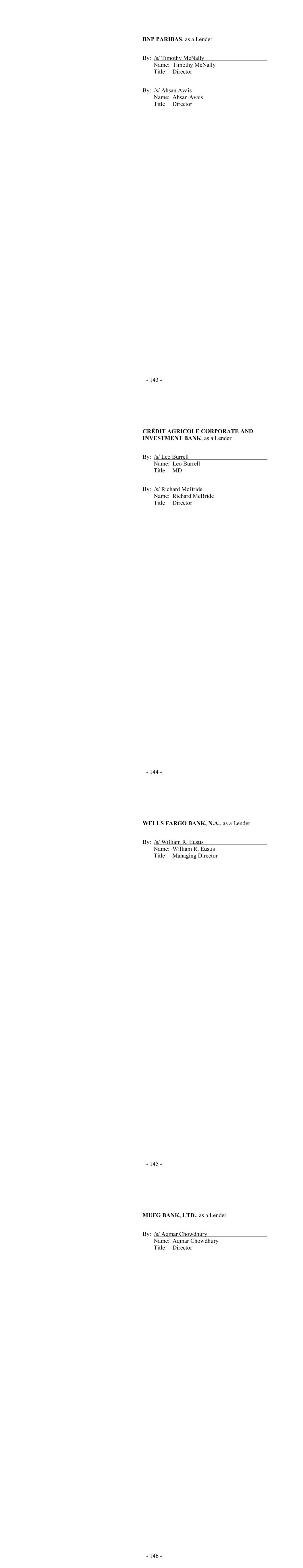 - 143 - BNP PARIBAS, as a Lender By: /s/ Timothy McNally Name: Timothy McNally Title Director By: /s/ Ahsan Avais Name: Ahsan Avais Title Director - 144 - CRÉDIT AGRICOLE CORPORATE AND INVESTMENT BANK, as a Lender By: /s/ Leo Burrell Name: Leo Burrell Title MD By: /s/ Richard McBride Name: Richard McBride Title Director - 145 - WELLS FARGO BANK, N.A., as a Lender By: /s/ William R. Eustis Name: William R. Eustis Title Managing Director - 146 - MUFG BANK, LTD., as a Lender By: /s/ Aqmar Chowdhury Name: Aqmar Chowdhury Title Director