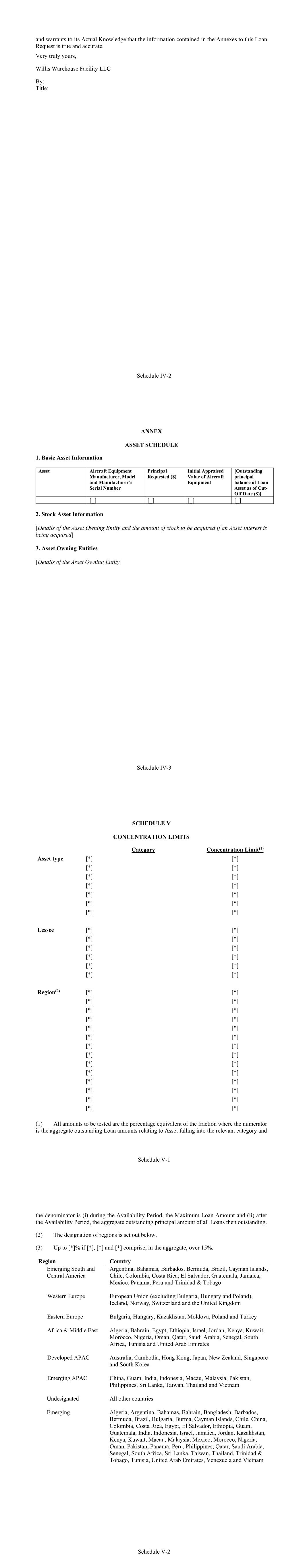 Schedule IV-2 and warrants to its Actual Knowledge that the information contained in the Annexes to this Loan Request is true and accurate. Very truly yours, Willis Warehouse Facility LLC By: Title: Schedule IV-3 ANNEX ASSET SCHEDULE 1. Basic Asset Information Asset Aircraft Equipment Manufacturer, Model and Manufacturer’s Serial Number Principal Requested ($) Initial Appraised Value of Aircraft Equipment [Outstanding principal balance of Loan Asset as of Cut- Off Date ($)] [_] [_] [_] [_] 2. Stock Asset Information [Details of the Asset Owning Entity and the amount of stock to be acquired if an Asset Interest is being acquired] 3. Asset Owning Entities [Details of the Asset Owning Entity] Schedule V-1 SCHEDULE V CONCENTRATION LIMITS Category Concentration Limit(1) Asset type [*] [*] [*] [*] [*] [*] [*] [*] [*] [*] [*] [*] [*] [*] Lessee [*] [*] [*] [*] [*] [*] [*] [*] [*] [*] [*] [*] Region(2) [*] [*] [*] [*] [*] [*] [*] [*] [*] [*] [*] [*] [*] [*] [*] [*] [*] [*] [*] [*] [*] [*] [*] [*] [*] [*] [*] [*] (1) All amounts to be tested are the percentage equivalent of the fraction where the numerator is the aggregate outstanding Loan amounts relating to Asset falling into the relevant category and Schedule V-2 the denominator is (i) during the Availability Period, the Maximum Loan Amount and (ii) after the Availability Period, the aggregate outstanding principal amount of all Loans then outstanding. (2) The designation of regions is set out below. (3) Up to [*]% if [*], [*] and [*] comprise, in the aggregate, over 15%. Region Country Emerging South and Central America Argentina, Bahamas, Barbados, Bermuda, Brazil, Cayman Islands, Chile, Colombia, Costa Rica, El Salvador, Guatemala, Jamaica, Mexico, Panama, Peru and Trinidad & Tobago Western Europe European Union (excluding Bulgaria, Hungary and Poland), Iceland, Norway, Switzerland and the United Kingdom Eastern Europe Bulgaria, Hungary, Kazakhstan, Moldova, Poland and Turkey Africa & Middle East Algeria, Bahrain, Egypt, Ethiopia, Israel, Jordan, Kenya, Kuwait, Morocco, Nigeria, Oman, Qatar, Saudi Arabia, Senegal, South Africa, Tunisia and United Arab Emirates Developed APAC Australia, Cambodia, Hong Kong, Japan, New Zealand, Singapore and South Korea Emerging APAC China, Guam, India, Indonesia, Macau, Malaysia, Pakistan, Philippines, Sri Lanka, Taiwan, Thailand and Vietnam Undesignated All other countries Emerging Algeria, Argentina, Bahamas, Bahrain, Bangladesh, Barbados, Bermuda, Brazil, Bulgaria, Burma, Cayman Islands, Chile, China, Colombia, Costa Rica, Egypt, El Salvador, Ethiopia, Guam, Guatemala, India, Indonesia, Israel, Jamaica, Jordan, Kazakhstan, Kenya, Kuwait, Macau, Malaysia, Mexico, Morocco, Nigeria, Oman, Pakistan, Panama, Peru, Philippines, Qatar, Saudi Arabia, Senegal, South Africa, Sri Lanka, Taiwan, Thailand, Trinidad & Tobago, Tunisia, United Arab Emirates, Venezuela and Vietnam