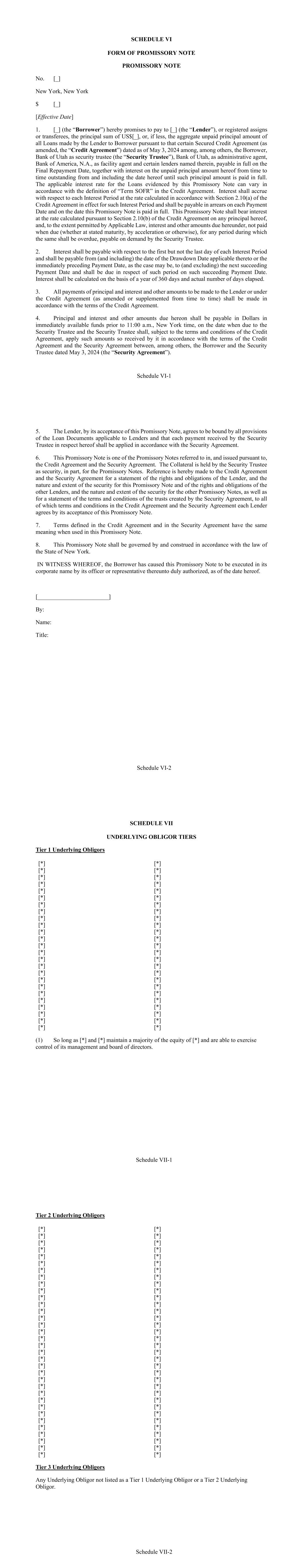 Schedule VI-1 SCHEDULE VI FORM OF PROMISSORY NOTE PROMISSORY NOTE No. [_] New York, New York $ [_] [Effective Date] 1. [_] (the “Borrower”) hereby promises to pay to [_] (the “Lender”), or registered assigns or transferees, the principal sum of US$[_], or, if less, the aggregate unpaid principal amount of all Loans made by the Lender to Borrower pursuant to that certain Secured Credit Agreement (as amended, the “Credit Agreement”) dated as of May 3, 2024 among, among others, the Borrower, Bank of Utah as security trustee (the “Security Trustee”), Bank of Utah, as administrative agent, Bank of America, N.A., as facility agent and certain lenders named therein, payable in full on the Final Repayment Date, together with interest on the unpaid principal amount hereof from time to time outstanding from and including the date hereof until such principal amount is paid in full. The applicable interest rate for the Loans evidenced by this Promissory Note can vary in accordance with the definition of “Term SOFR” in the Credit Agreement. Interest shall accrue with respect to each Interest Period at the rate calculated in accordance with Section 2.10(a) of the Credit Agreement in effect for such Interest Period and shall be payable in arrears on each Payment Date and on the date this Promissory Note is paid in full. This Promissory Note shall bear interest at the rate calculated pursuant to Section 2.10(b) of the Credit Agreement on any principal hereof, and, to the extent permitted by Applicable Law, interest and other amounts due hereunder, not paid when due (whether at stated maturity, by acceleration or otherwise), for any period during which the same shall be overdue, payable on demand by the Security Trustee. 2. Interest shall be payable with respect to the first but not the last day of each Interest Period and shall be payable from (and including) the date of the Drawdown Date applicable thereto or the immediately preceding Payment Date, as the case may be, to (and excluding) the next succeeding Payment Date and shall be due in respect of such period on such succeeding Payment Date. Interest shall be calculated on the basis of a year of 360 days and actual number of days elapsed. 3. All payments of principal and interest and other amounts to be made to the Lender or under the Credit Agreement (as amended or supplemented from time to time) shall be made in accordance with the terms of the Credit Agreement. 4. Principal and interest and other amounts due hereon shall be payable in Dollars in immediately available funds prior to 11:00 a.m., New York time, on the date when due to the Security Trustee and the Security Trustee shall, subject to the terms and conditions of the Credit Agreement, apply such amounts so received by it in accordance with the terms of the Credit Agreement and the Security Agreement between, among others, the Borrower and the Security Trustee dated May 3, 2024 (the “Security Agreement”). Schedule VI-2 5. The Lender, by its acceptance of this Promissory Note, agrees to be bound by all provisions of the Loan Documents applicable to Lenders and that each payment received by the Security Trustee in respect hereof shall be applied in accordance with the Security Agreement. 6. This Promissory Note is one of the Promissory Notes referred to in, and issued pursuant to, the Credit Agreement and the Security Agreement. The Collateral is held by the Security Trustee as security, in part, for the Promissory Notes. Reference is hereby made to the Credit Agreement and the Security Agreement for a statement of the rights and obligations of the Lender, and the nature and extent of the security for this Promissory Note and of the rights and obligations of the other Lenders, and the nature and extent of the security for the other Promissory Notes, as well as for a statement of the terms and conditions of the trusts created by the Security Agreement, to all of which terms and conditions in the Credit Agreement and the Security Agreement each Lender agrees by its acceptance of this Promissory Note. 7. Terms defined in the Credit Agreement and in the Security Agreement have the same meaning when used in this Promissory Note. 8. This Promissory Note shall be governed by and construed in accordance with the law of the State of New York. IN WITNESS WHEREOF, the Borrower has caused this Promissory Note to be executed in its corporate name by its officer or representative thereunto duly authorized, as of the date hereof. [________________________] By: Name: Title: Schedule VII-1 SCHEDULE VII UNDERLYING OBLIGOR TIERS Tier 1 Underlying Obligors [*] [*] [*] [*] [*] [*] [*] [*] [*] [*] [*] [*] [*] [*] [*] [*] [*] [*] [*] [*] [*] [*] [*] [*] [*] [*] [*] [*] [*] [*] [*] [*] [*] [*] [*] [*] [*] [*] [*] [*] [*] [*] [*] [*] [*] [*] [*] [*] [*] [*] (1) So long as [*] and [*] maintain a majority of the equity of [*] and are able to exercise control of its management and board of directors. Schedule VII-2 Tier 2 Underlying Obligors [*] [*] [*] [*] [*] [*] [*] [*] [*] [*] [*] [*] [*] [*] [*] [*] [*] [*] [*] [*] [*] [*] [*] [*] [*] [*] [*] [*] [*] [*] [*] [*] [*] [*] [*] [*] [*] [*] [*] [*] [*] [*] [*] [*] [*] [*] [*] [*] [*] [*] [*] [*] [*] [*] [*] [*] [*] [*] [*] [*] [*] [*] [*] [*] [*] [*] [*] [*] Tier 3 Underlying Obligors Any Underlying Obligor not listed as a Tier 1 Underlying Obligor or a Tier 2 Underlying Obligor.