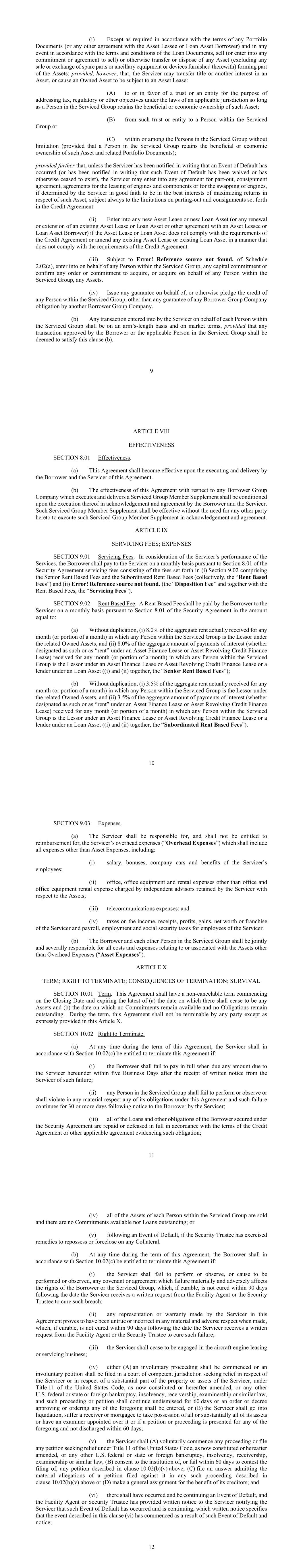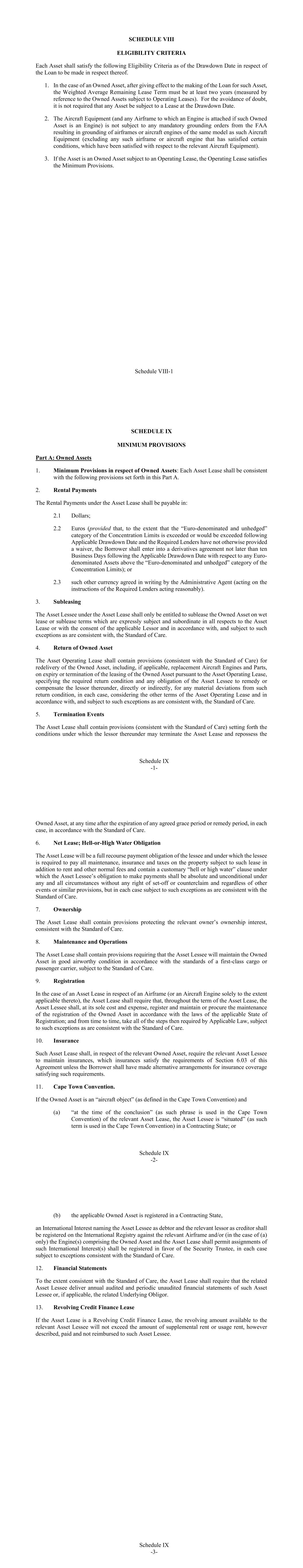 Schedule VIII-1 SCHEDULE VIII ELIGIBILITY CRITERIA Each Asset shall satisfy the following Eligibility Criteria as of the Drawdown Date in respect of the Loan to be made in respect thereof. 1. In the case of an Owned Asset, after giving effect to the making of the Loan for such Asset, the Weighted Average Remaining Lease Term must be at least two years (measured by reference to the Owned Assets subject to Operating Leases). For the avoidance of doubt, it is not required that any Asset be subject to a Lease at the Drawdown Date. 2. The Aircraft Equipment (and any Airframe to which an Engine is attached if such Owned Asset is an Engine) is not subject to any mandatory grounding orders from the FAA resulting in grounding of airframes or aircraft engines of the same model as such Aircraft Equipment (excluding any such airframe or aircraft engine that has satisfied certain conditions, which have been satisfied with respect to the relevant Aircraft Equipment). 3. If the Asset is an Owned Asset subject to an Operating Lease, the Operating Lease satisfies the Minimum Provisions. Schedule IX -1- SCHEDULE IX MINIMUM PROVISIONS Part A: Owned Assets 1. Minimum Provisions in respect of Owned Assets: Each Asset Lease shall be consistent with the following provisions set forth in this Part A. 2. Rental Payments The Rental Payments under the Asset Lease shall be payable in: 2.1 Dollars; 2.2 Euros (provided that, to the extent that the “Euro-denominated and unhedged” category of the Concentration Limits is exceeded or would be exceeded following Applicable Drawdown Date and the Required Lenders have not otherwise provided a waiver, the Borrower shall enter into a derivatives agreement not later than ten Business Days following the Applicable Drawdown Date with respect to any Euro- denominated Assets above the “Euro-denominated and unhedged” category of the Concentration Limits); or 2.3 such other currency agreed in writing by the Administrative Agent (acting on the instructions of the Required Lenders acting reasonably). 3. Subleasing The Asset Lessee under the Asset Lease shall only be entitled to sublease the Owned Asset on wet lease or sublease terms which are expressly subject and subordinate in all respects to the Asset Lease or with the consent of the applicable Lessor and in accordance with, and subject to such exceptions as are consistent with, the Standard of Care. 4. Return of Owned Asset The Asset Operating Lease shall contain provisions (consistent with the Standard of Care) for redelivery of the Owned Asset, including, if applicable, replacement Aircraft Engines and Parts, on expiry or termination of the leasing of the Owned Asset pursuant to the Asset Operating Lease, specifying the required return condition and any obligation of the Asset Lessee to remedy or compensate the lessor thereunder, directly or indirectly, for any material deviations from such return condition, in each case, considering the other terms of the Asset Operating Lease and in accordance with, and subject to such exceptions as are consistent with, the Standard of Care. 5. Termination Events The Asset Lease shall contain provisions (consistent with the Standard of Care) setting forth the conditions under which the lessor thereunder may terminate the Asset Lease and repossess the Schedule IX -2- Owned Asset, at any time after the expiration of any agreed grace period or remedy period, in each case, in accordance with the Standard of Care. 6. Net Lease; Hell-or-High Water Obligation The Asset Lease will be a full recourse payment obligation of the lessee and under which the lessee is required to pay all maintenance, insurance and taxes on the property subject to such lease in addition to rent and other normal fees and contain a customary “hell or high water” clause under which the Asset Lessee’s obligation to make payments shall be absolute and unconditional under any and all circumstances without any right of set-off or counterclaim and regardless of other events or similar provisions, but in each case subject to such exceptions as are consistent with the Standard of Care. 7. Ownership The Asset Lease shall contain provisions protecting the relevant owner’s ownership interest, consistent with the Standard of Care. 8. Maintenance and Operations The Asset Lease shall contain provisions requiring that the Asset Lessee will maintain the Owned Asset in good airworthy condition in accordance with the standards of a first-class cargo or passenger carrier, subject to the Standard of Care. 9. Registration In the case of an Asset Lease in respect of an Airframe (or an Aircraft Engine solely to the extent applicable thereto), the Asset Lease shall require that, throughout the term of the Asset Lease, the Asset Lessee shall, at its sole cost and expense, register and maintain or procure the maintenance of the registration of the Owned Asset in accordance with the laws of the applicable State of Registration; and from time to time, take all of the steps then required by Applicable Law, subject to such exceptions as are consistent with the Standard of Care. 10. Insurance Such Asset Lease shall, in respect of the relevant Owned Asset, require the relevant Asset Lessee to maintain insurances, which insurances satisfy the requirements of Section 6.03 of this Agreement unless the Borrower shall have made alternative arrangements for insurance coverage satisfying such requirements. 11. Cape Town Convention. If the Owned Asset is an “aircraft object” (as defined in the Cape Town Convention) and (a) “at the time of the conclusion” (as such phrase is used in the Cape Town Convention) of the relevant Asset Lease, the Asset Lessee is “situated” (as such term is used in the Cape Town Convention) in a Contracting State; or Schedule IX -3- (b) the applicable Owned Asset is registered in a Contracting State, an International Interest naming the Asset Lessee as debtor and the relevant lessor as creditor shall be registered 