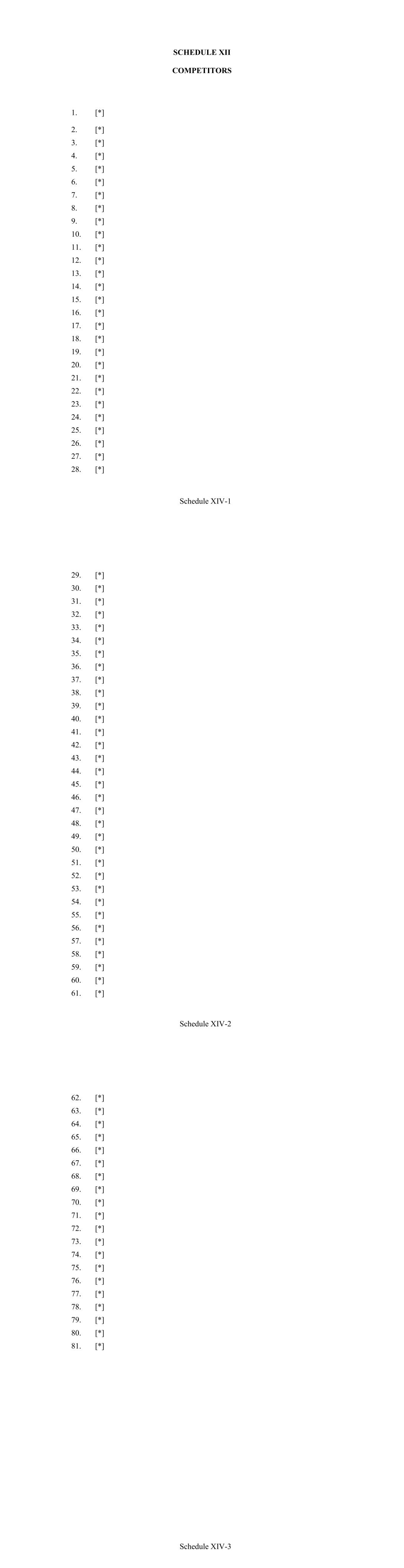 Schedule XIV-1 SCHEDULE XII COMPETITORS 1. [*] 2. [*] 3. [*] 4. [*] 5. [*] 6. [*] 7. [*] 8. [*] 9. [*] 10. [*] 11. [*] 12. [*] 13. [*] 14. [*] 15. [*] 16. [*] 17. [*] 18. [*] 19. [*] 20. [*] 21. [*] 22. [*] 23. [*] 24. [*] 25. [*] 26. [*] 27. [*] 28. [*] Schedule XIV-2 29. [*] 30. [*] 31. [*] 32. [*] 33. [*] 34. [*] 35. [*] 36. [*] 37. [*] 38. [*] 39. [*] 40. [*] 41. [*] 42. [*] 43. [*] 44. [*] 45. [*] 46. [*] 47. [*] 48. [*] 49. [*] 50. [*] 51. [*] 52. [*] 53. [*] 54. [*] 55. [*] 56. [*] 57. [*] 58. [*] 59. [*] 60. [*] 61. [*] Schedule XIV-3 62. [*] 63. [*] 64. [*] 65. [*] 66. [*] 67. [*] 68. [*] 69. [*] 70. [*] 71. [*] 72. [*] 73. [*] 74. [*] 75. [*] 76. [*] 77. [*] 78. [*] 79. [*] 80. [*] 81. [*]