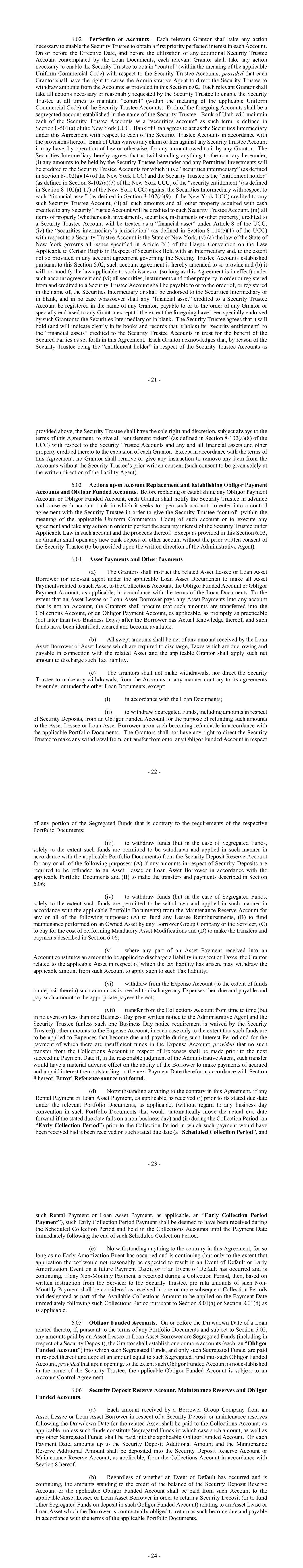 - 7 - “Asset Lessee” means each Person who is the lessee of any Owned Asset from time to time leased from a Borrower Group Company or other Asset Owning Entity. “Asset Lessee Guarantor” means any Person which has provided credit support to, including, without limitation, by means of entering into a guarantee in favor of, a Borrower Group Company or Asset Owning Entity in respect of an Asset Lessee’s obligations to be performed in favor of Borrower Group Company. “Asset Operating Lease” means, in respect of an Owned Asset subject to an Operating Lease, the Operating Lease related thereto between the applicable Borrower Group Company and the Asset Lessee and the other Asset Lease Documents related thereto as specified in schedule 6 of the Security Agreement (as supplemented from time to time pursuant to any Assumption Agreement or Collateral Supplement). “Asset Owning Entity” means (1) a Borrower Group Company in respect of a Title Owned Asset, (2) is the lender of record in respect of a Loan Asset and (3) each Owner Trustee in respect of a Trust Owned Asset. “Asset Payments” means all payments received from each Asset Lessee, Loan Asset Borrower or any other person on their behalf including, without limitation, an Asset Lessee Guarantor or Loan Asset Borrower Guarantor by the Borrower Group Companies pursuant to each Asset Lease and Loan Asset. “Assignment and Acceptance” means an assignment and acceptance entered into by a Lender and an assignee (with the consent of any party whose consent is required by Schedule III), accepted by the Administrative Agent and delivered to the Security Trustee, in the form set out in Schedule III. “Authorized Representative” of any Person means a director or the chief executive officer, chief financial officer, general counsel, president, treasurer, senior vice president, member, manager, controlling trustee or any other comparable officer of such Person. “Availability Period” means the period commencing on the Closing Date and ending on the second anniversary of the Closing Date. “Available Collections Amount” means, as of the close of business on any Determination Date, amounts on deposit in the Collections Account for distribution on the relevant Payment Date, taking into account certain transfers between the Collections Account and certain other Accounts during the period between such Determination Date and such Payment Date. The Available Collections Amount with respect to any payment to be made therefrom shall be determined after giving effect to all payments, if any, having priority to such payment under section 8.01 of the Security Agreement. “Available Tenor” means, as of any date of determination and with respect to the then- current Benchmark, as applicable, if such Benchmark is a term rate, any tenor for such Benchmark (or component thereof) that is or may be used for determining the length of an interest period pursuant to this Agreement as of such date and not including, for the avoidance of doubt, - 8 - any tenor for such Benchmark that is then-removed from the definition of “Interest Period” pursuant to Section 2.19(c). “Bail-In Action” means the exercise of any Write-Down and Conversion Powers by the applicable Resolution Authority in respect of any liability of an Affected Financial Institution. “Bail-In Legislation” means (a) with respect to any EEA Member Country implementing Article 55 of Directive 2014/59/EU of the European Parliament and of the Council of the European Union, the implementing law, regulation rule or requirement for such EEA Member Country from time to time which is described in the EU Bail-In Legislation Schedule and (b) with respect to the United Kingdom, Part I of the United Kingdom Banking Act 2009 (as amended from time to time) and any other law, regulation or rule applicable in the United Kingdom relating to the resolution of unsound or failing banks, investment firms or other financial institutions or their affiliates (other than through liquidation, administration or other insolvency proceedings). “Base Rate” means, for any day, a rate per annum equal to the greater of (i) the Prime Rate in effect on such day, and (ii) the Federal Funds Rate in effect on such day plus 0.50%. Any change in the Base Rate due to a change in the Prime Rate or the Federal Funds Rate shall be effective from and including the effective day of such change in the Prime Rate or the Federal Funds Rate, respectively. “Benchmark” means, initially, the Term SOFR Reference Rate; provided that, if a Benchmark Transition Event has occurred with respect to the Term SOFR Reference Rate or the then-current Benchmark, then “Benchmark” means the applicable Benchmark Replacement to the extent that such Benchmark Replacement has replaced such prior benchmark rate pursuant to Section 2.19. “Benchmark Replacement” means, with respect to any Benchmark Transition Event, the first alternative set forth in the order below that can be determined by the Administrative Agent for the applicable Benchmark Replacement Date: (1) subject to the proviso at the end of this definition, Daily Simple SOFR; (2) the sum of: (i) the alternate benchmark rate that has been selected by the Administrative Agent and the Borrower giving due consideration to (A) any selection or recommendation of a replacement benchmark rate or the mechanism for determining such a rate by the Relevant Governmental Body or (B) any evolving or then-prevailing market convention for determining a benchmark rate as a replacement to the then-current Benchmark for Dollar- denominated syndicated credit facilities and (ii) the related Benchmark Replacement Adjustment. If the Benchmark Replacement as determined pursuant to clause (1) or (2) above would be less than the Floor, the Benchmark Replacement will be deemed to be the Floor for the purposes of this Agreement and the other Loan Documents. “Benchmark Replacement Adjustment” me