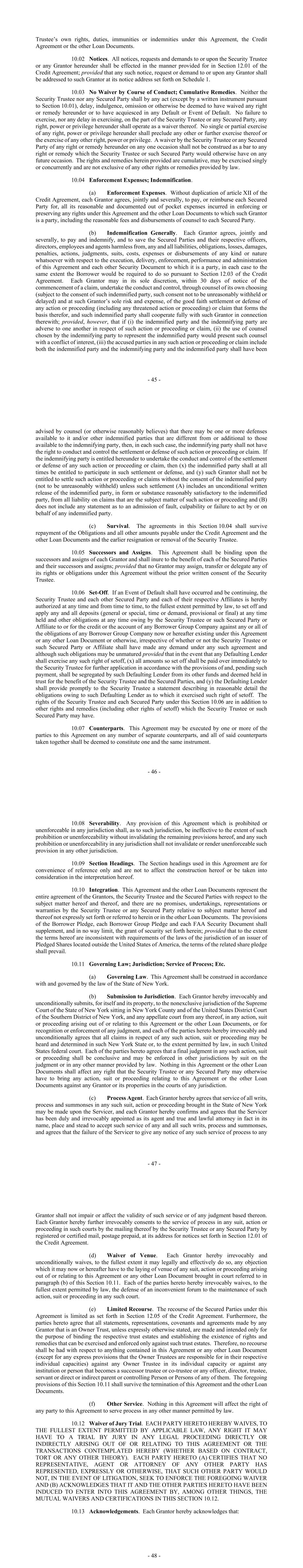 - 131 - Company against any of and all the obligations of any Borrower Group Company now or hereafter existing under this Agreement held by such Lender, irrespective of whether or not such Lender shall have made any demand under this Agreement and although such obligations may be unmatured provided that in the event that any Defaulting Lender shall exercise any such right of setoff, (x) all amounts so set off shall be paid over promptly to the Administrative Agent for further application in accordance with the provisions of Section 12.02(d) and, pending such payment, shall be segregated by such Defaulting Lender from its other funds and deemed held in trust for the benefit of the Administrative Agent and the Lenders, and (y) the Defaulting Lender shall provide promptly to the Administrative Agent a statement describing in reasonable detail the obligations owing to such Defaulting Lender as to which it exercised such right of setoff. The rights of each Lender under this Section are in addition to other rights and remedies (including other rights of setoff) which such Lender may have. Section 12.10. Governing Law; Jurisdiction; Service of Process; Etc. (a) Governing Law. This Agreement shall be construed in accordance with and governed by the law of the State of New York. (b) Submission to Jurisdiction. Each Borrower Group Company hereby irrevocably and unconditionally submits, for itself and its property, to the nonexclusive jurisdiction of the Supreme Court of the State of New York sitting in New York County and of the United States District Court of the Southern District of New York, and any appellate court from any thereof, in any suit, action or proceeding arising out of or relating to this Agreement or the other Loan Documents, or for recognition or enforcement of any judgment, and each of the parties hereto hereby irrevocably and unconditionally agrees that all claims in respect of any such suit, action or proceeding may be heard and determined in such New York State or, to the extent permitted by law, in such Federal court. Each of the parties hereto agrees that a final judgment in any such suit, action or proceeding shall be conclusive and may be enforced in other jurisdictions by suit on the judgment or in any other manner provided by law. Nothing in this Agreement or the other Loan Documents shall affect any right that the Administrative Agent, Security Trustee or any Lender may otherwise have to bring any suit, action or proceeding relating to this Agreement or the other Loan Documents against any Borrower Group Company, WLFC or its respective properties in the courts of any jurisdiction. (c) Process Agent. Each Borrower Group Company that is not incorporated or otherwise organized in a state of the United States, if any from time to time, hereby agrees that service of all writs, process and summonses in any such suit, action or proceeding brought in the State of New York may be made upon the Servicer (the “Process Agent”), and each such Borrower Group Company hereby confirms and agrees that the Process Agent shall be duly and irrevocably appointed as its agent and true and lawful attorney in fact in its name, place and stead to accept such service of any and all such writs, process and summonses in favor of such process agent, and agrees that the failure of the Process Agent to give any notice of any such service of process to any Borrower Group Company shall not impair or affect the validity of such service or of any judgment based thereon. Each Borrower Group Company hereby further irrevocably consents to the service of process in any suit, action or proceeding in such courts by the mailing thereof by the Administrative Agent, Security Trustee or any Lender by registered or certified mail, postage prepaid, at its address for notices set forth in Section 12.01. - 132 - (d) Waiver of Venue. Each Borrower Group Company hereby irrevocably and unconditionally waives, to the fullest extent it may legally and effectively do so, any objection which it may now or hereafter have to the laying of venue of any suit, action or proceeding arising out of or relating to this Agreement or any other Loan Document brought in court referred to in paragraph (b) of this Section. Each of the parties hereto hereby irrevocably waives, to the fullest extent permitted by law, the defense of an inconvenient forum to the maintenance of such suit, action or proceeding in any such court. (e) Other Service. Nothing in this Agreement will affect the right of any party to this Agreement to serve process in any other manner permitted by law. Section 12.11. WAIVER OF JURY TRIAL. EACH PARTY HERETO HEREBY WAIVES, TO THE FULLEST EXTENT PERMITTED BY APPLICABLE LAW, ANY RIGHT IT MAY HAVE TO A TRIAL BY JURY IN ANY LEGAL PROCEEDING DIRECTLY OR INDIRECTLY ARISING OUT OF OR RELATING TO THIS AGREEMENT, THE OTHER LOAN DOCUMENTS OR THE TRANSACTIONS CONTEMPLATED HEREBY OR THEREBY (WHETHER BASED ON CONTRACT, TORT OR ANY OTHER THEORY). EACH PARTY HERETO (A) CERTIFIES THAT NO REPRESENTATIVE, AGENT OR ATTORNEY OF ANY OTHER PARTY HAS REPRESENTED, EXPRESSLY OR OTHERWISE, THAT SUCH OTHER PARTY WOULD NOT, IN THE EVENT OF LITIGATION, SEEK TO ENFORCE THE FOREGOING WAIVER AND (B) ACKNOWLEDGES THAT IT AND THE OTHER PARTIES HERETO HAVE BEEN INDUCED TO ENTER INTO THIS AGREEMENT BY, AMONG OTHER THINGS, THE MUTUAL WAIVERS AND CERTIFICATIONS IN THIS SECTION. Section 12.12. No Immunity. To the extent that any Borrower Group Company may be or become entitled, in any jurisdiction in which judicial proceedings may at any time be commenced with respect to this Agreement or any other Loan Document, to claim for itself or its properties or revenues any immunity from suit, court jurisdiction, attachment prior to judgment, attachment in aid of execution of a judgment, execution of a judgment or from any other legal process or remedy relating to its obligations under this Agreement or any other Loan Document, and to the extent that in any such j