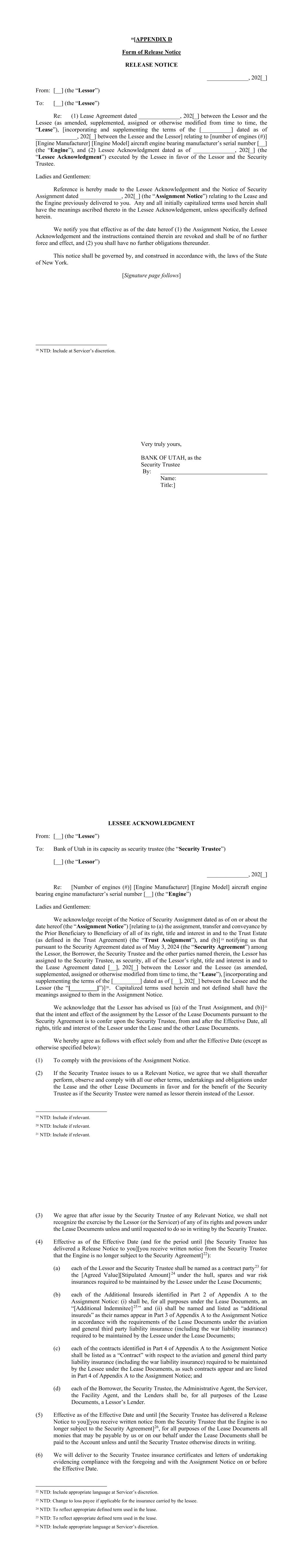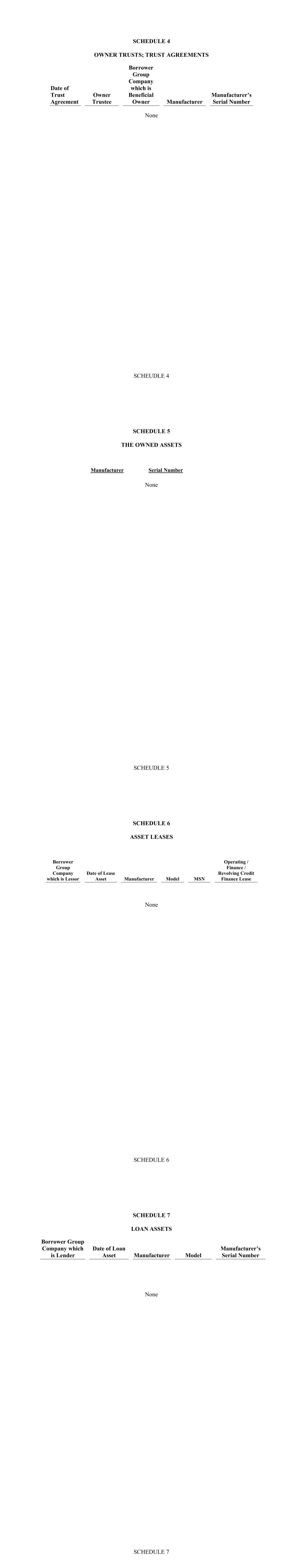 - 43 - option, warrant or other right to acquire any such shares of Stock of any Borrower Group Company. “Revolving Credit Finance Lease” means any lease or hire purchase contract which utilizes a revolving credit lease engine financing product structure that combines certain attributes of a revolving loan with those of an operating lease and therefore may be classified as Finance Leases. “S&P” means Standard & Poor’s Rating Services, a Standard & Poor’s Financial Services LLC business. “Sanctioned Jurisdiction” means any country or region subject to comprehensive sanctions issued by any Sanctions Authority broadly prohibiting dealings with such country or territory (currently including each of Cuba, Iran, North Korea, Syria, the Crimea region of Ukraine, the so-called Donetsk People’s Republic and the so-called Luhansk People’s Republic). “Sanctioned Person” means, at any time, any Person with whom dealings are restricted or prohibited under Sanctions, including: (a) any Person listed in any Sanctions-related list of designated Persons maintained by any Sanctions Authority, including, without limitation, the Specially Designated Nationals and Blocked Persons List maintained by OFAC; or (b) any Person 50% or more owned or controlled, directly or indirectly, by any Person or Persons described in paragraph (a) hereof. “Sanctions” means economic or financial sanctions or trade embargoes imposed, administered or enforced from time to time by any Sanctions Authority. “Sanctions Authority” means each of the following: (a) the U.S. government, including OFAC, the U.S. Department of State, and U.S. Department of Commerce; (b) the United Nations Security Council; (c) the European Union; and (d) His Majesty’s Treasury. “Scheduled Airframe Amortization Amount” means, for each Group 1 Asset or Group 2 Asset which is an Airframe, a scheduled amount notified to the Borrower on the Drawdown Date for the related Loan or Loans, based on straight line amortization to zero over a period equal to the lower of (i) 25 years minus the age of such Airframe on such Drawdown Date and (ii) 14 years (in the case of Group 1 Assets) or ten years (in the case of Group 2 Assets). “Scheduled Cash Sweep Amount” means, on each Payment Date which occurs during the Term Period beginning on: - 44 - (a) the Business Day immediately following the Commitment Termination Date, an aggregate amount equal to 25% of the Surplus Amount (if any); (b) the Business Day immediately following the first anniversary of the Commitment Termination Date, an aggregate amount equal to 50% of the Surplus Amount (if any); and (c) the Business Day immediately following the second anniversary of the Commitment Termination Date, and which ends on the Final Repayment Date, in an aggregate amount equal to 100% of the Surplus Amount (if any). “Secured Parties” means the Administrative Agent, the Facility Agent, the Security Trustee, the Lenders and the Hedging Providers. “Secured Party Representatives” means, collectively, the Security Trustee, the Administrative Agent and the Facility Agent. “Securities Act” means the Securities Act of 1933, as amended. “Security Agreement” means the security agreement, dated as of the date hereof, between each of the Grantors party thereto and the Security Trustee. “Security Deposit Additional Amount” shall mean, as of any date, an amount necessary to cause the balance of the Security Deposit Reserve Account to equal the Security Deposit Required Amount. “Security Deposit Required Amount” means, with respect to any Payment Date (for the purposes of this definition only, the “Relevant Payment Date”), an amount equal to the greater of: (a) an amount equal to the lesser of (i) $1,000,000 and (ii) the then-outstanding aggregate principal amount of the Loans; and (b) an aggregate amount equal to the sum of (i) [*]% of the Remaining Security Deposits relating to Leases expected to expire during the period from the Relevant Payment Date to but excluding the first Payment Date succeeding the Relevant Payment Date, plus (ii) [*]% of the Remaining Security Deposits relating to Leases expected to expire during the period from the first Payment Date succeeding the Relevant Payment Date to but excluding the second Payment Date succeeding the Relevant Payment Date, plus (iii) [*]% of the Remaining Security Deposits relating to Leases expected to expire during the period from the second Payment Date succeeding the Relevant Payment Date to but excluding the third Payment Date succeeding the Relevant Payment Date, plus (iv) [*]% of the Remaining Security Deposits relating to Leases expected to expire during the period from the third Payment Date succeeding the Relevant Payment Date to but excluding the fourth Payment Date succeeding the Relevant Payment Date. “Security Deposit Reserve Account” means the account of the Borrower described as such in schedule 3 of the Security Agreement. - 45 - “Security Deposits” means any amounts described as security deposits, supplemental rent or such other similar term, however described or defined pursuant an Asset Lease or Loan Asset which are required to be provided to a Borrower Group Company or Asset Owning Entity by an Asset Lessee or Loan Asset Borrower as security for such Person’s obligations thereunder (but shall not include Usage Fees). “Security Documents” means the Security Agreement, each FAA Lease Assignment and Mortgage, the Borrower Pledge, each Account Control Agreement, each Borrower Group Pledge, each Local Law Account Charge and all other security documents hereafter delivered to the Security Trustee granting a Lien on any property of any Person to secure the obligations and liabilities of any Borrower Group Company under any Loan Document. “Security Trustee Expenses” means any fees, reasonable out-of-pocket costs and expenses, losses, indemnities or other amounts owing to the Security Truste