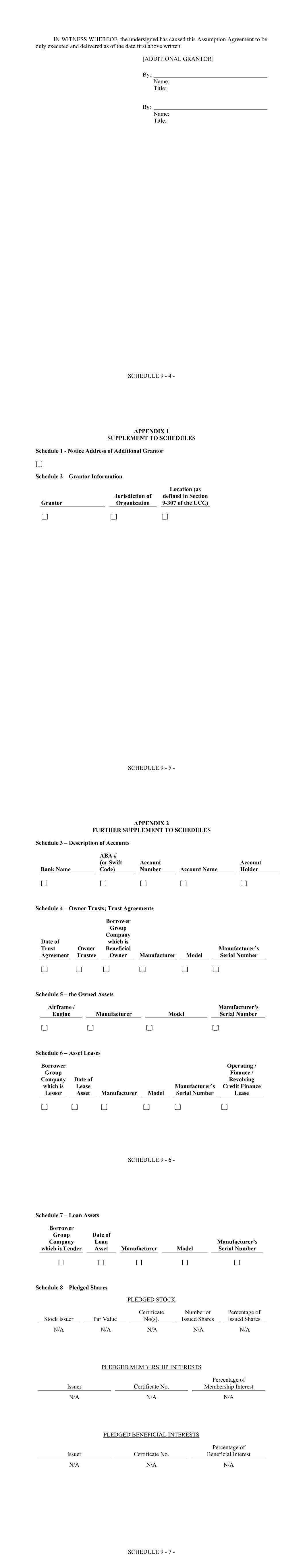 Schedule IX -4- Part B – Loan Assets 1. Minimum Provisions in respect of Loan Assets: Each Loan Asset shall be consistent with the following provisions set forth in this Part B. 2. Minimum Provisions in respect of Leases: If a Loan Asset includes a lease from an Obligor, such Lease shall have terms consistent with the Minimum Provisions set forth in Part A. 3. Governing Law 3.1 Such Loan Asset shall be governed by the laws of: 3.1.1 the State of New York; or 3.1.2 England and Wales. 4. Loan Asset Payments The Loan Asset Payments under the Loan Asset shall be payable in: 4.1 Dollars; 4.2 Euros (provided that, to the extent that the “Euro-denominated and unhedged” category of the Concentration Limits is exceeded or would be exceeded following Applicable Drawdown Date and the Required Lenders have not otherwise provided a waiver, the Borrower shall enter into a derivatives agreement not later than ten Business Days following the Applicable Drawdown Date with respect to any Euro- denominated Assets above the “Euro-denominated and unhedged” category of the Concentration Limits); or 4.3 such other currency agreed in writing by the Administrative Agent (acting on the instructions of the Required Lenders (acting reasonably)). 5. Assignment The Loan Asset Documents shall contain provisions prohibiting the assignment by the relevant Loan Asset Borrower of any benefits or obligations under the Loan Asset Documents or with respect to the Underlying Asset or any Part to any person without the consent of the Borrower Group Company acting as lender thereunder in accordance with, and subject to such exceptions as are consistent with, the Standard of Care. 6. Sole Lender A Borrower Group Company must be the sole lender under the Loan Asset, holding 100% of the interest in such Loan Asset. Schedule IX -5- 7. Disposition The Loan Asset Documents shall contain provisions requiring that the relevant Obligor prepay the Loan Asset upon effecting a sale or other disposition of the relevant Asset, plus any applicable premium, other than where the Loan Asset Documents permit replacement collateral, consistent with the Standard of Care. 8. Security The Loan Asset Documents shall require a customary security package (including requirements to register International Interests and assignments thereof) as applicable for the relevant Asset and transaction, as determined in accordance with the Standard of Care. Schedule X-1 SCHEDULE X INSURANCE PROVISIONS Owned Asset Type Model Liability Insurance Amount* Engines [*] [*] US $[*] million [*] [*] [*] [*] US $[*] million [*] [*] [*] [*] US $[*] million Airframes [*] US $[*] million [*] [*] US $[*] million * The applicable amount for each Engine operated on an aircraft that is, or Airframe that is, a non- passenger (cargo) aircraft is [*]% of the amount set forth above. During periods while an Owned Asset is off-lease or not being operated in commercial revenue service, the limit described above will not be applicable, but the applicable limit will be the amount substantially consistent with the customary practices of leading international aircraft or Aircraft Engine (as applicable) operating lessors (which so long as the Servicer is WLFC, shall be deemed to be the customary practice of WLFC) regarding similar aircraft or Aircraft Engines, as applicable, owned or managed by it or its Affiliates. Schedule XI-1 SCHEDULE XI FORM OF MONTHLY REPORT [To be attached]