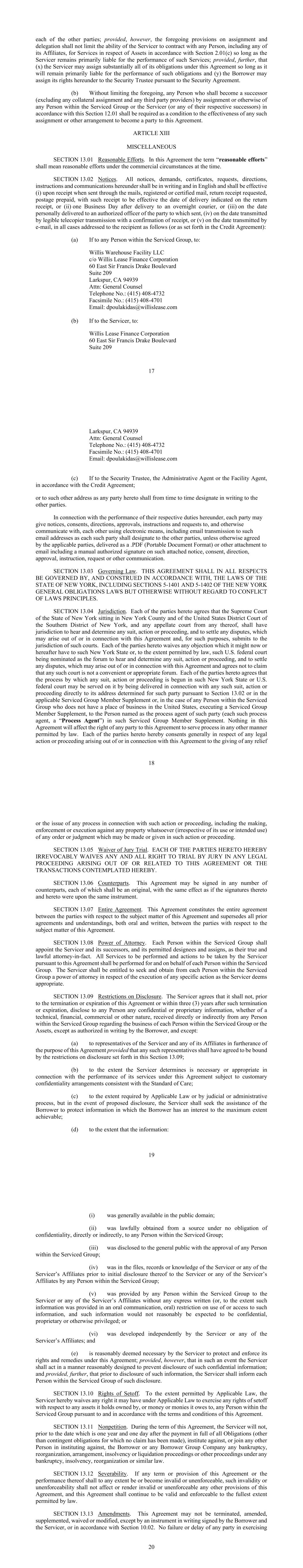 - 119 - (ii) for any indirect, consequential, punitive or special damages, regardless of the form of action and whether or not any such damages were foreseeable or contemplated; (iii) for the acts or omissions of its nominees, correspondents, designees, agents, subagents or subcustodians appointed by it with due care; (iv) for the investment or reinvestment of any cash held by it hereunder, in each case in good faith, in accordance with the terms hereof, including any liability for any delays in the investment or reinvestment of the Collateral, or any loss of interest or income incident to any such delays; or (v) for an amount in excess of the value of the Collateral, valued as of the date of deposit, but only to the extent of direct money damages, and in each case only if caused by the Security Trustee’s gross negligence or willful misconduct. (h) Neither the Security Trustee nor the Administrative Agent shall incur any liability for not performing any act or fulfilling any duty, obligation or responsibility hereunder by reason of any occurrence beyond the control of the Security Trustee or the Administrative Agent (as applicable) (including but not limited to any act or provision of any present or future law or regulation or governmental authority, any act of God or war, civil unrest, local or national disturbance or disaster, any act of terrorism, or the unavailability of the Federal Reserve Bank wire or facsimile or other wire or communication facility). (i) The Security Trustee shall not be responsible in any respect for the form, execution, validity, value or genuineness of documents or securities deposited under any Loan Document, or for any description therein, or for the identity or authority of Persons executing or delivering or purporting to execute or deliver any such document, security or endorsement. The Security Trustee shall not be called upon to advise any party as to the wisdom in selling or retaining or taking or refraining from any action with respect to any securities or other property deposited under any Loan Document. (j) The Security Trustee shall not be under any duty to give the Collateral held by it under the Loan Documents any greater degree of care than it gives its own similar property and shall not be required to invest any funds held by it except as directed in accordance with any Account Control Agreement and the Security Agreement. Uninvested funds held by the Security Trustee shall not earn or accrue interest, and the Security Trustee shall incur no liability for any investment losses. (k) In the event of any ambiguity or uncertainty hereunder or in any notice, instruction or other communication received by the Security Trustee under any Loan Document, the Security Trustee may, in its sole discretion, refrain from taking any action other than to retain possession of the Collateral, unless the Security Trustee receives written instructions, signed by the Administrative Agent, which eliminate such ambiguity or uncertainty. (l) In the event of any dispute between or conflicting claims among the Borrower, the Administrative Agent and any other Person or entity with respect to any Collateral, the Security Trustee shall be entitled, in its sole discretion, to refuse to comply with any and all - 120 - claims, demands or instructions with respect to such Collateral so long as such dispute or conflict shall continue, and the Security Trustee shall not be or become liable in any way for failure or refusal to comply with such conflicting claims, demands or instructions. The Security Trustee shall be entitled to refuse to act until, in its sole discretion, either: (i) such conflicting or adverse claims or demands shall have been determined by a final order, judgment or decree of a court of competent jurisdiction, which order, judgment or decree is not subject to appeal, or settled by agreement between the conflicting parties as evidenced in a writing satisfactory to the Security Trustee; or (ii) the Security Trustee shall have received security or an indemnity satisfactory to it sufficient to hold it harmless from and against any and all losses (including by way of liability to the other Secured Parties) which it may incur by reason of so acting. Any court order, judgment or decree shall be accompanied by a legal opinion by counsel for the presenting party, satisfactory to the Security Trustee, to the effect that said order, judgment or decree represents a final adjudication of the rights of the parties by a court of competent jurisdiction, and that the time for appeal from such order, judgment or decree has expired without an appeal having been filed with such court. The Security Trustee shall be entitled to act on such court order and legal opinions without further question. The Security Trustee may, in addition, elect, in its sole discretion, to commence an interpleader action or seek other judicial relief or orders as it may deem, in its sole discretion, necessary. The costs and expenses (including reasonable attorneys’ fees and expenses) incurred in connection with such proceeding and any legal opinions shall be paid by the Borrower. ARTICLE XII MISCELLANEOUS Section 12.01. Notices. (a) Except in the case of notices and other communications expressly permitted to be given by telephone (and subject to paragraph (b) of this Section), all notices and other communications provided for herein shall be in writing and shall be delivered by hand or overnight courier service, mailed by certified or registered mail or sent by email, as follows: (i) If to the Borrower or any of its Subsidiaries, to it: c/o Willis Lease Finance Corporation 60 East Sir Francis Drake Boulevard Suite 209 Larkspur, CA 94939 Attn: General Counsel Telephone No.: (415) 408-4732 Facsimile No.: (415) 408-4701 Email: dpoulakidas@willislease.com - 121 - (ii) if to the Facility Agent, to Bank of America, N.A. One Bryant Park Attn: Bradley Sohl New York, NY 10036 Telephone: (646) 855-2050 E-mail: 